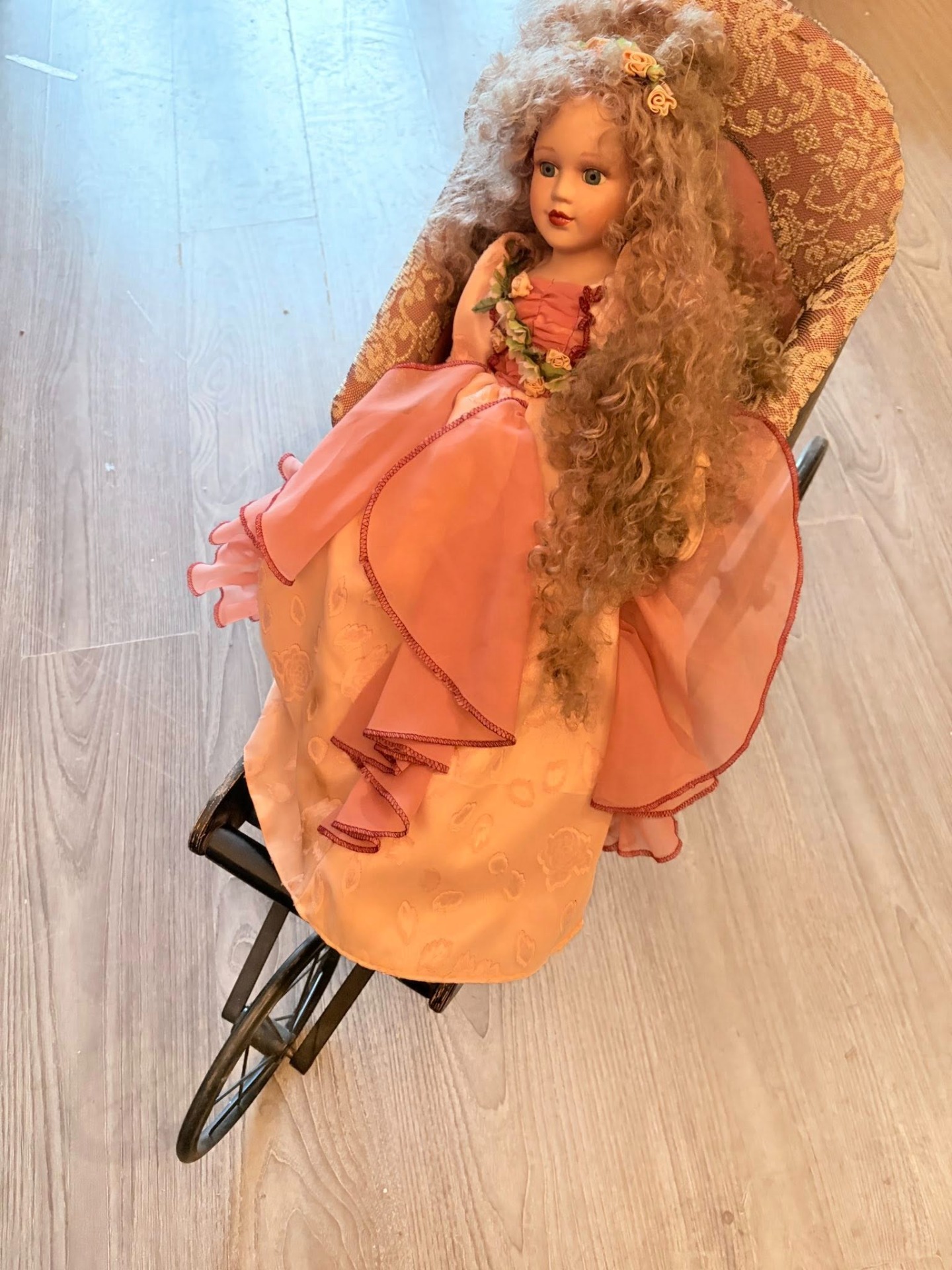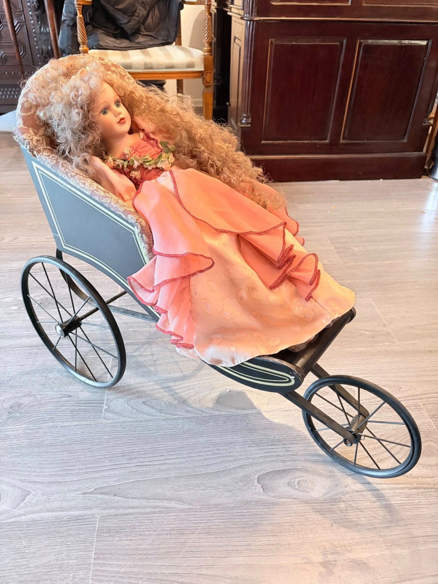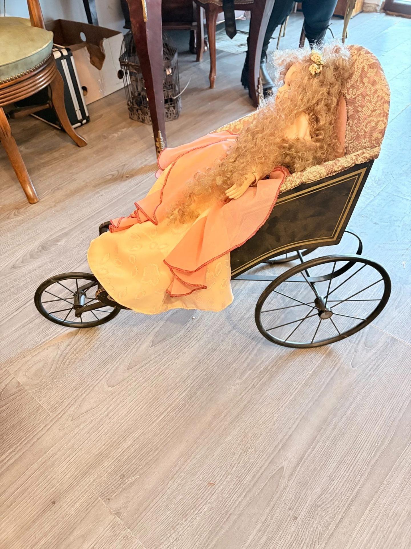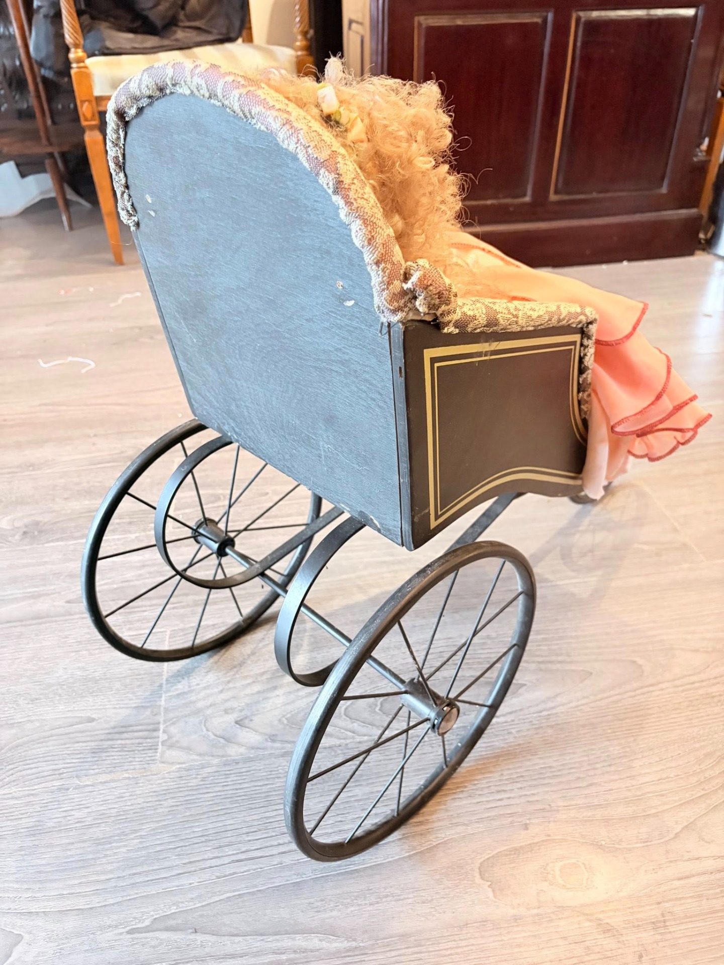 Papusa de portelan in carucior, jucarie vintage cca 1940, Germania.