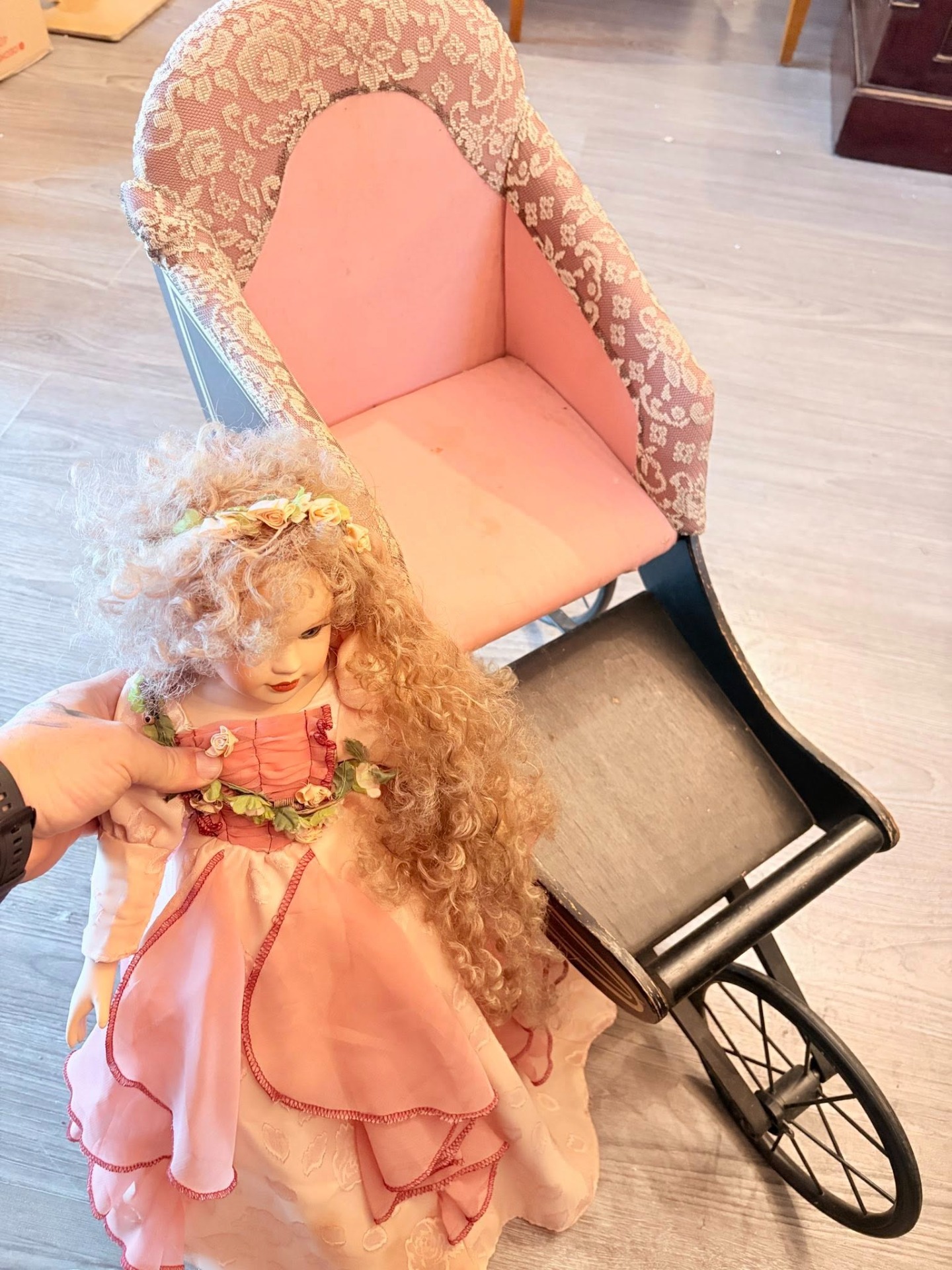 papusa de portelan in carucior, jucarie vintage cca 1940, Germania.