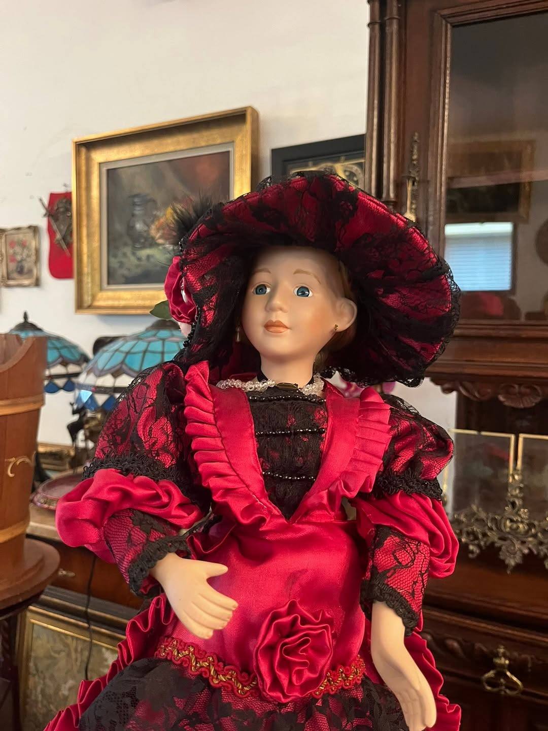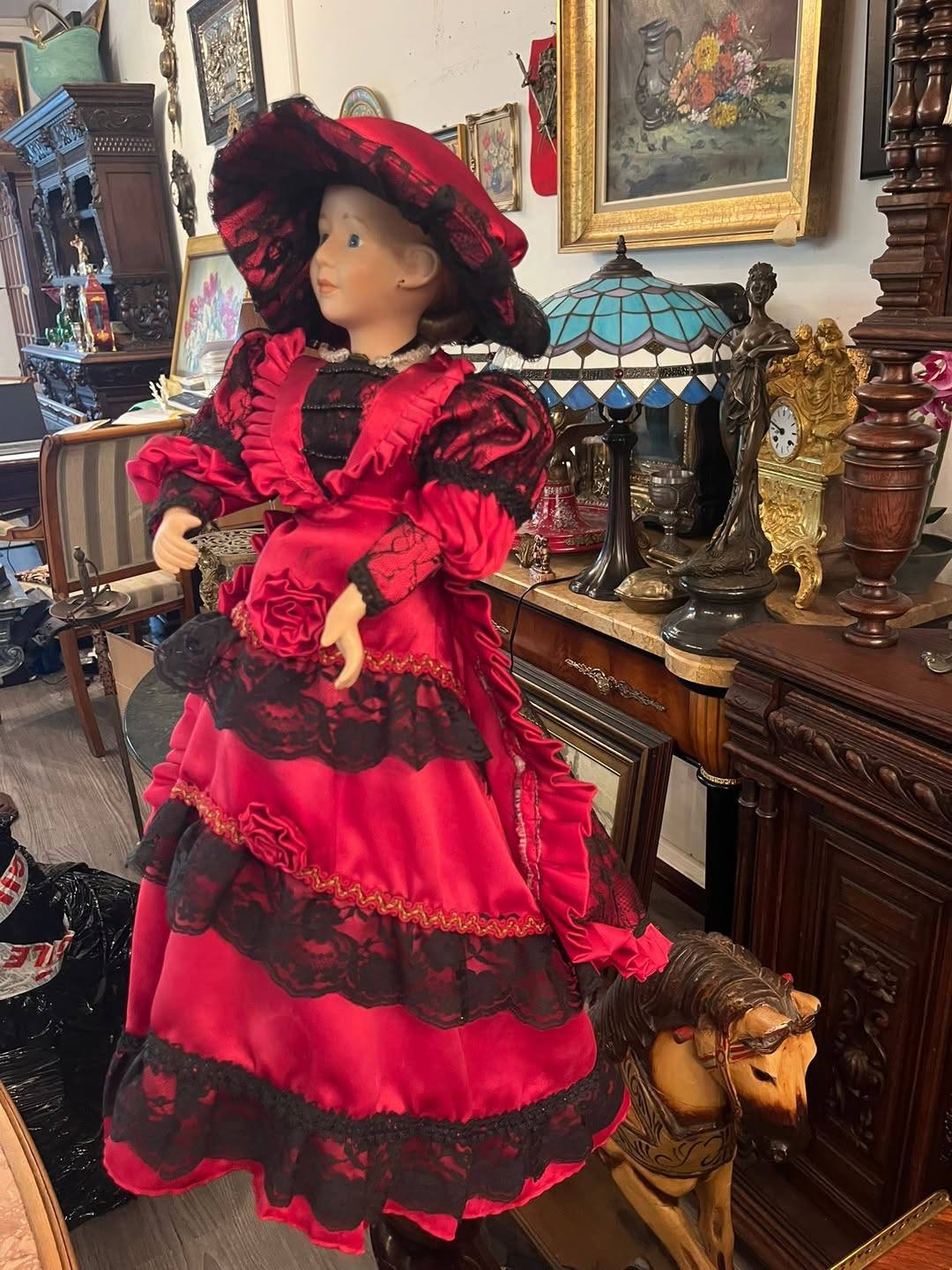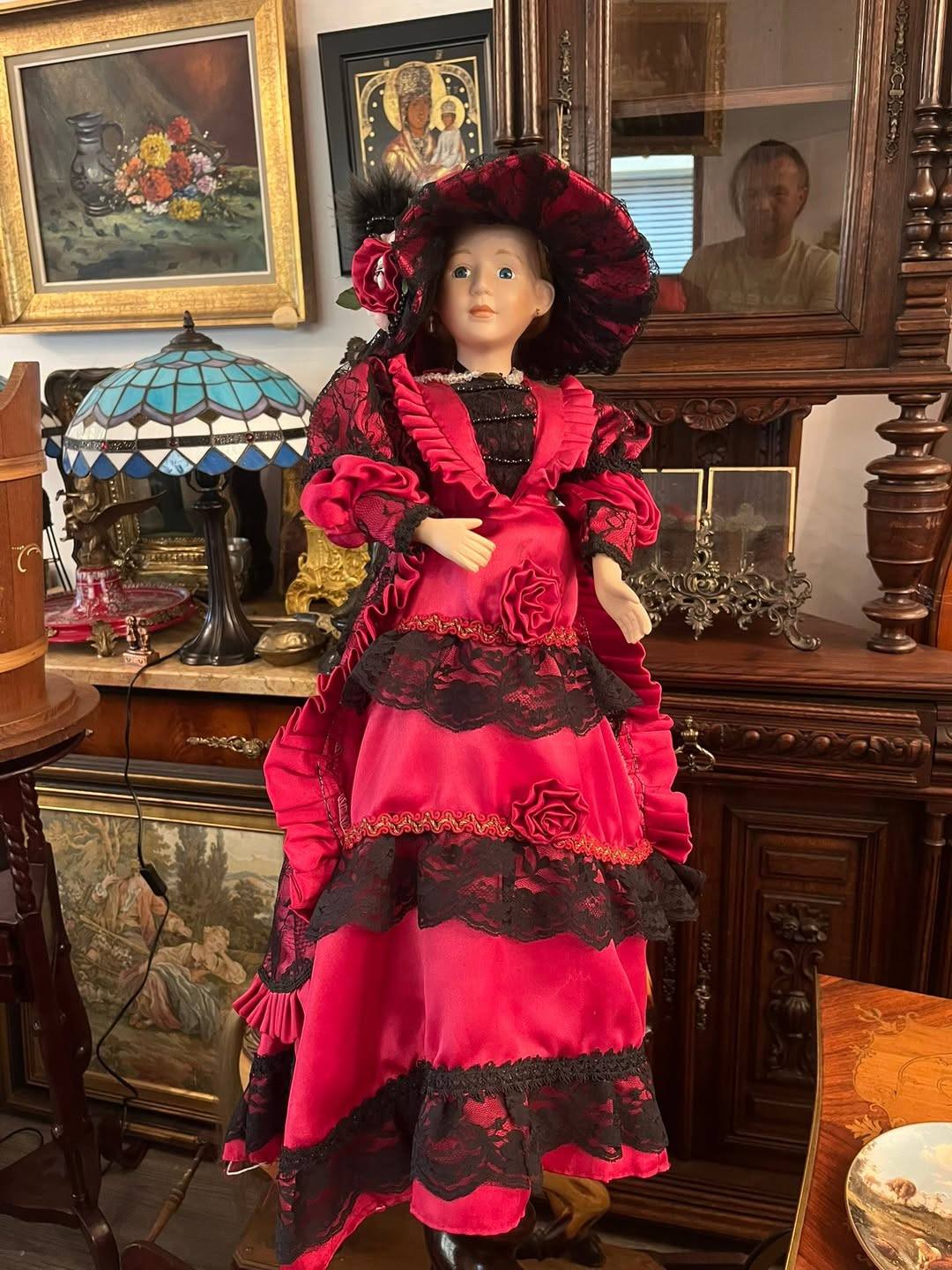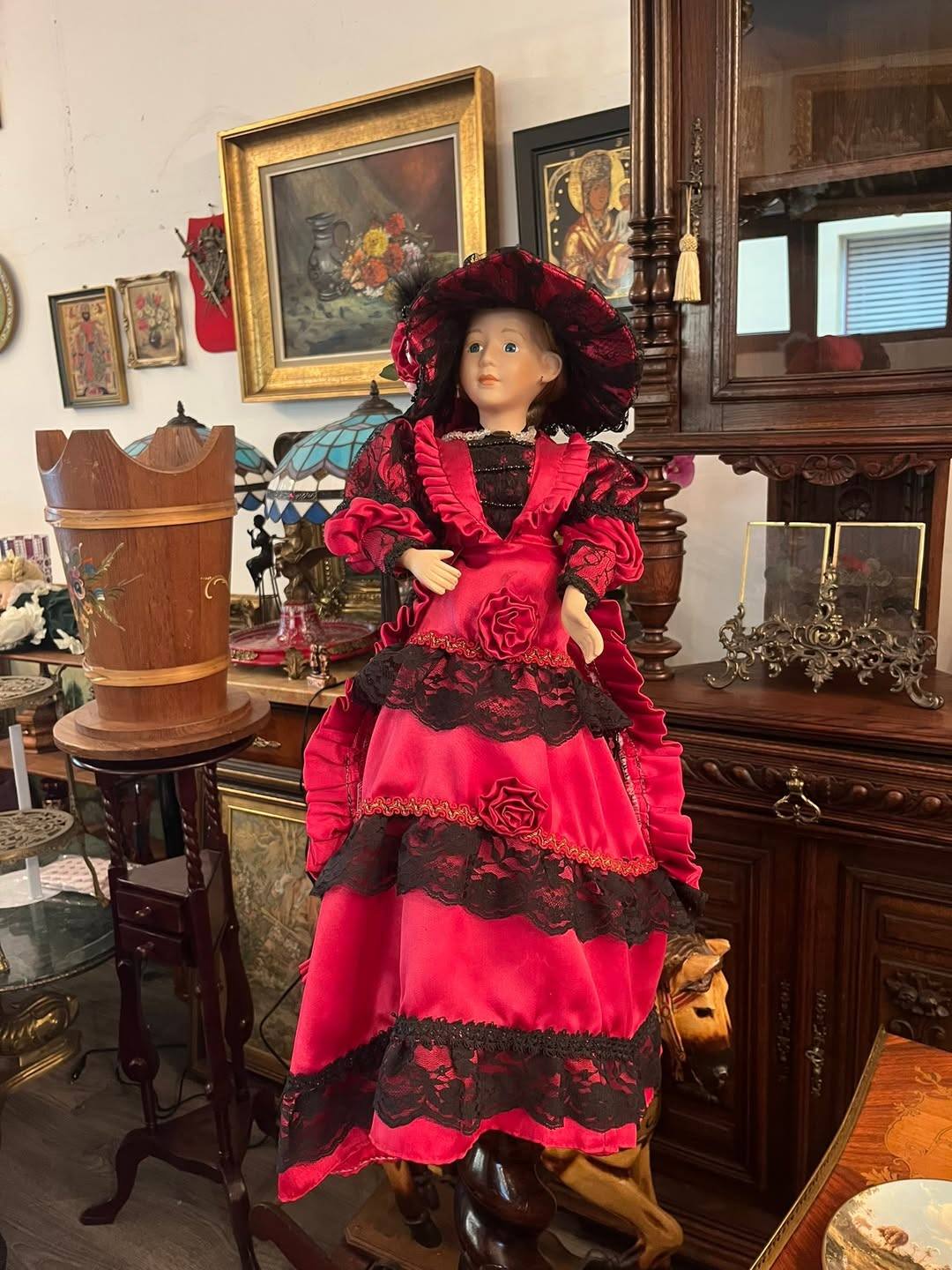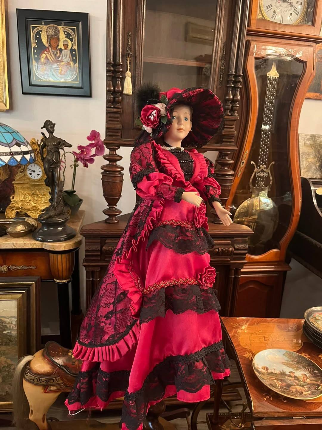 -decorativă vintage, îmbrăcată într-o rochie stil victorian, realizată cu mare atenție la detalii. Ținuta este din satin roșu intens,