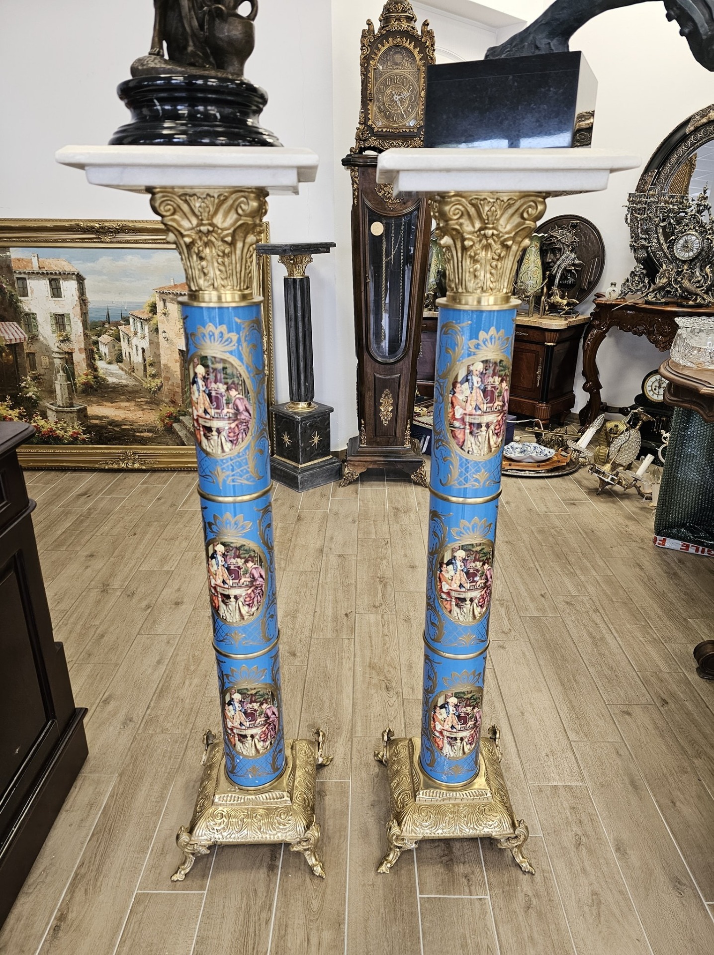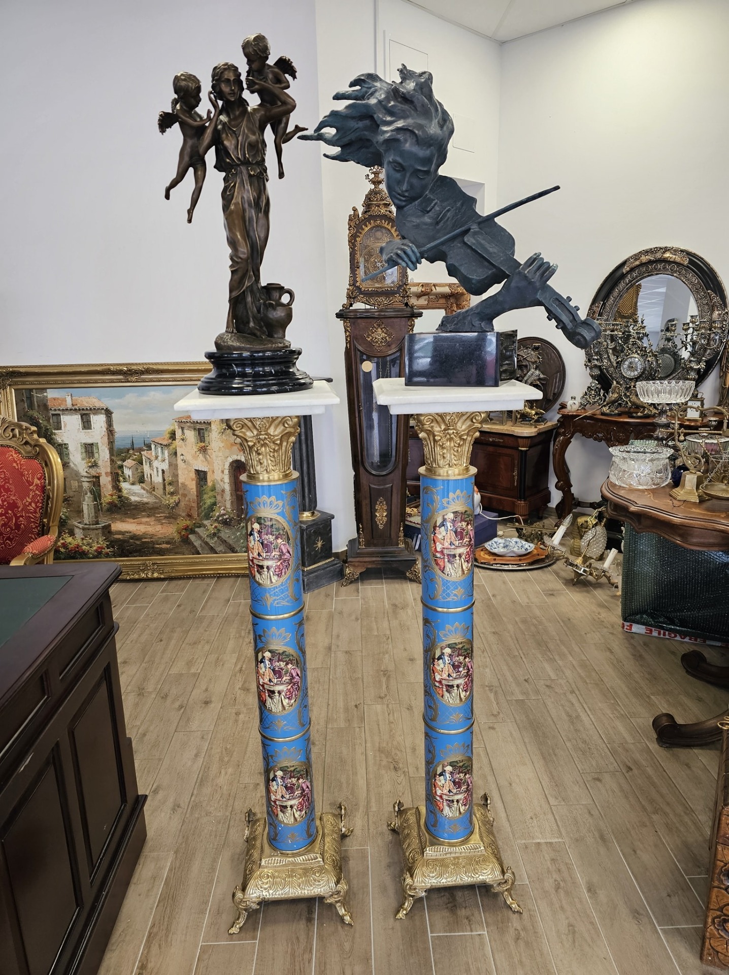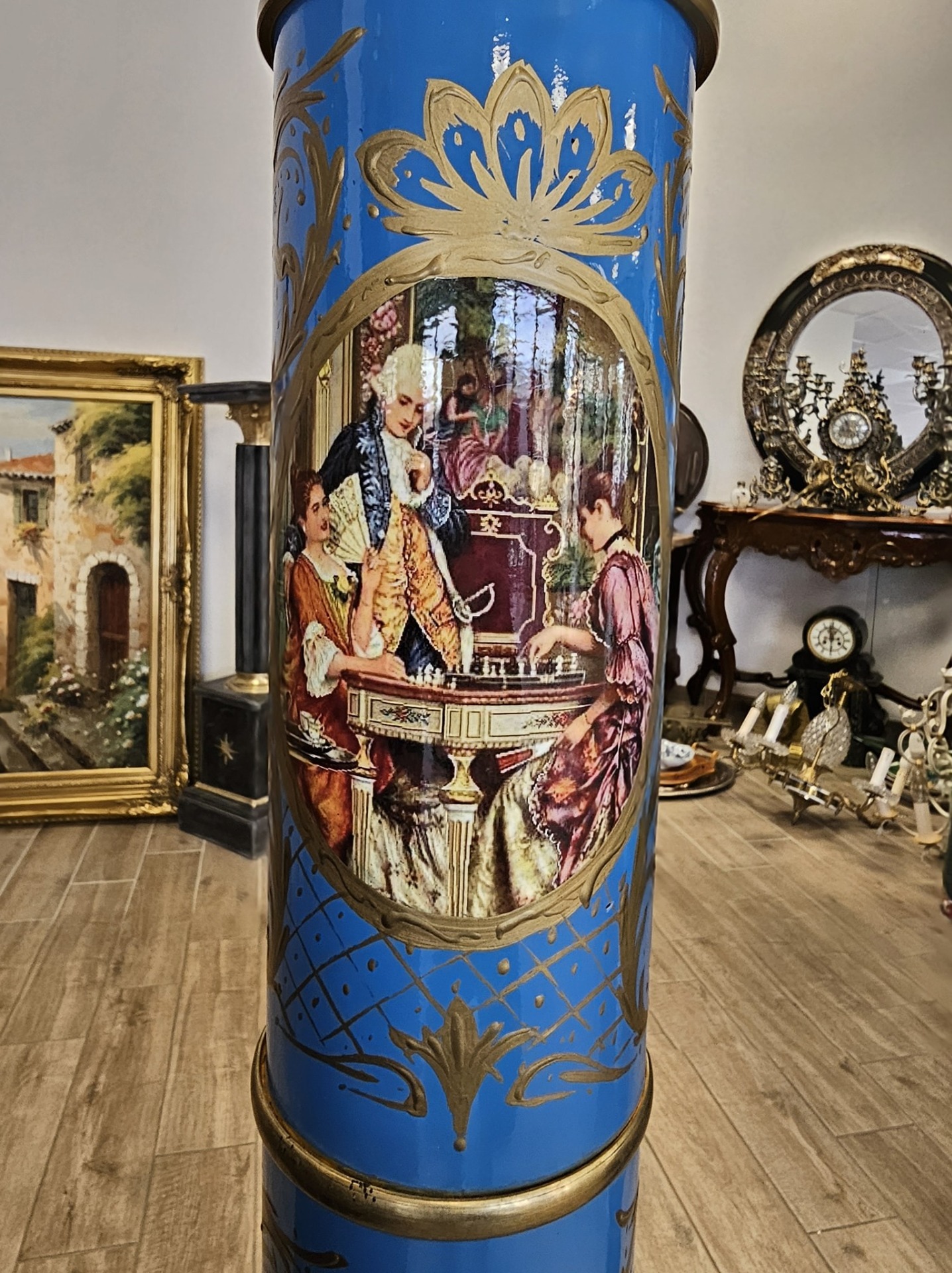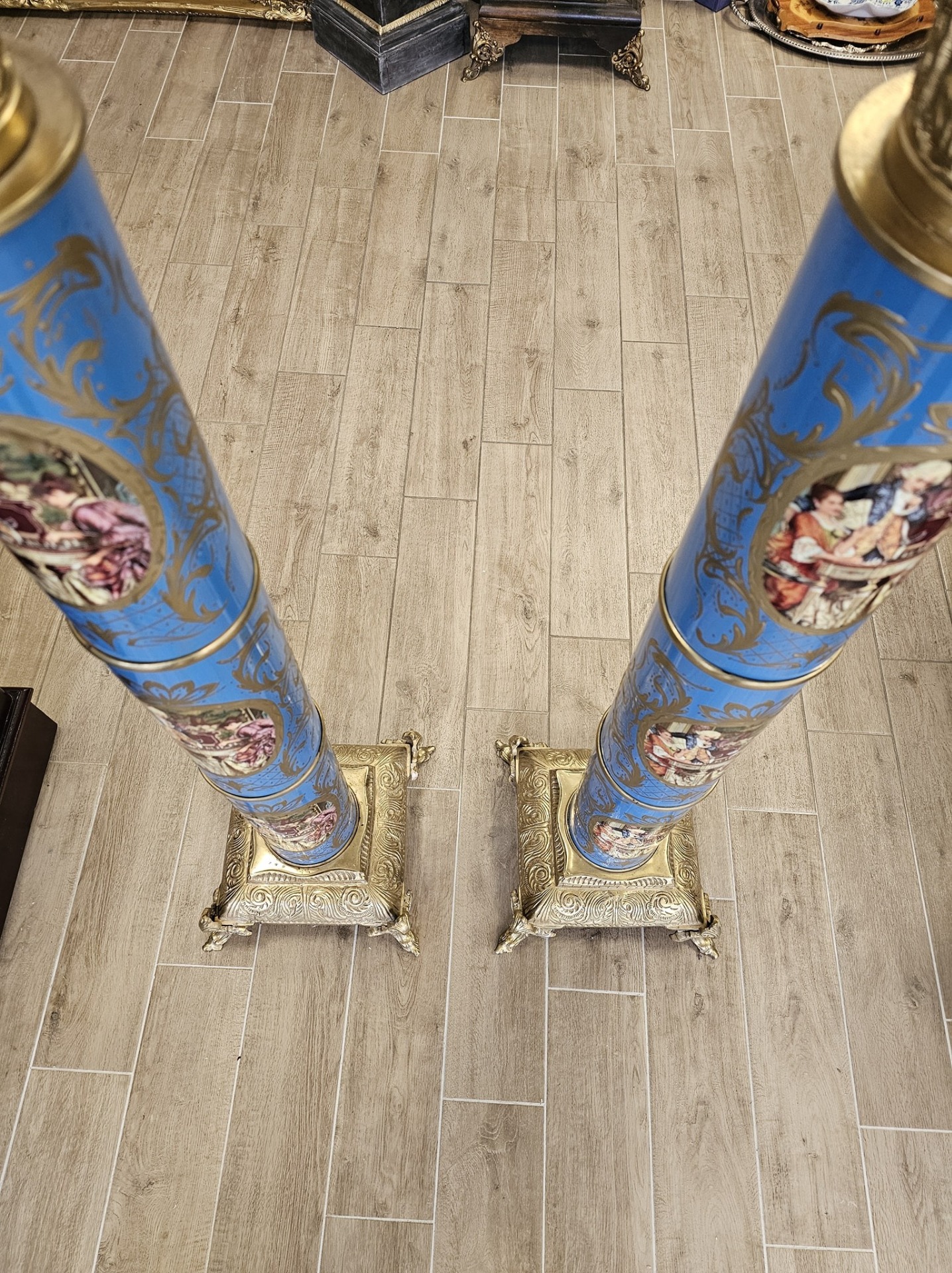 Pereche elegantă de coloane decorative realizate în stilul Sevres, cu un design rafinat și detalii bogate. Fiecare coloană are corpul decorat cu scene romantice pictate manual și accente aurii, completate de elemente din bronz aurit fin lucrate.