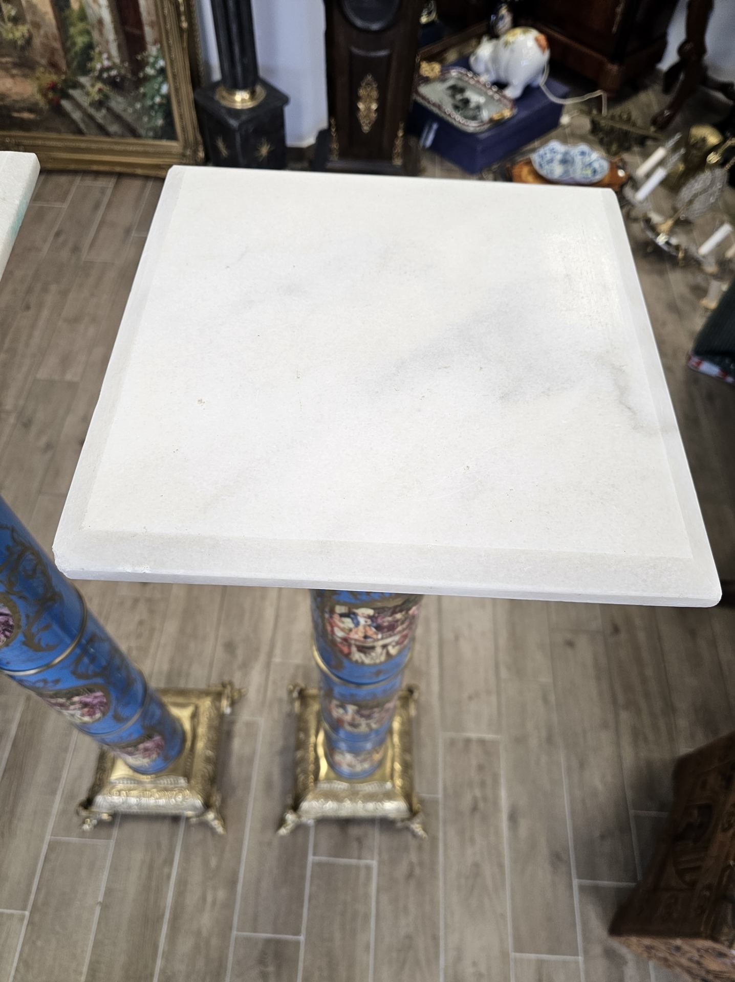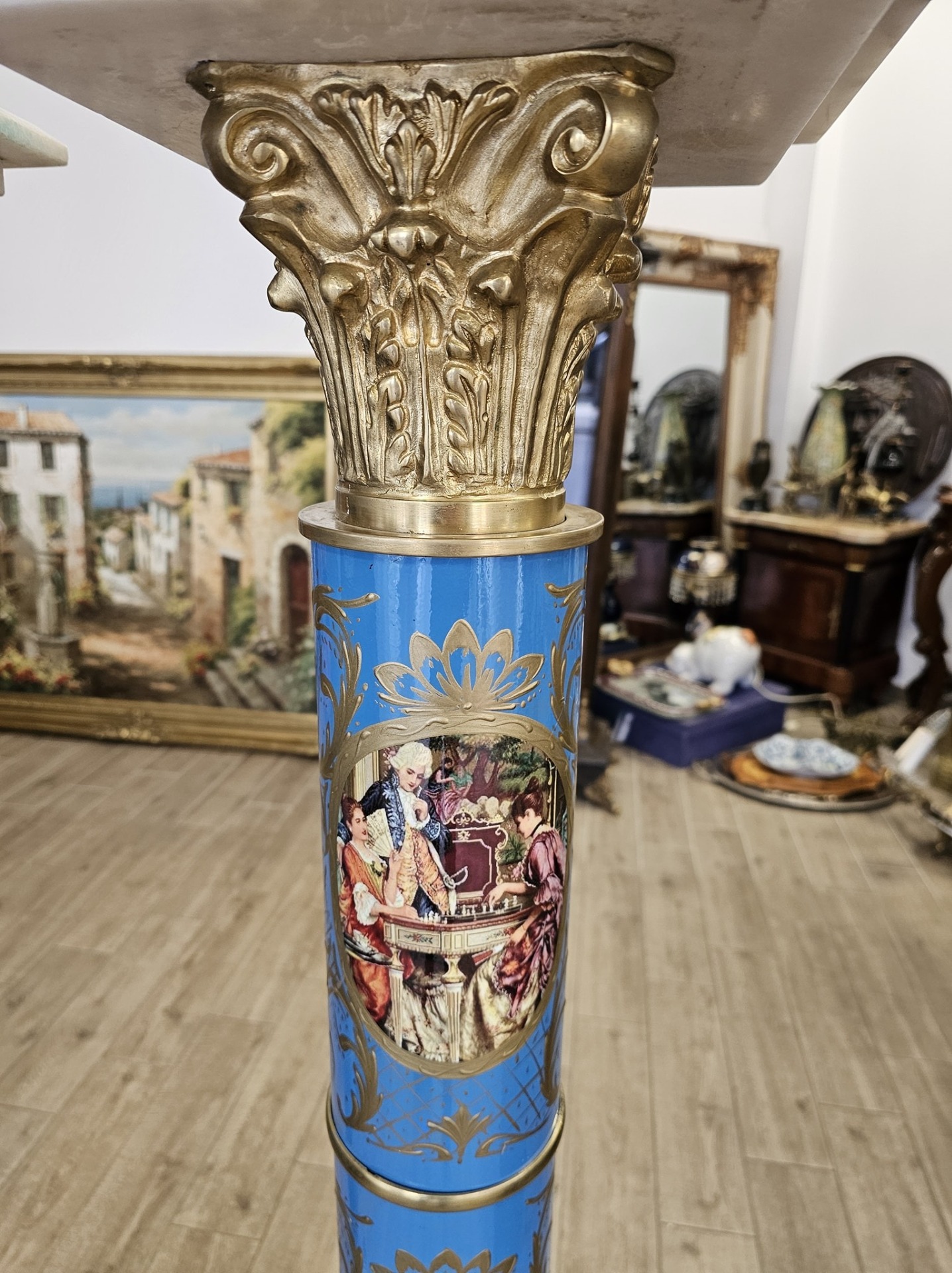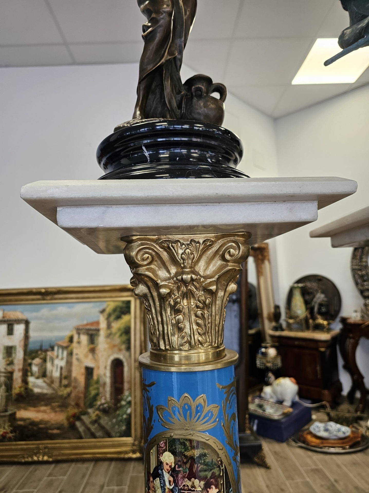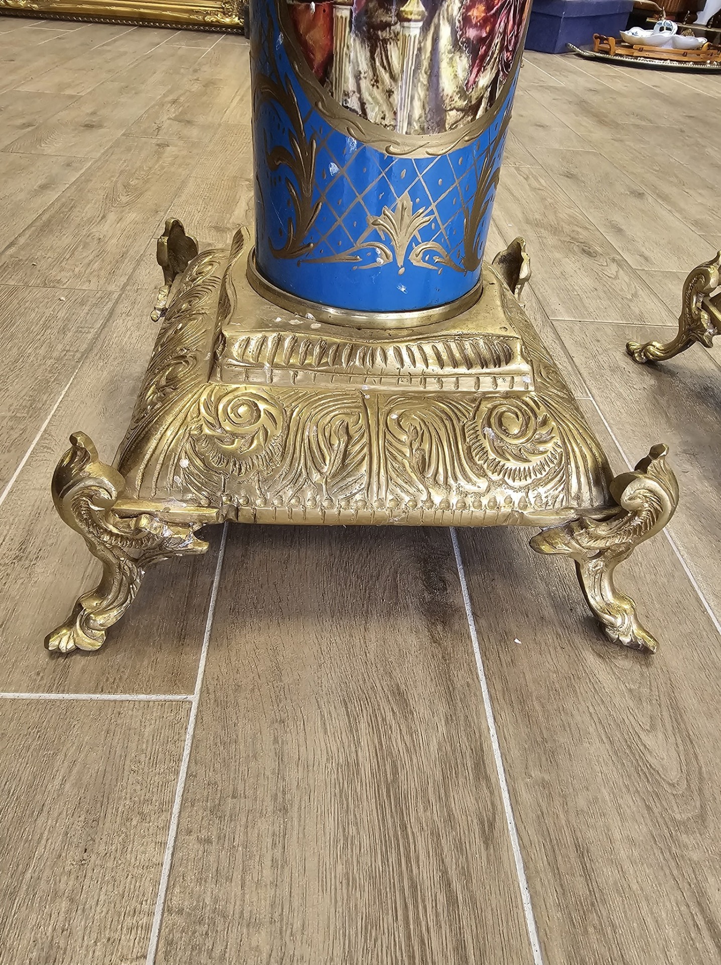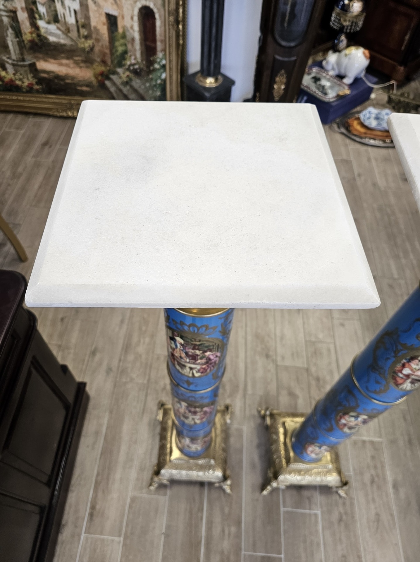Pereche elegantă de coloane decorative realizate în stilul Sevres, cu un design rafinat și detalii bogate. Fiecare coloană are corpul decorat cu scene romantice pictate manual și accente aurii, completate de elemente din bronz aurit fin lucrate.