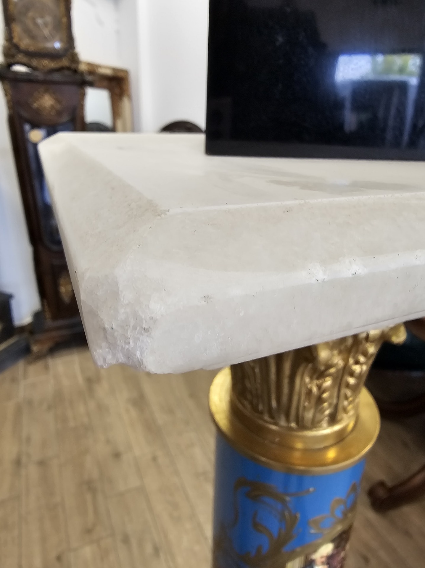 Capitelurile sunt în stil corintic, bogat ornamentate, iar baza masivă, de asemenea din bronz aurit, are picioare sculptate. Partea superioară este din marmură albă, potrivită pentru expunerea de statuete, vaze sau alte obiecte de artă.