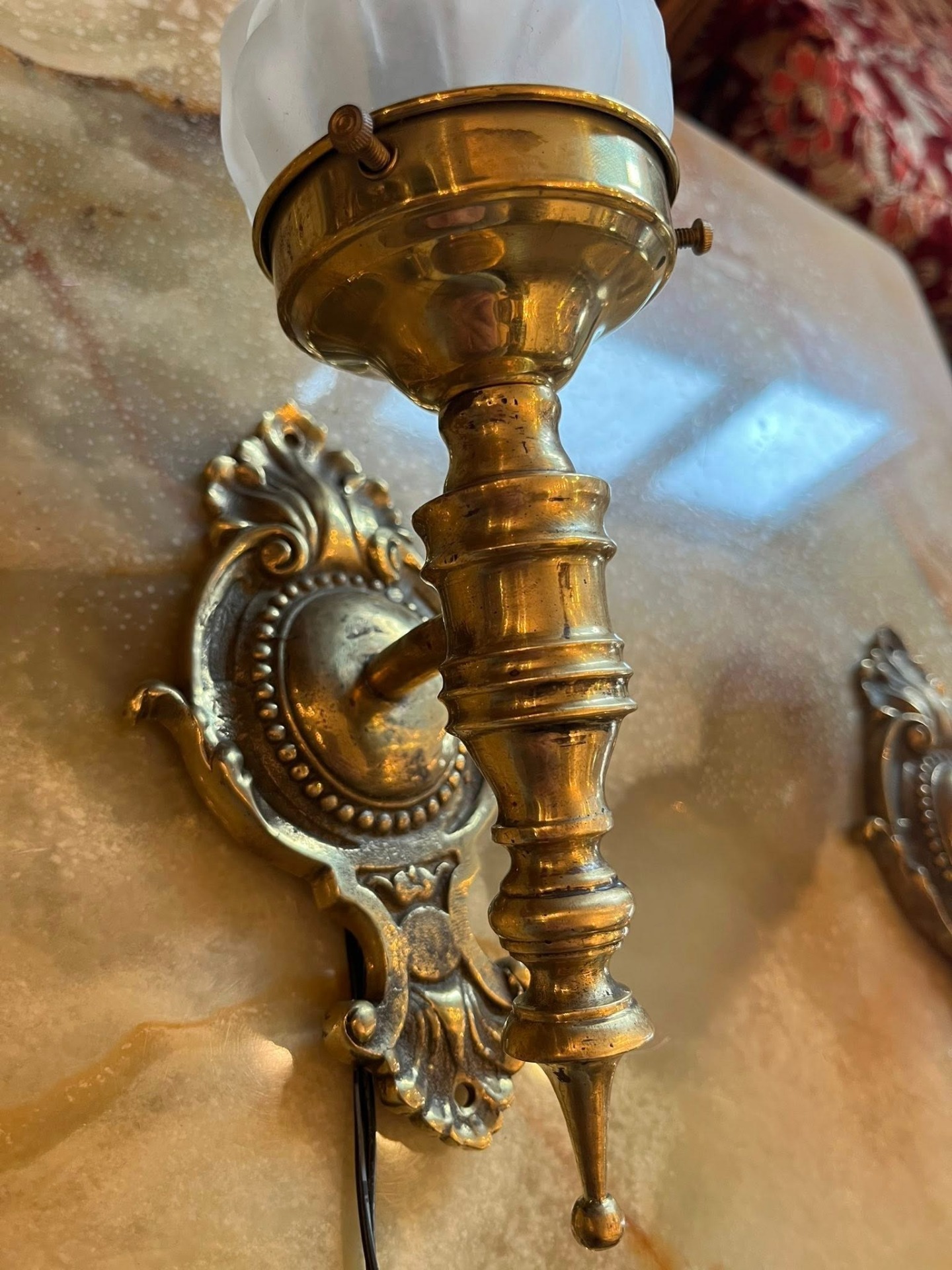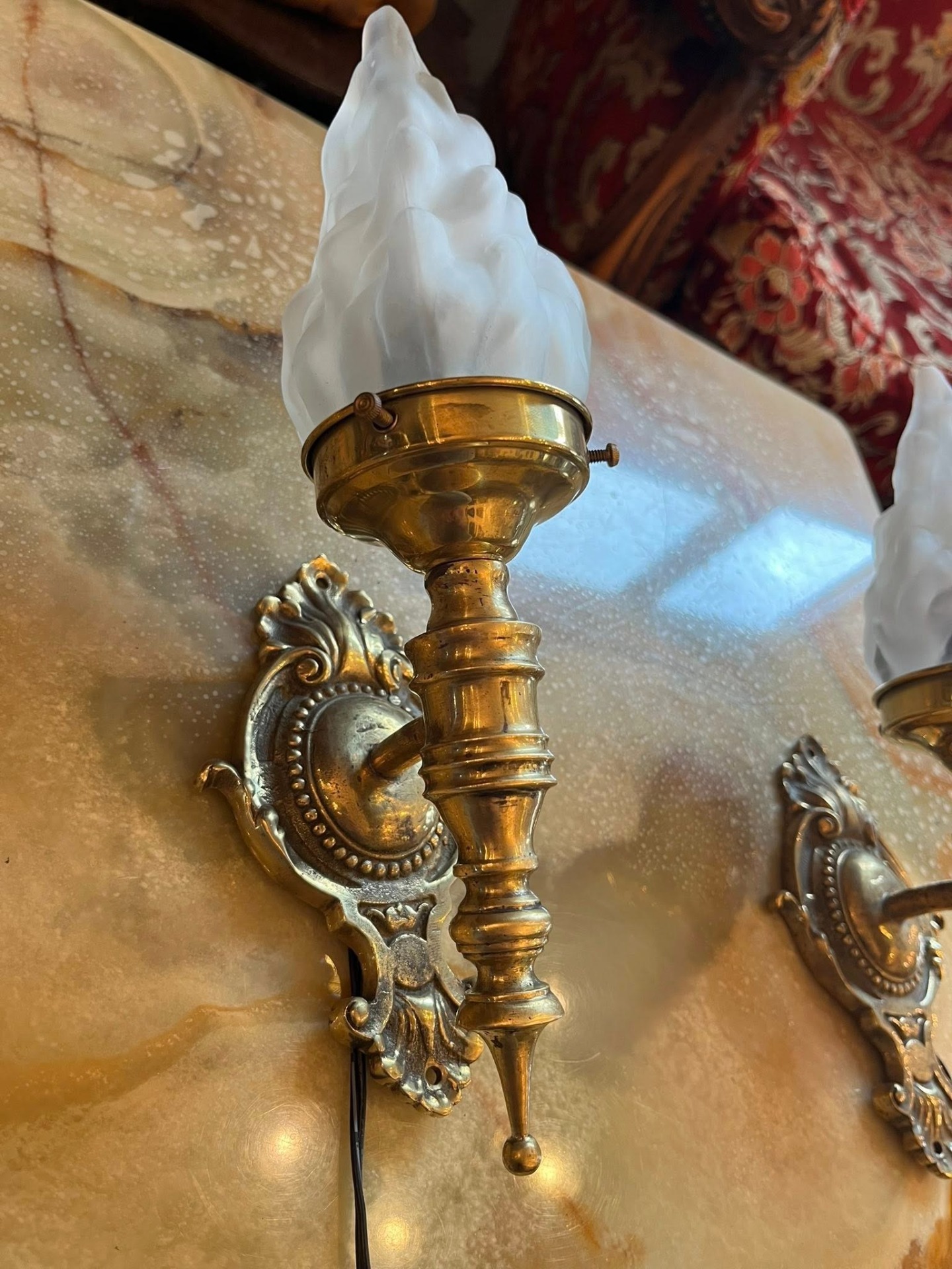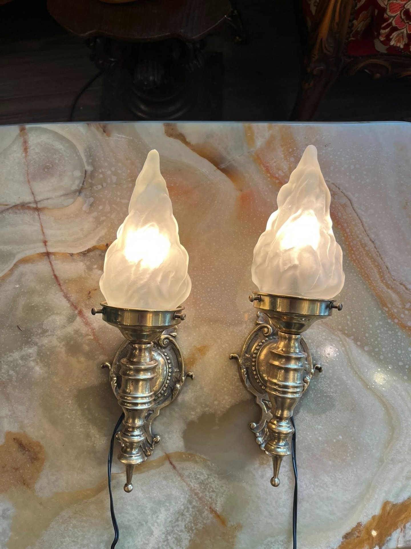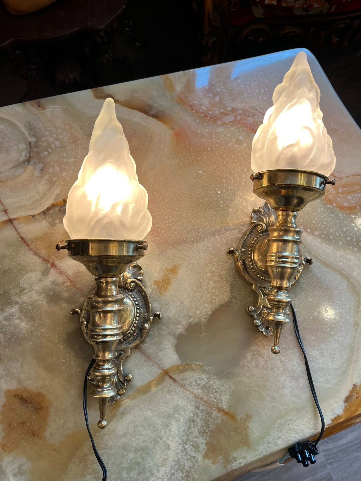 Pereche de Aplice „Flacăra Imperială” – Eleganță Neoclasică în Alamă și Sticlă Satinată.