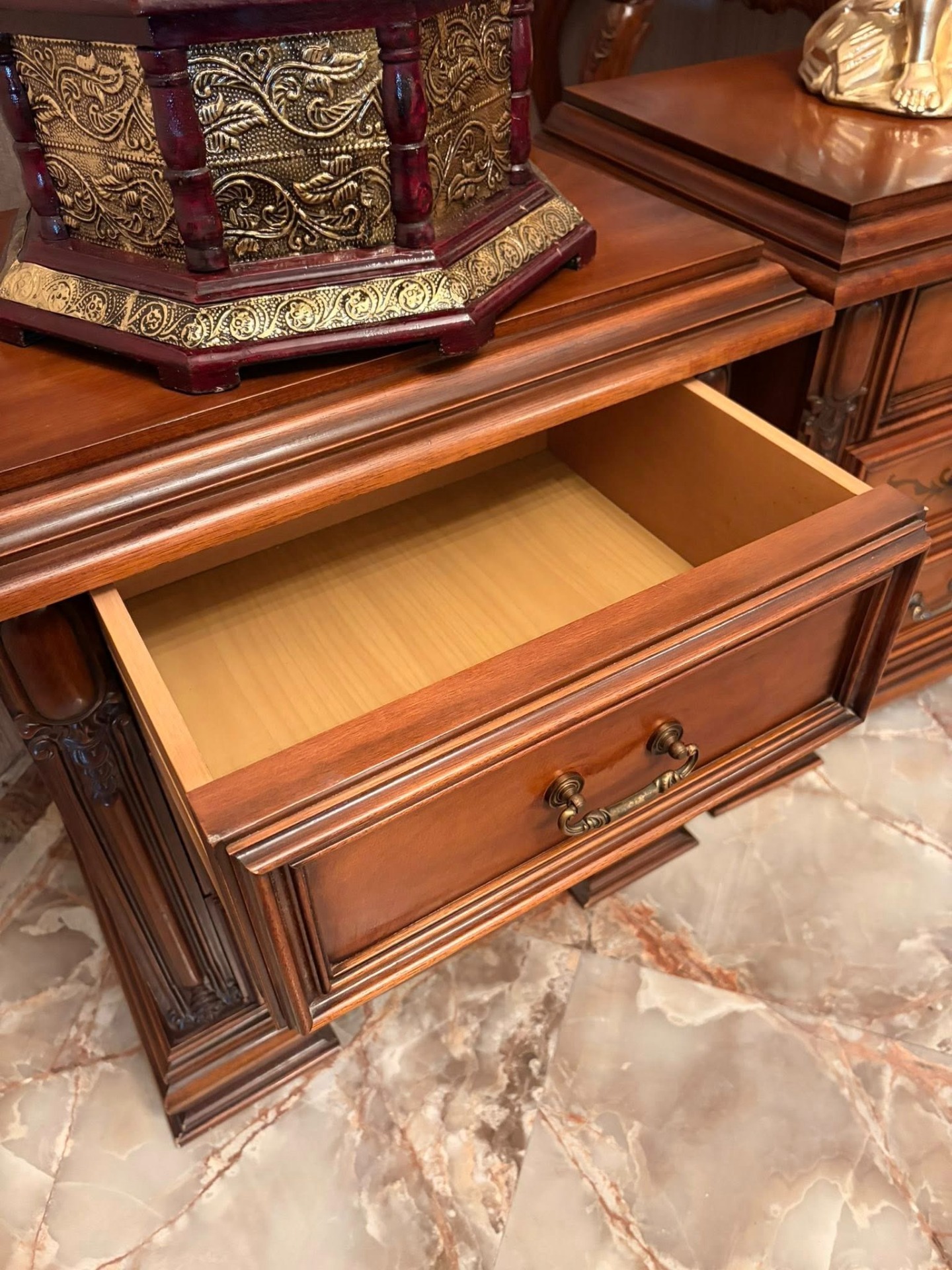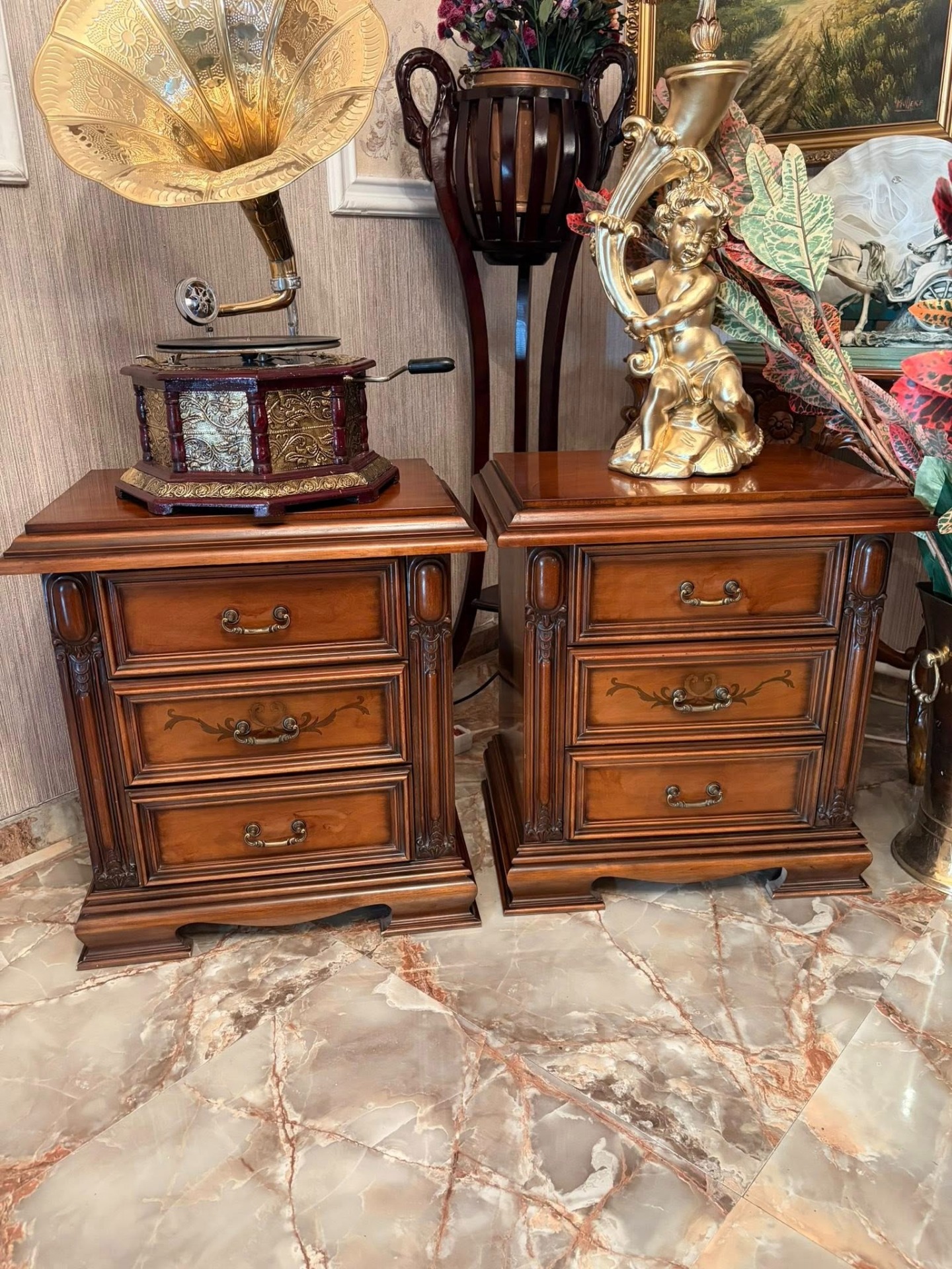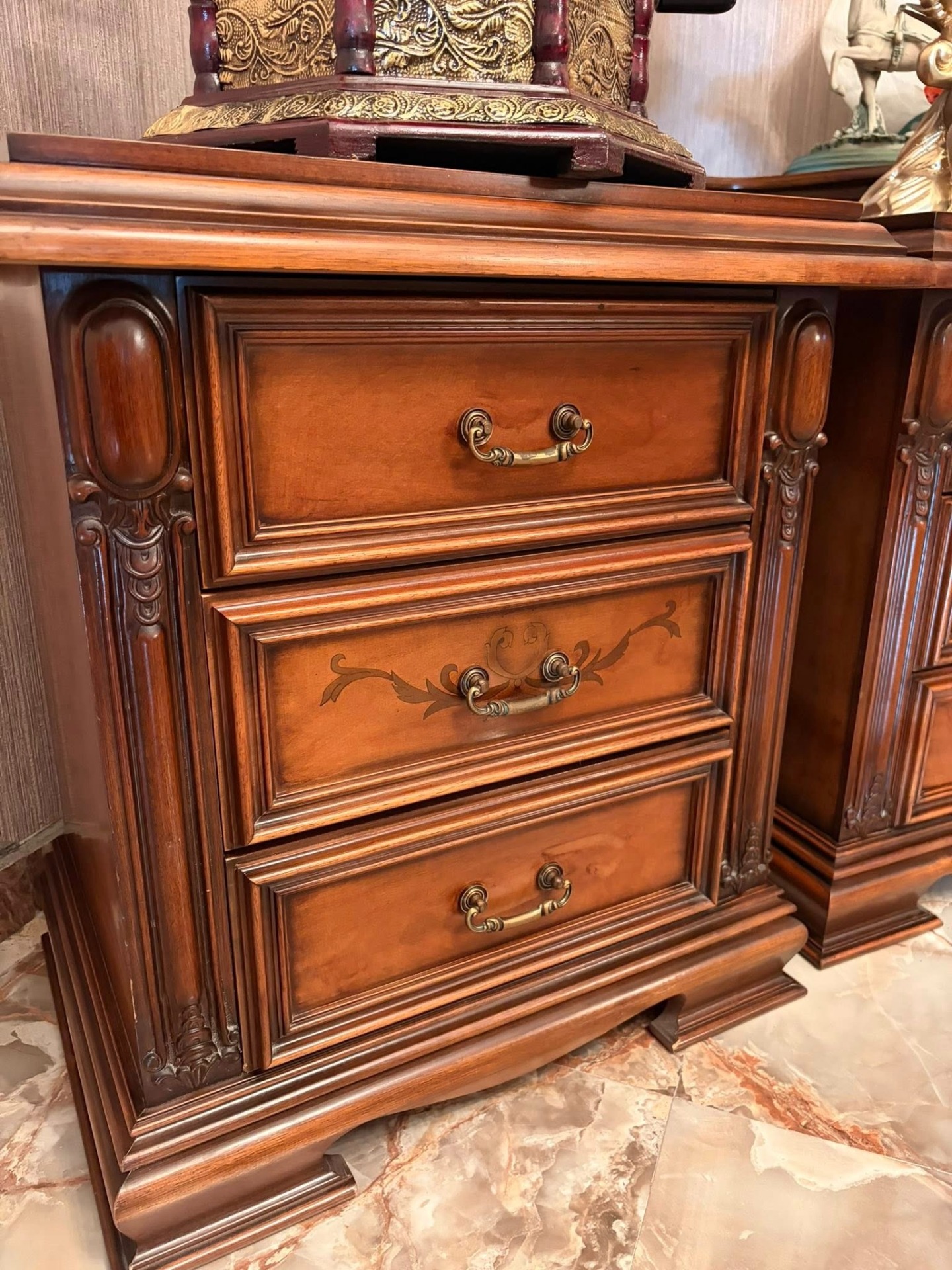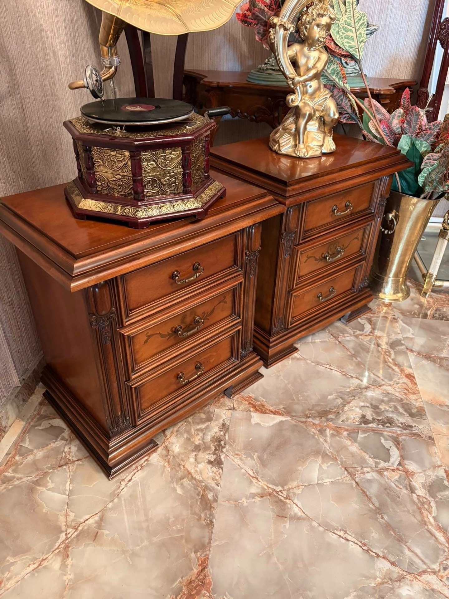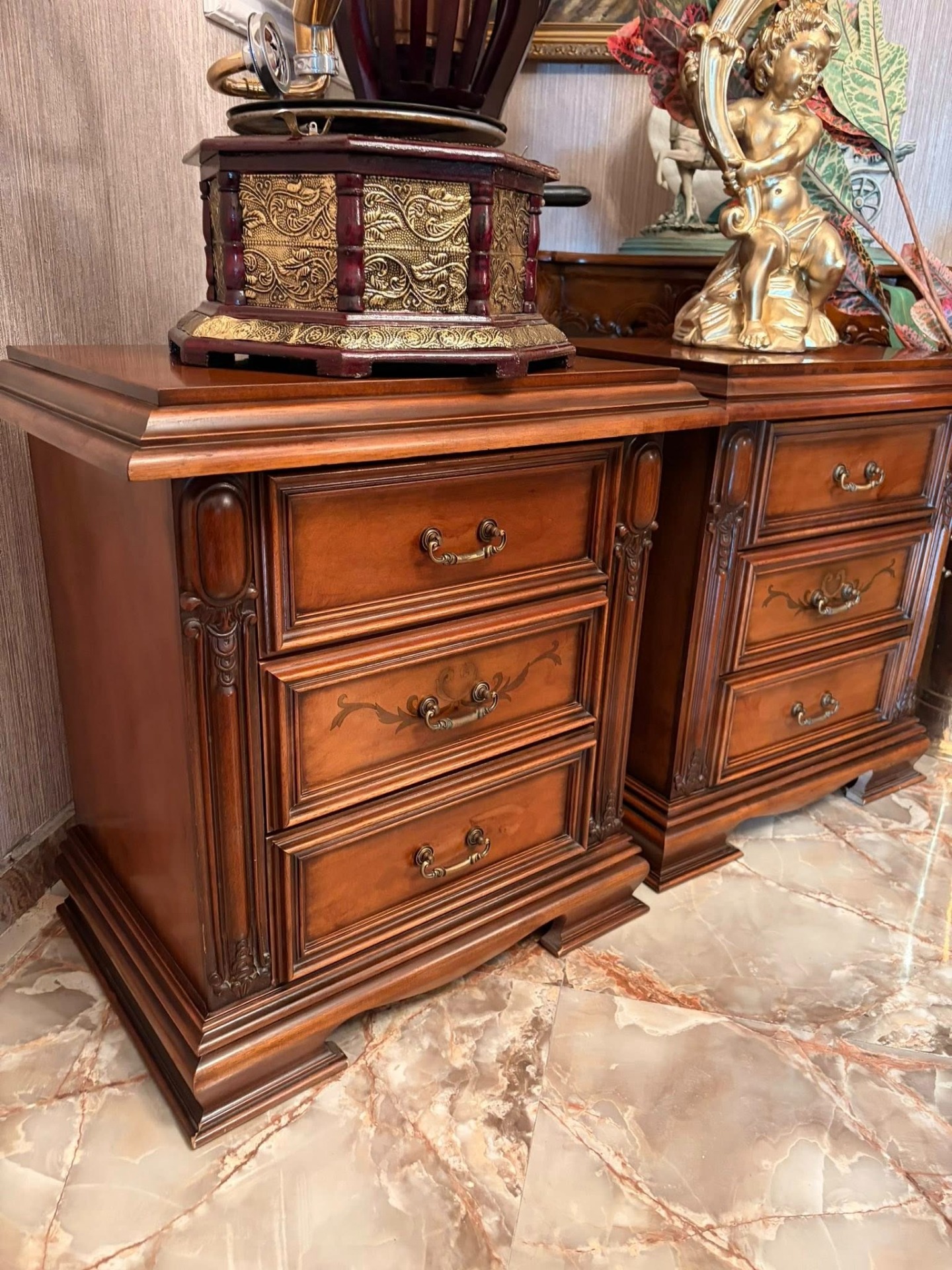 Pereche de noptiere,elegante ,din lemn cu intarsie și sculpturi.