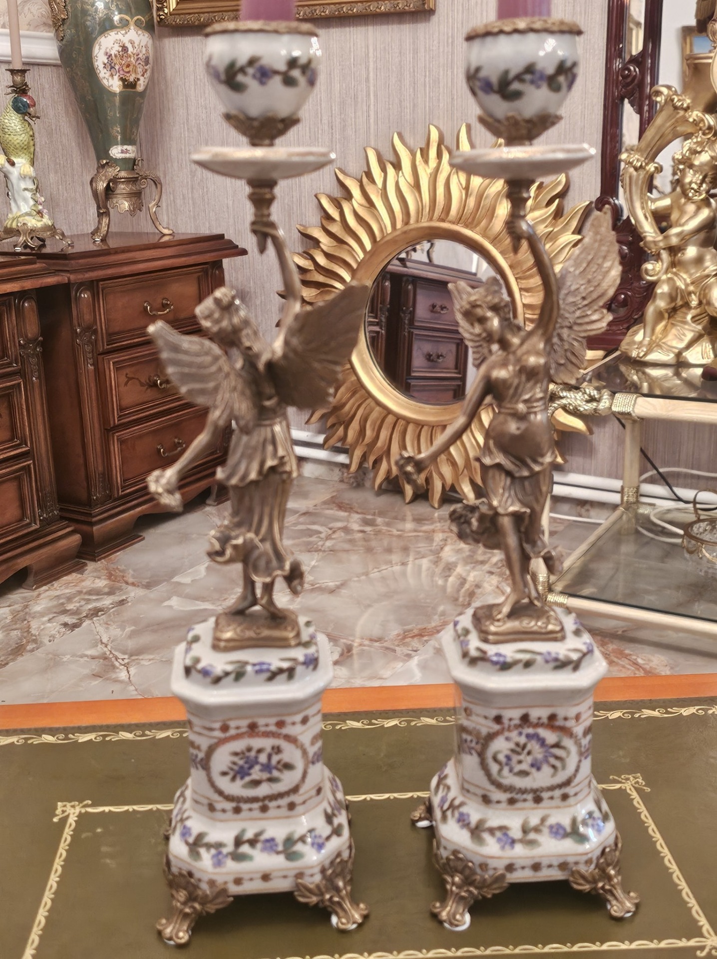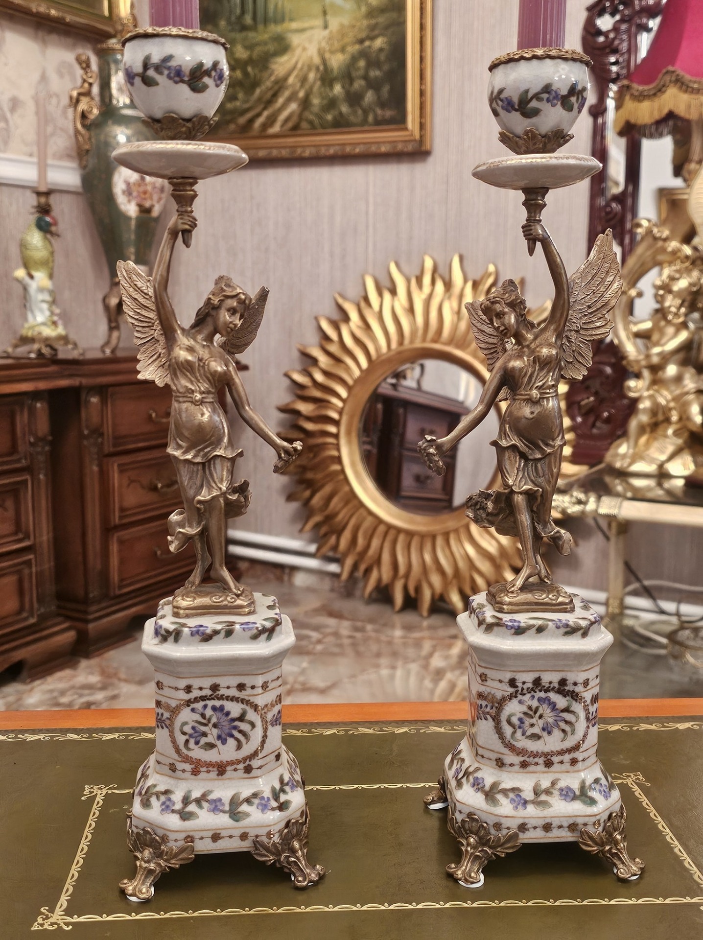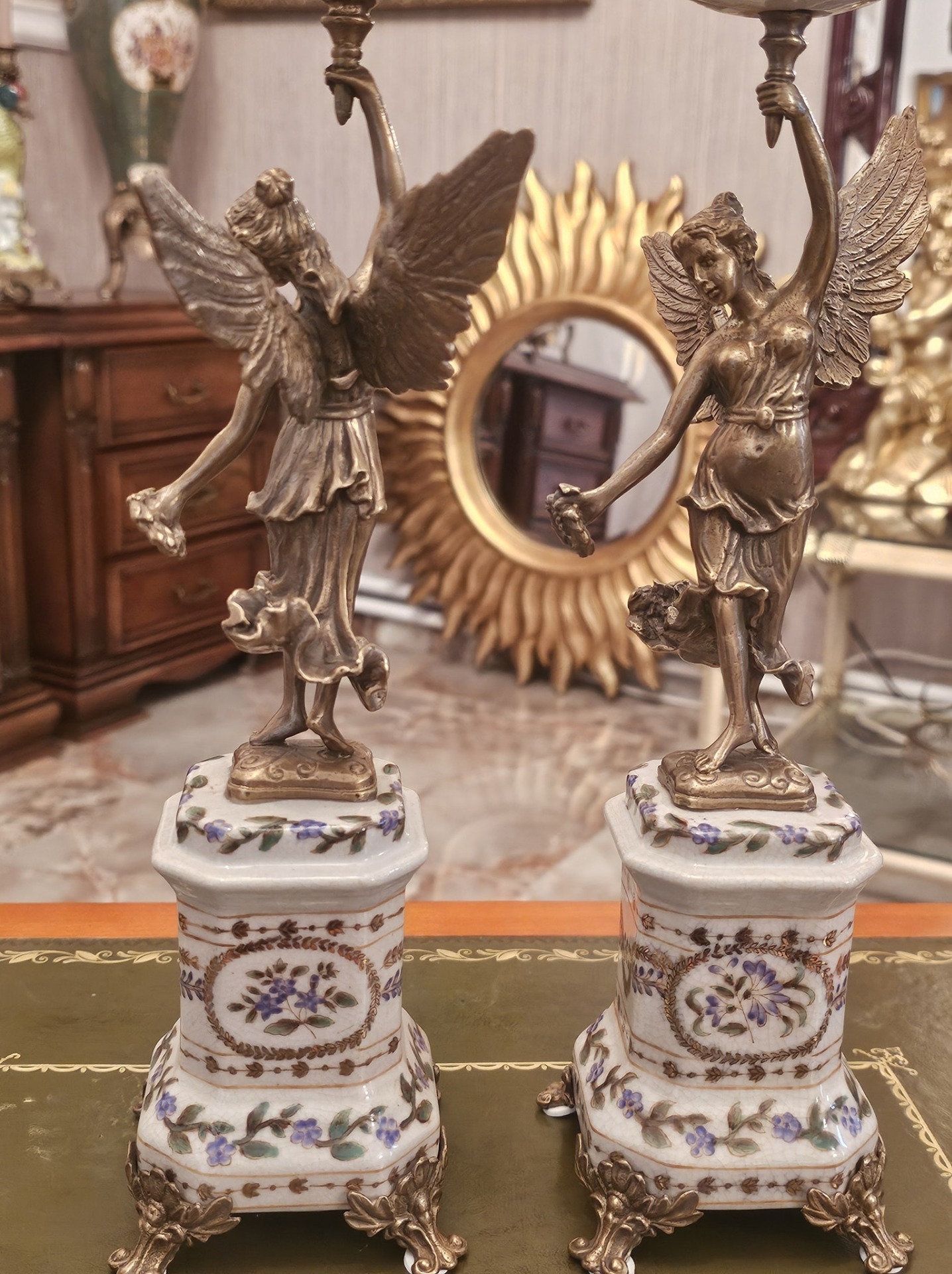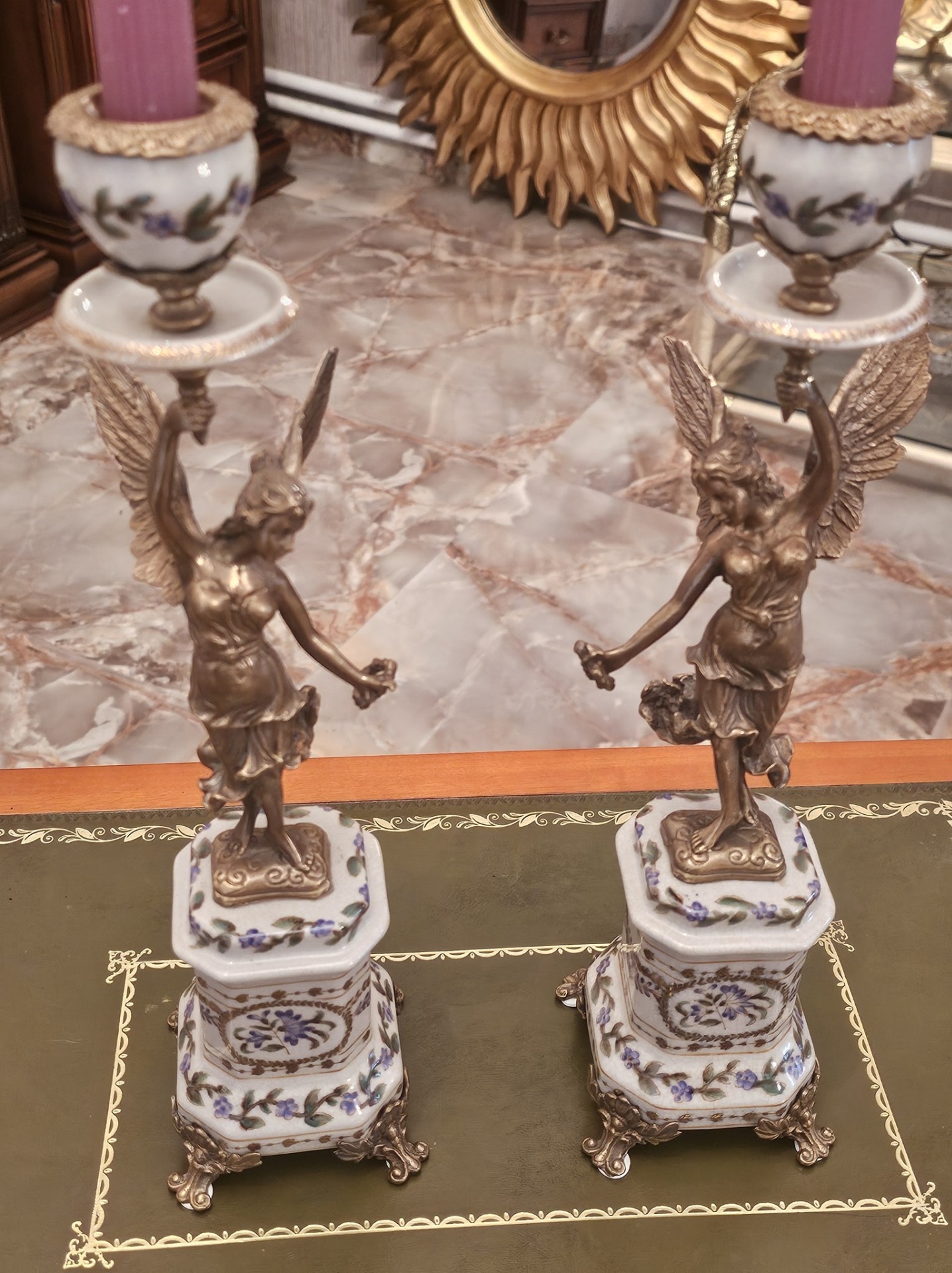 Pereche de sfesnice din portelan si bronz.