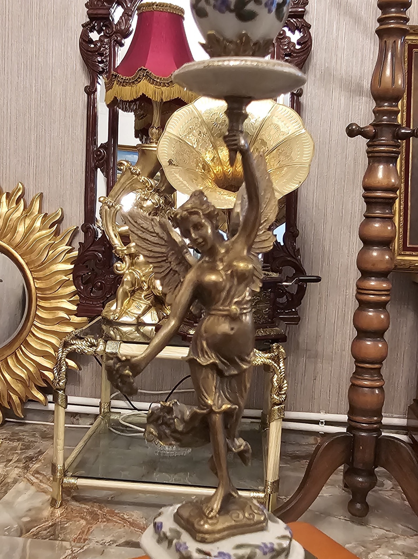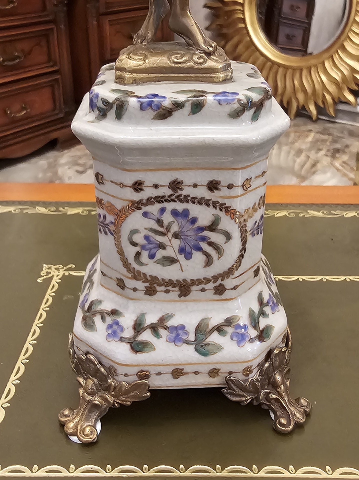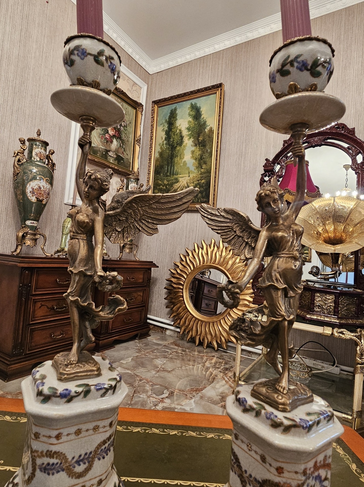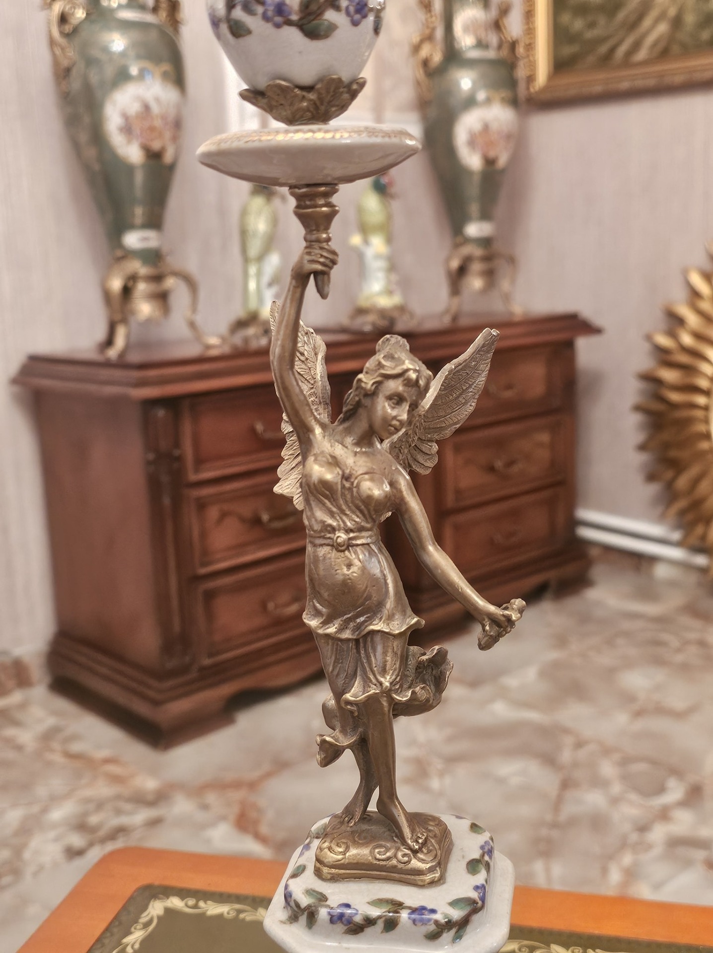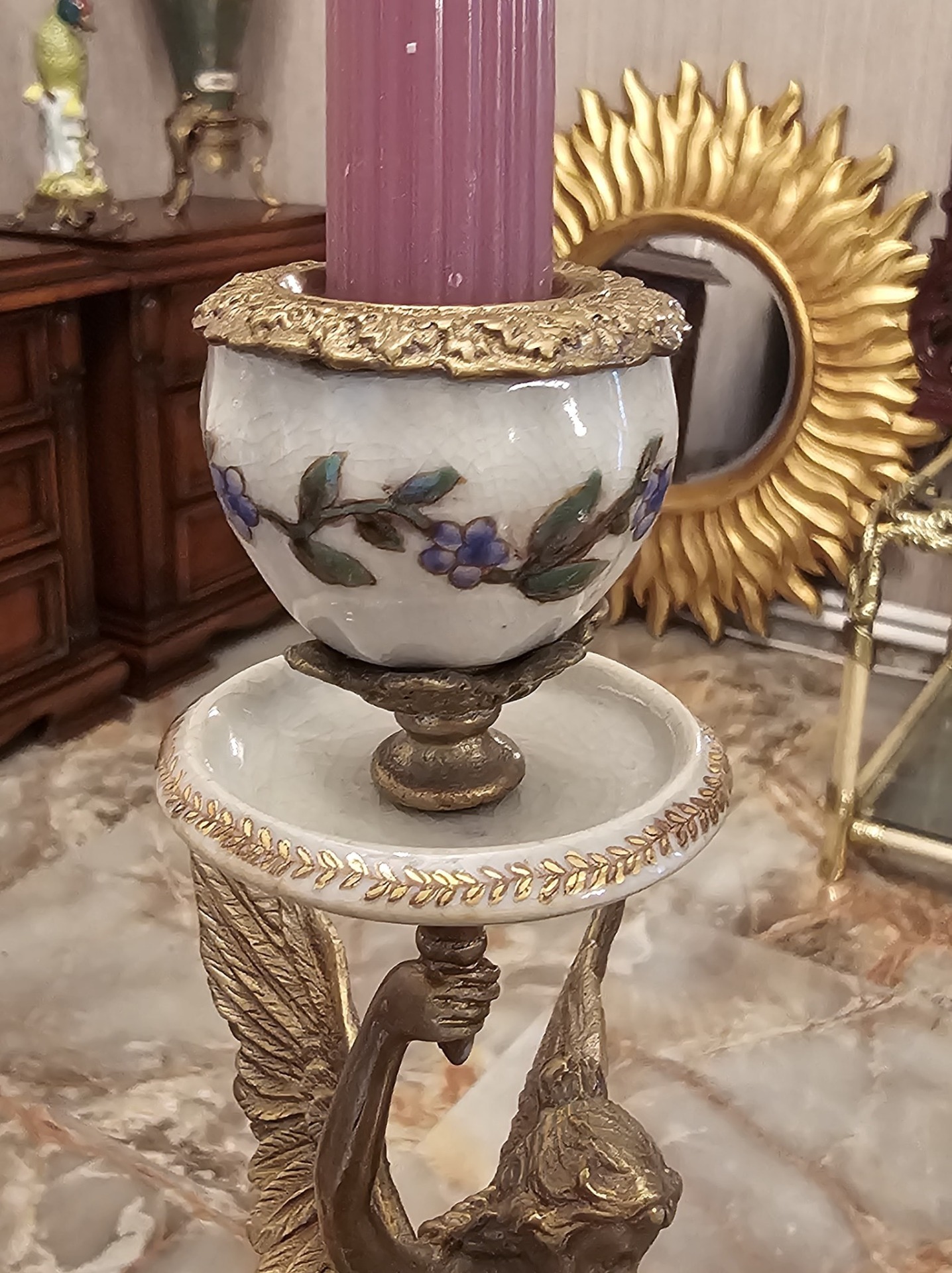 Pereche de sfesnice din portelan si bronz.