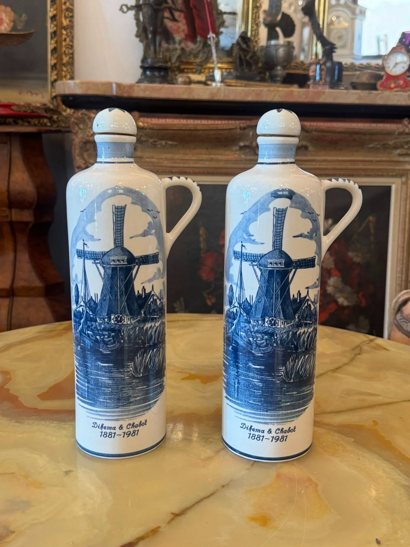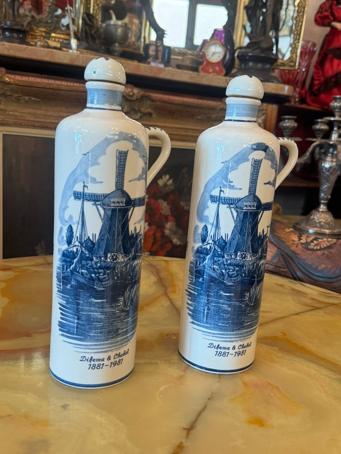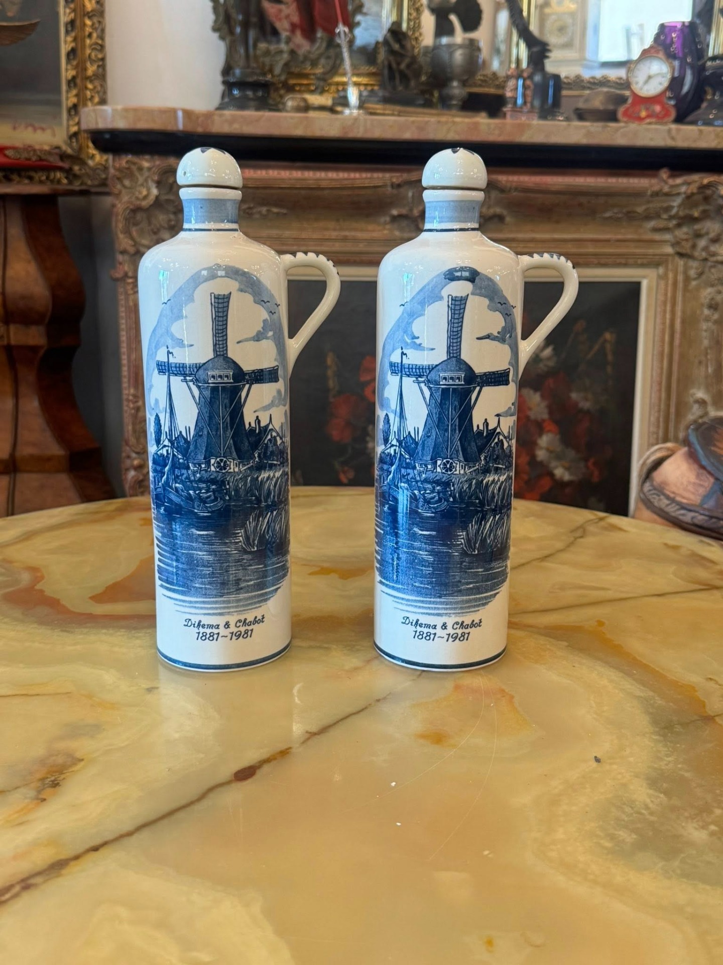 Pereche de sticle, realizate din ceramică albă glazurată, decorate în celebrul stil "Delft Blue" (albastru de Delft).Pentru a celebra 100 de ani de existență a firmei Dijkema & Chabot. (anul 1981-Olanda)