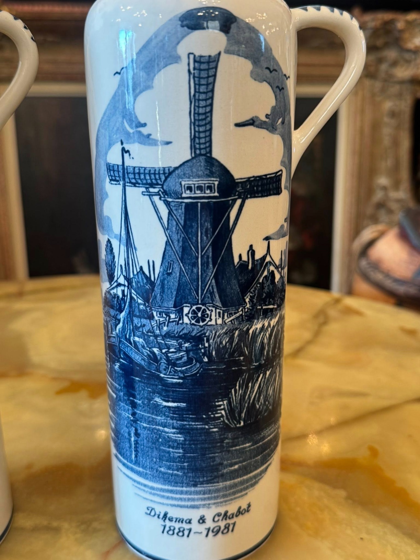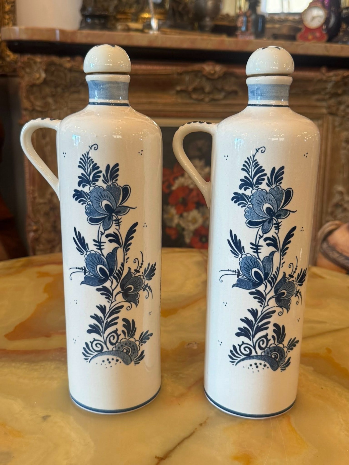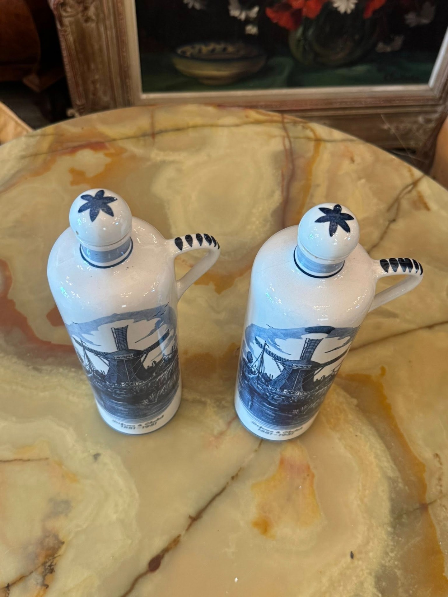 Pereche de sticle, realizate din ceramică albă glazurată, decorate în celebrul stil "Delft Blue" (albastru de Delft).Pentru a celebra 100 de ani de existență a firmei Dijkema & Chabot. (anul 1981-Olanda)