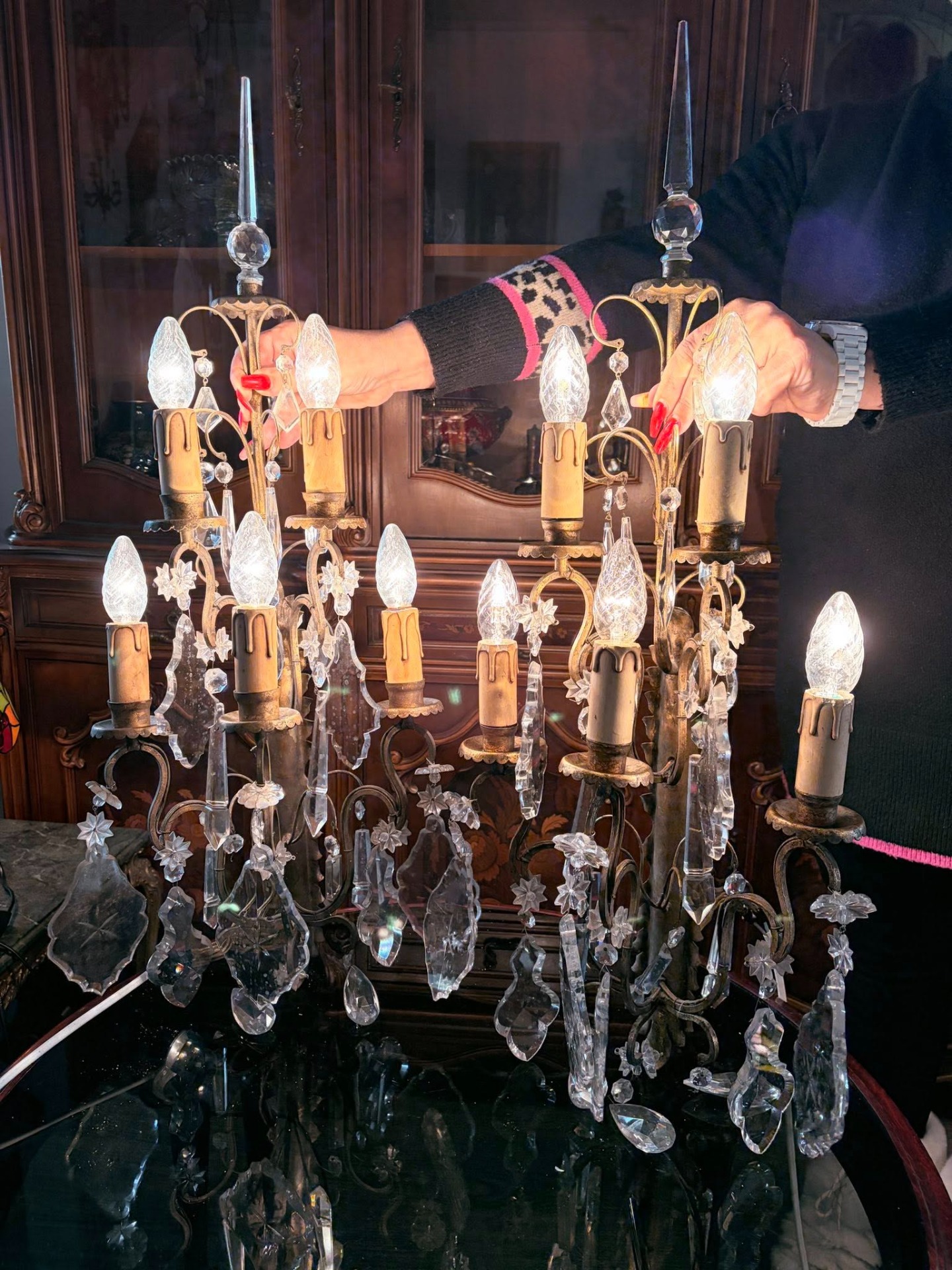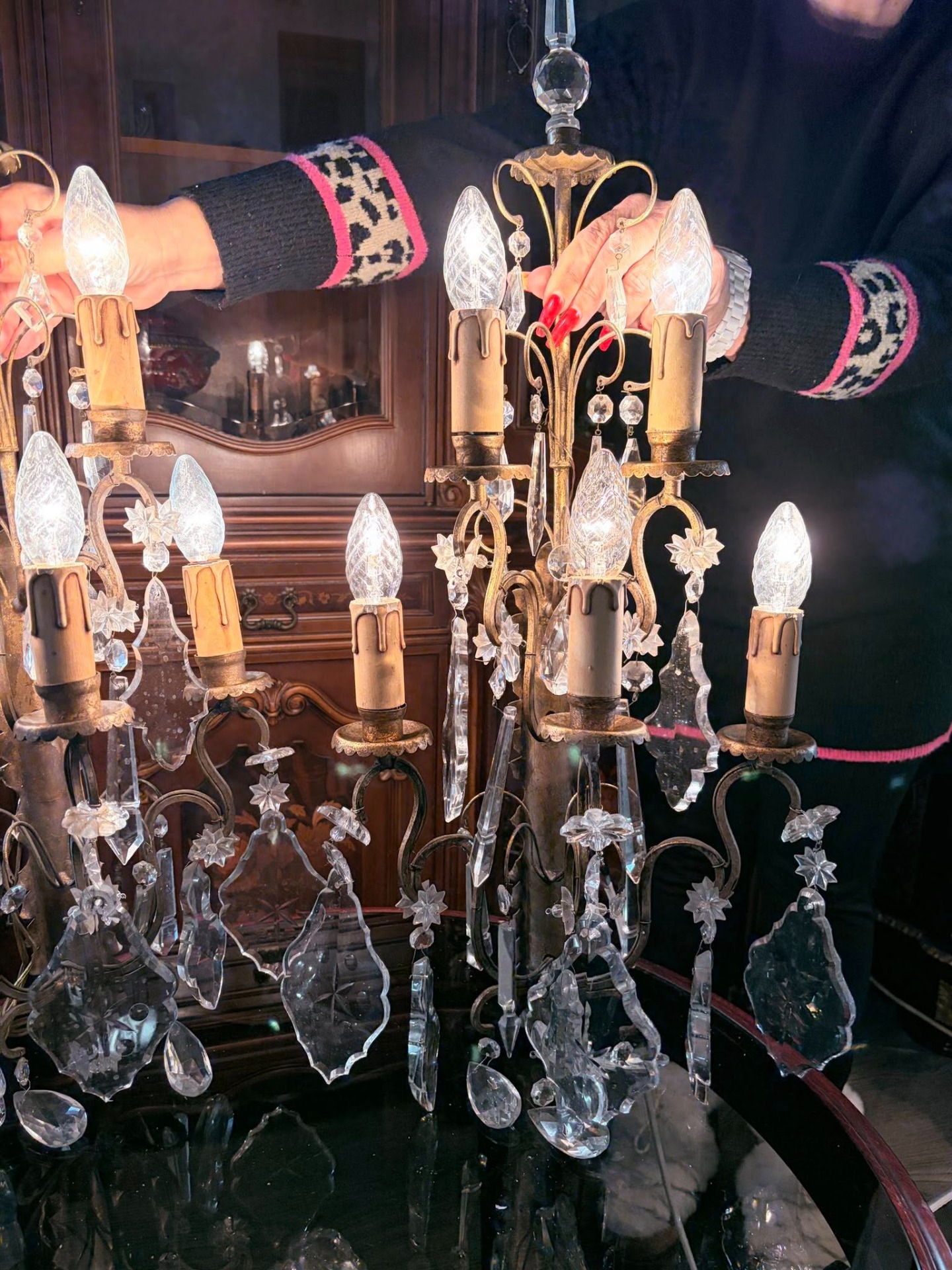 • Cristale: Decorate din abundență cu prisme din cristal masiv, tăiate în formă de frunză și migdală. Cristalele prezintă gravuri discrete (motive stelate) care oferă reflexii spectaculoase sub lumină.