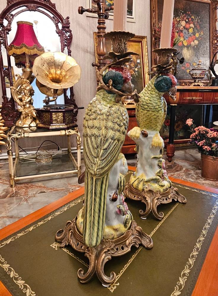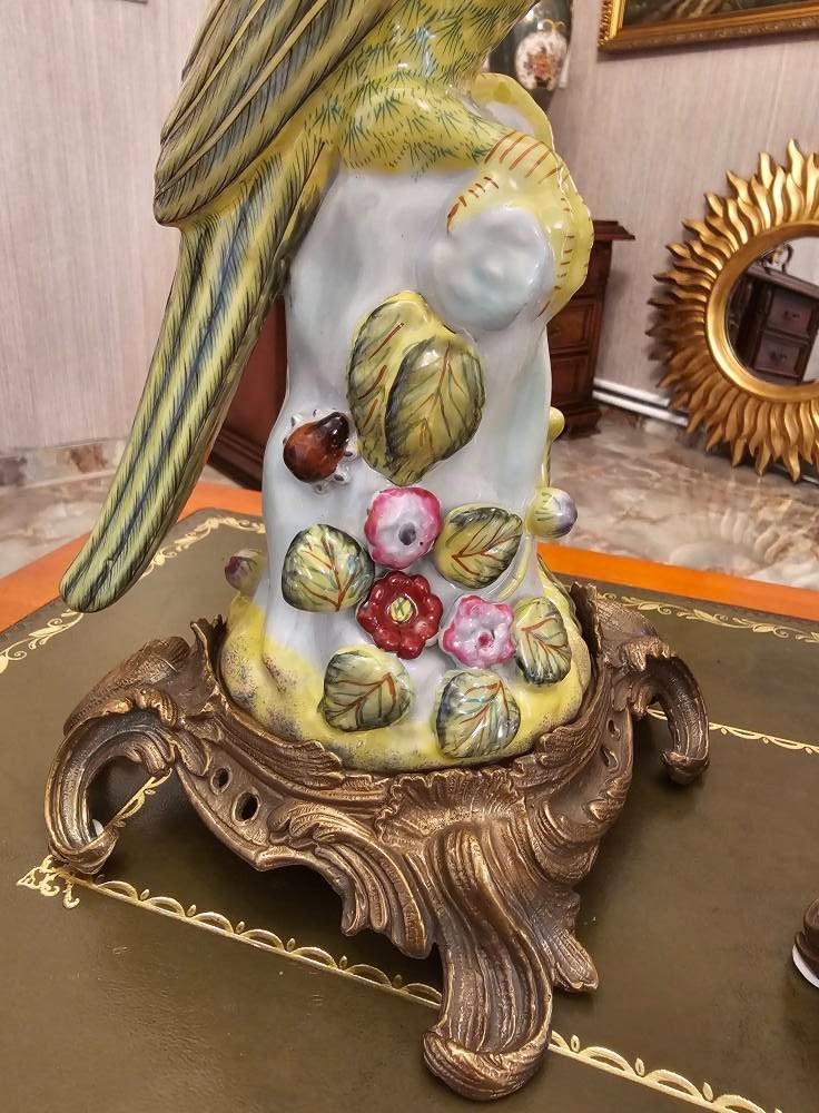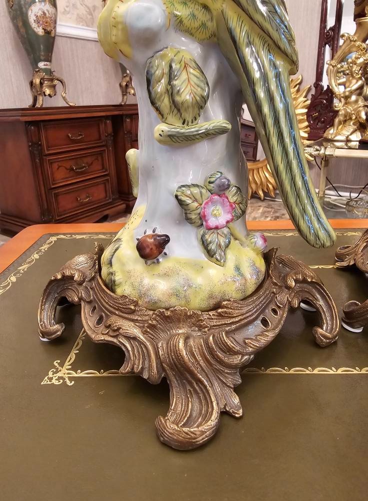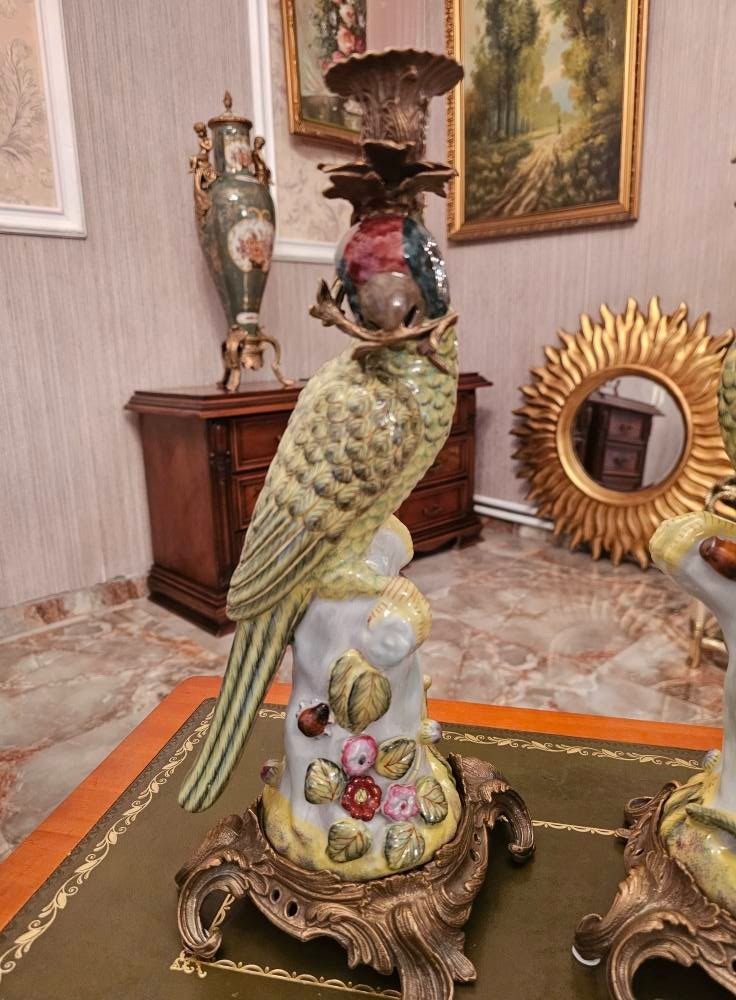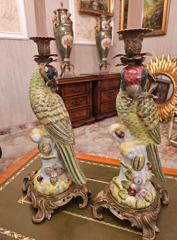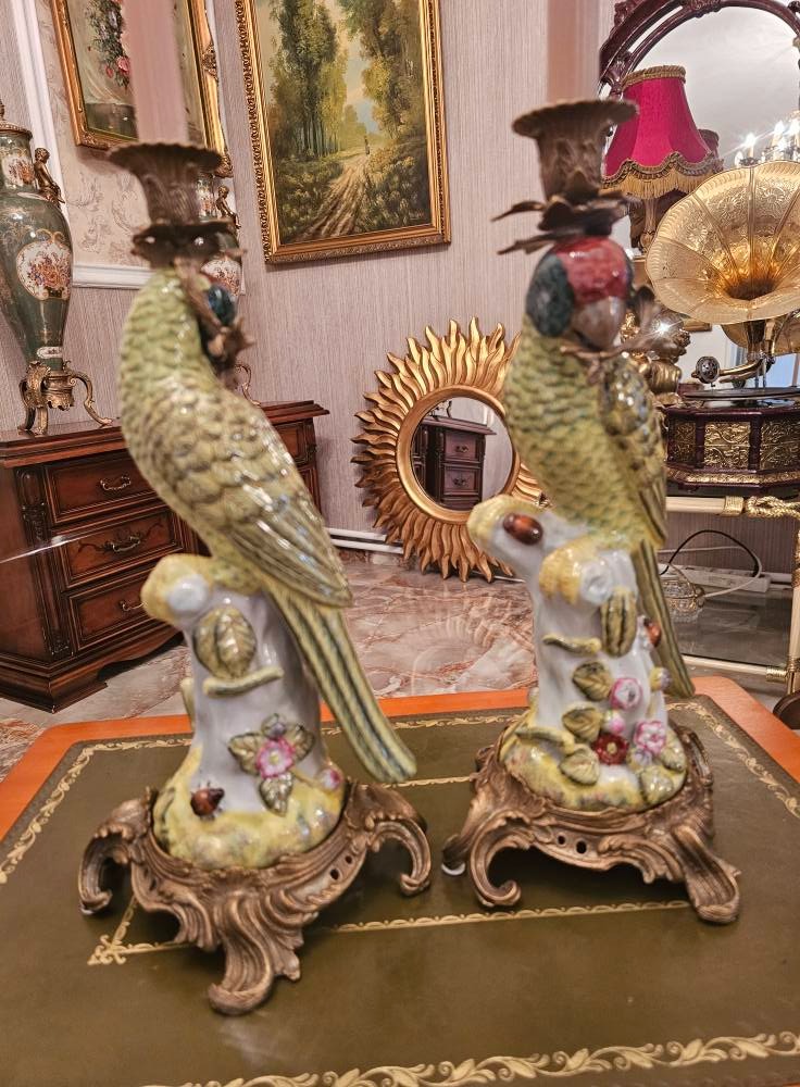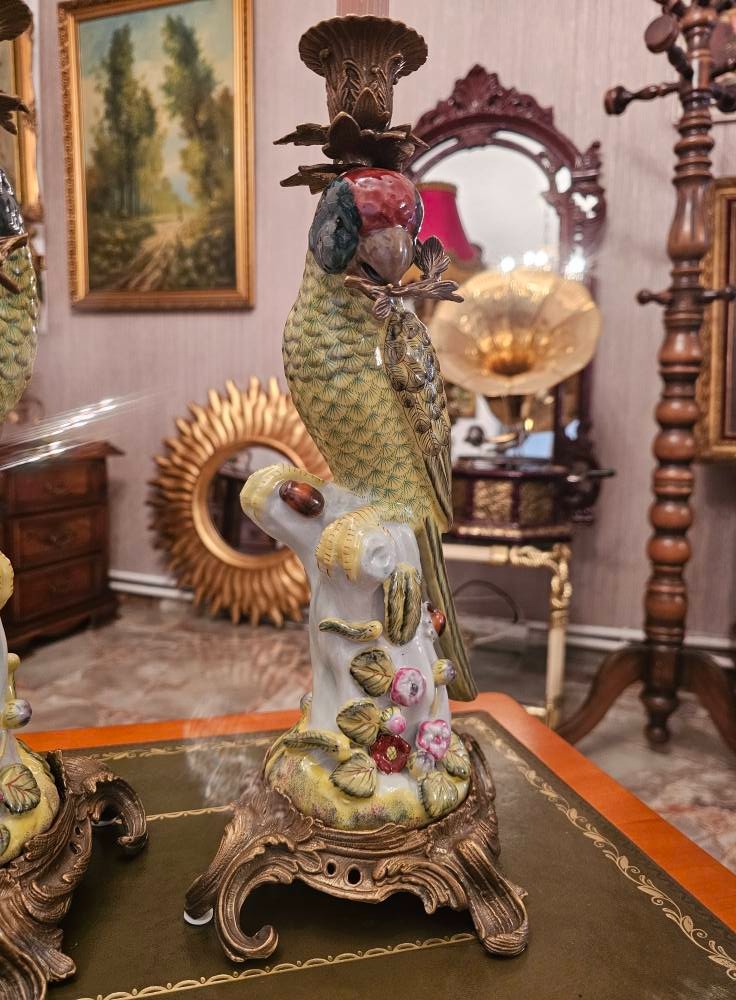 Pereche superbă de sfeșnice decorative, realizate din porțelan pictat manual și monturi din bronz masiv în stil baroc. Reprezintă doi papagali exotici așezați pe