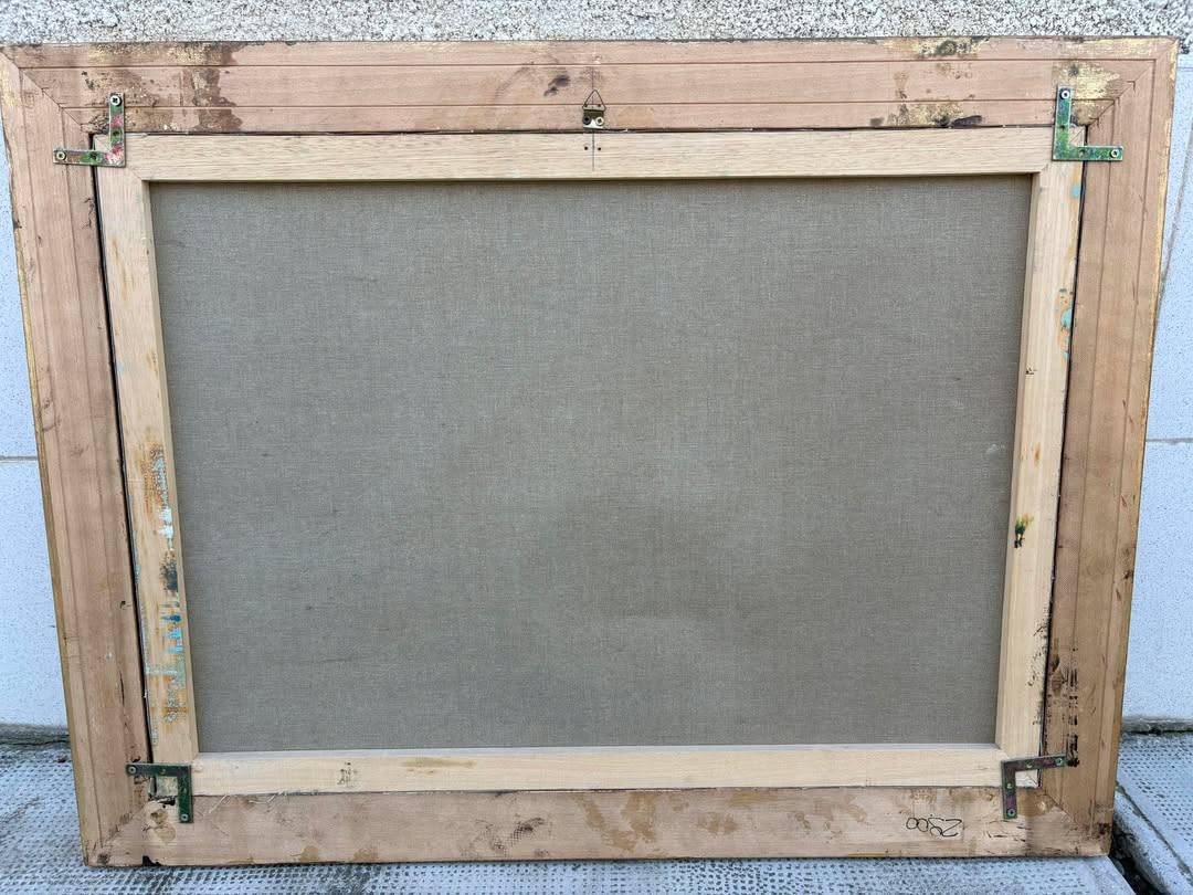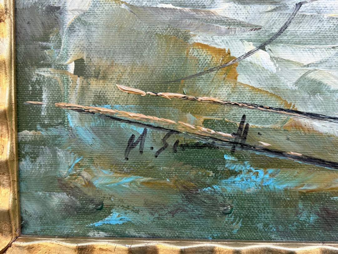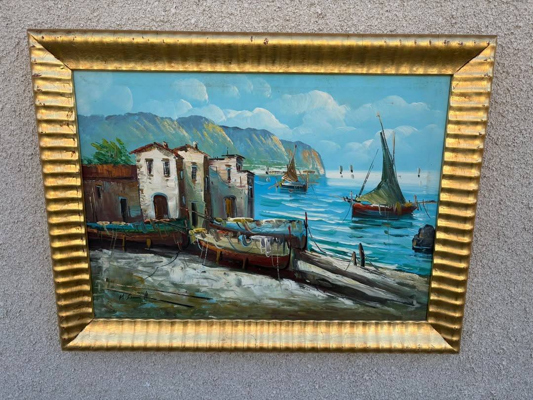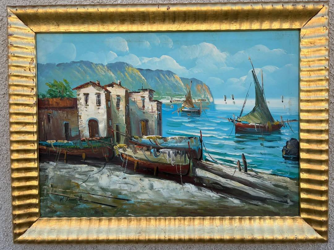 pictatura pe pânză, reprezentând un peisaj marin cu bărci pescărești și case pe malul mării, în stil clasic mediteranean. Culorile sunt vii, iar pictura are textură reliefată specifică picturii în ulei.