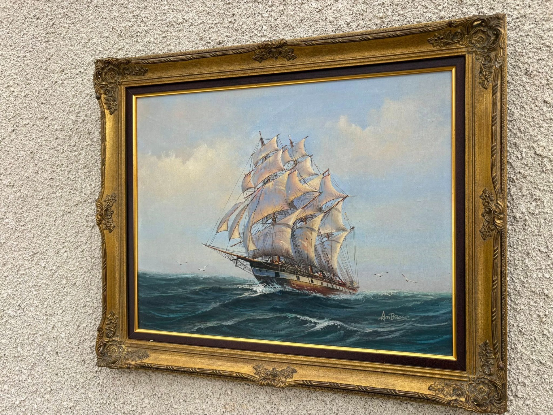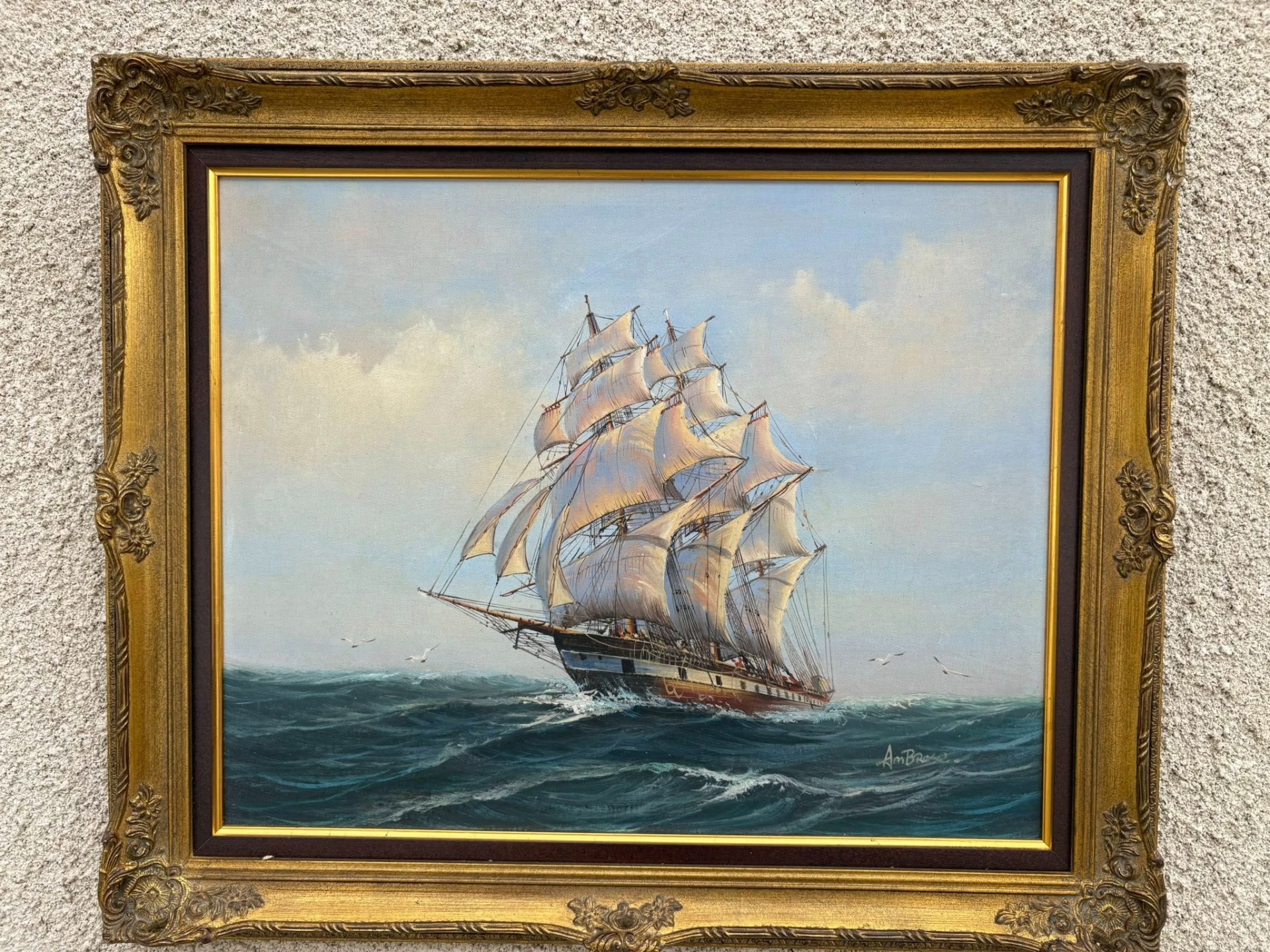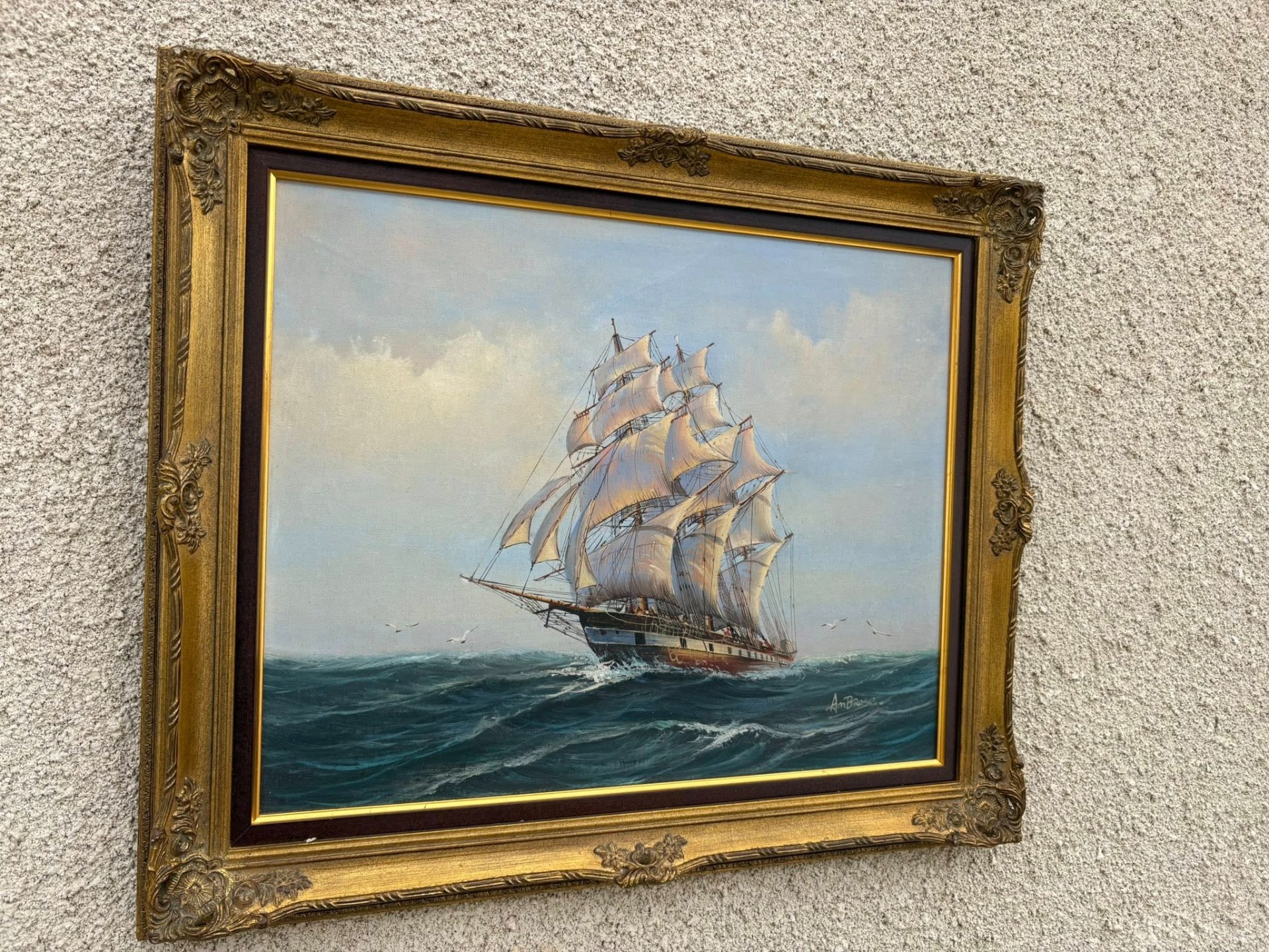 Tablou deosebit realizat în tehnică ulei pe pânză,reprezentând o corabie impunătoare navigând pe o mare agitată. Este o piesă clasică, ideală pentru decorul unui birou, living sau pentru colecționarii de artă nautică.