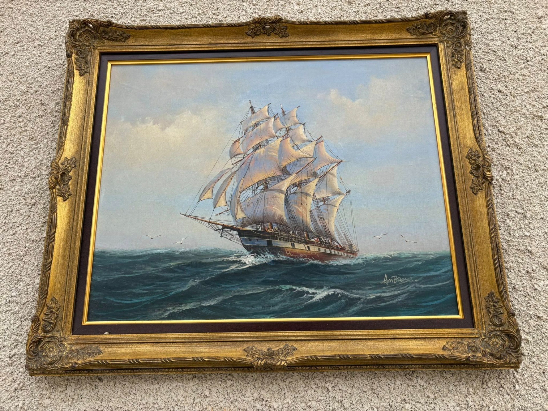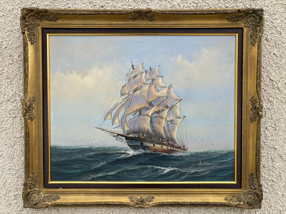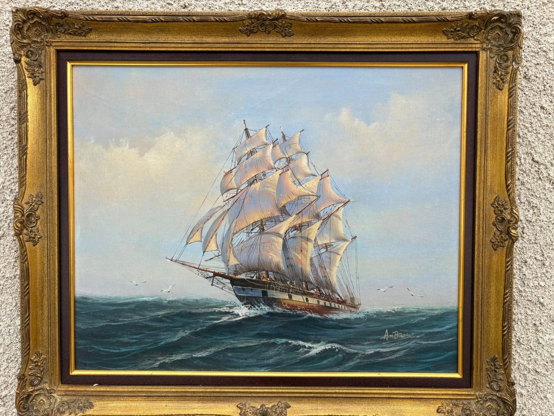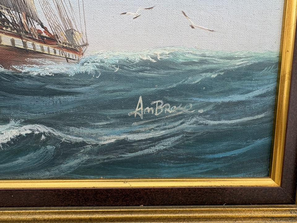 Tablou deosebit realizat în tehnică ulei pe pânză,reprezentând o corabie impunătoare navigând pe o mare agitată. Este o piesă clasică, ideală pentru decorul unui birou, living sau pentru colecționarii de artă nautică.