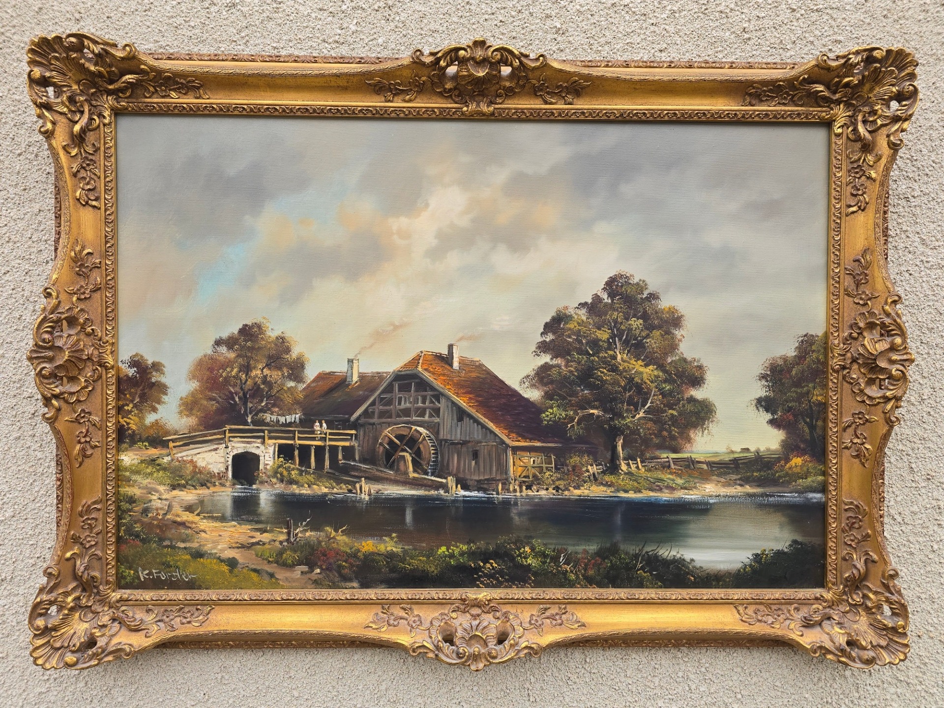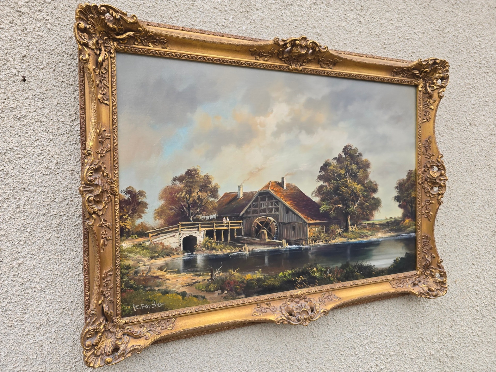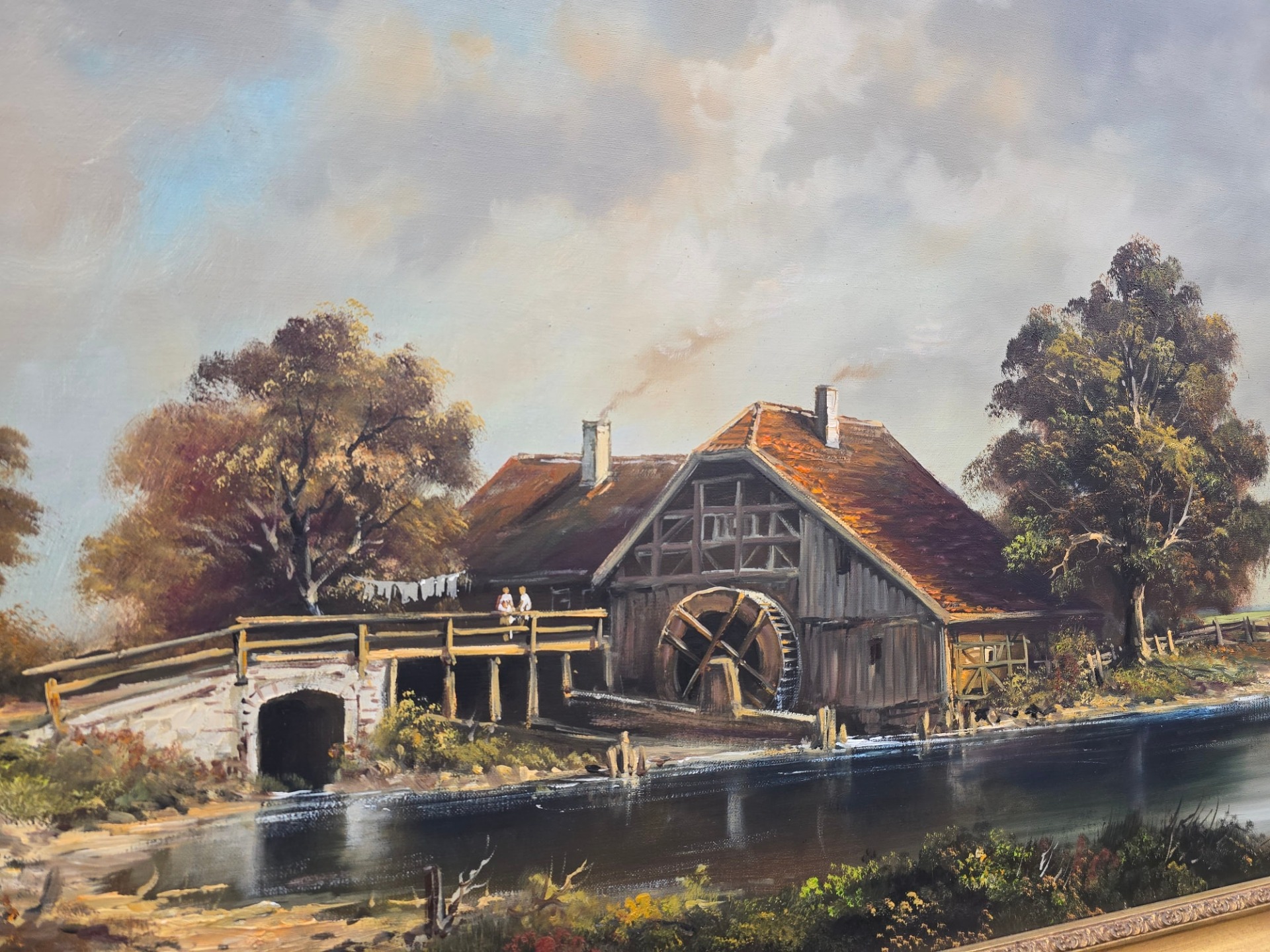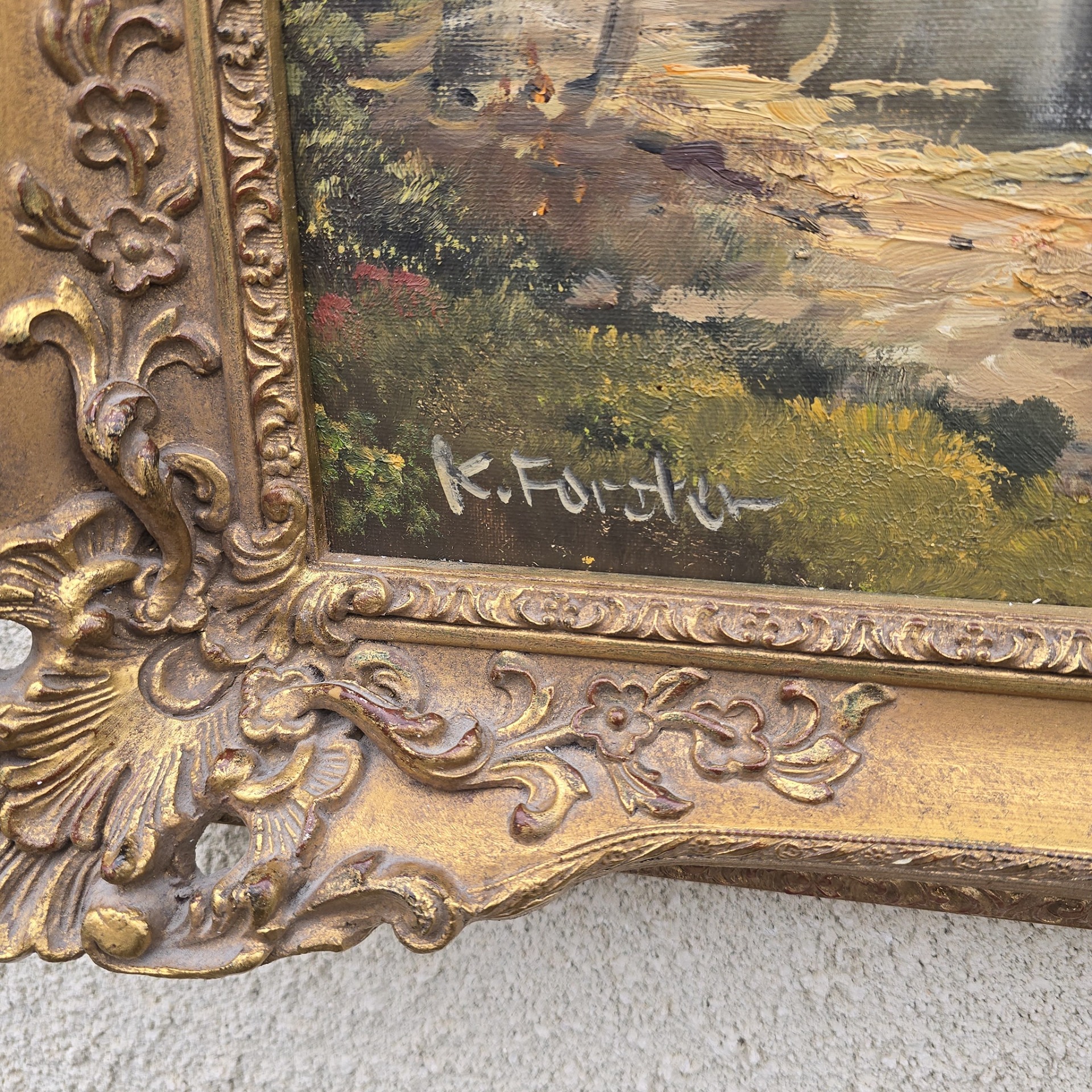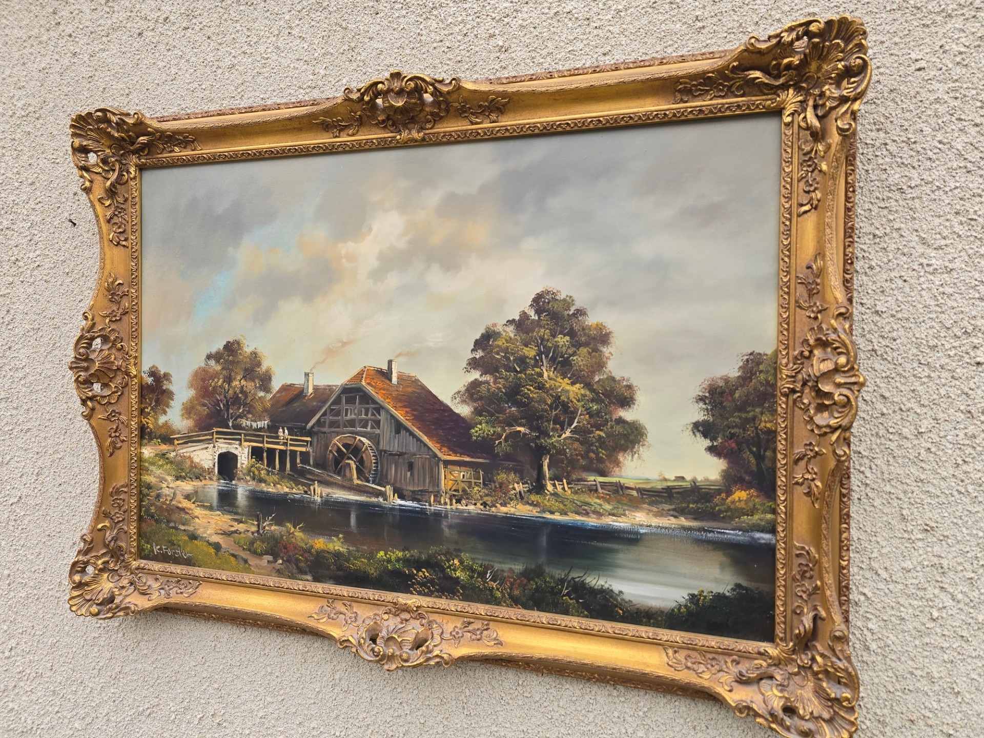 Acest tablou în ulei, probabil pe pânză, înfățișează o scenă rurală clasică, c