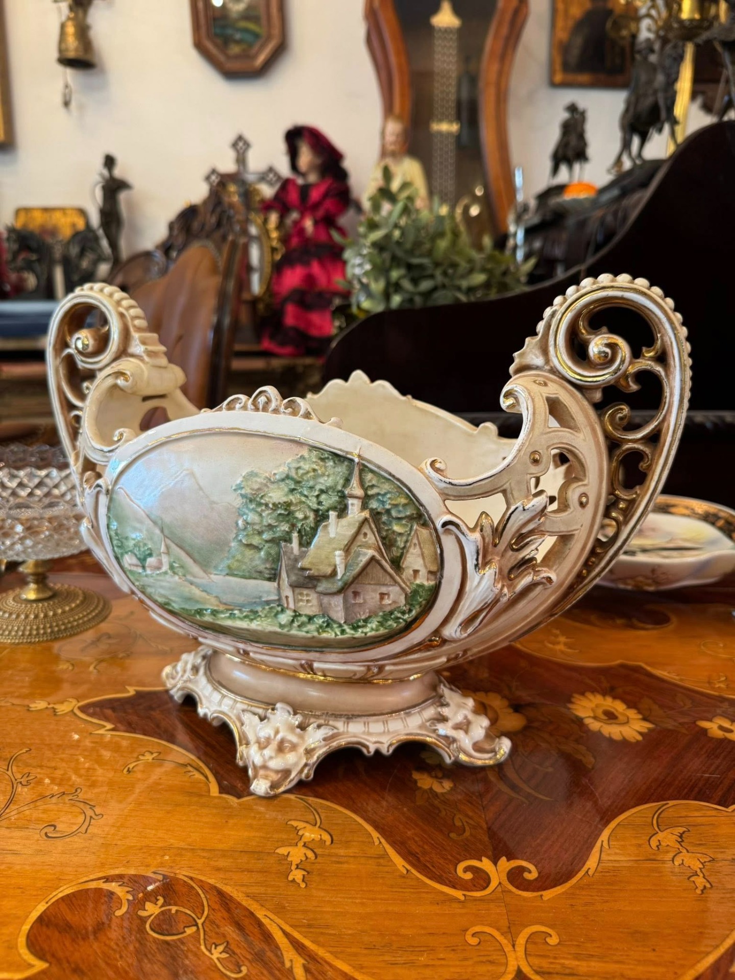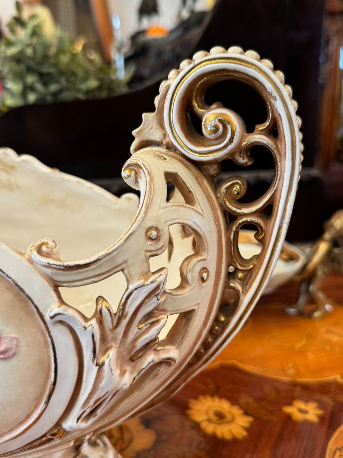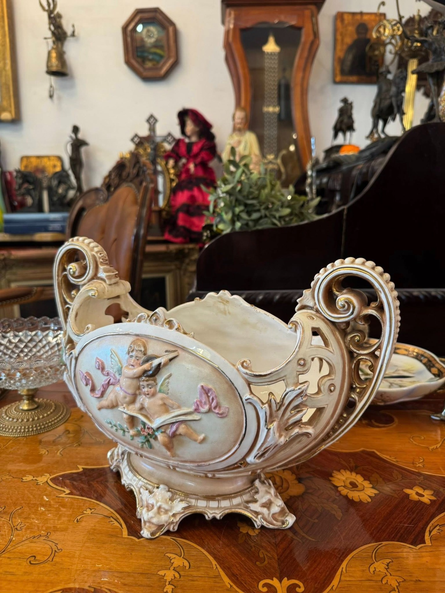 Piesă decorativă spectaculoasă, o fructieră tip "centru de masă" (centerpiece), realizată din majolică într-un stil Neobaroc. (cca 1900)