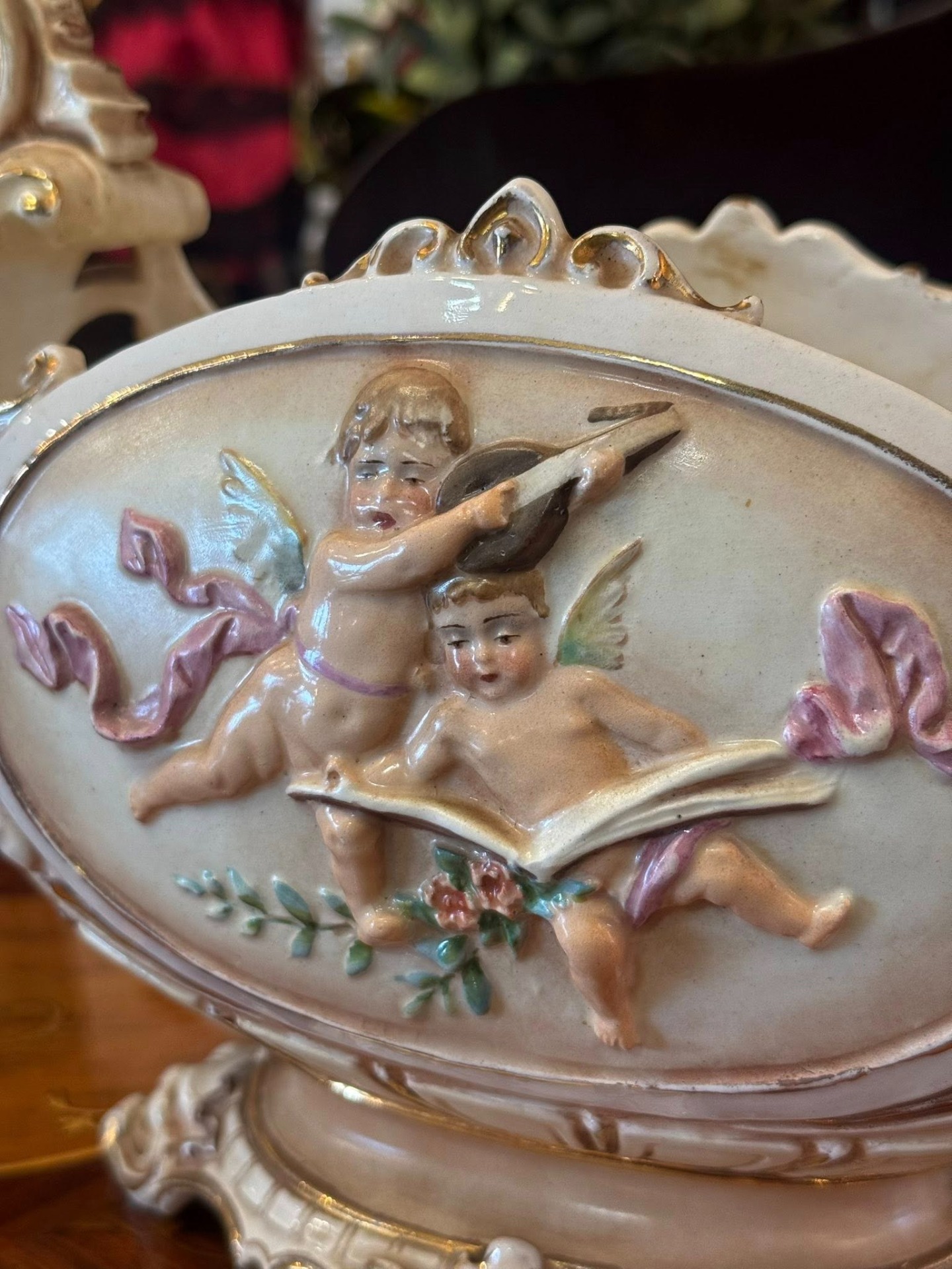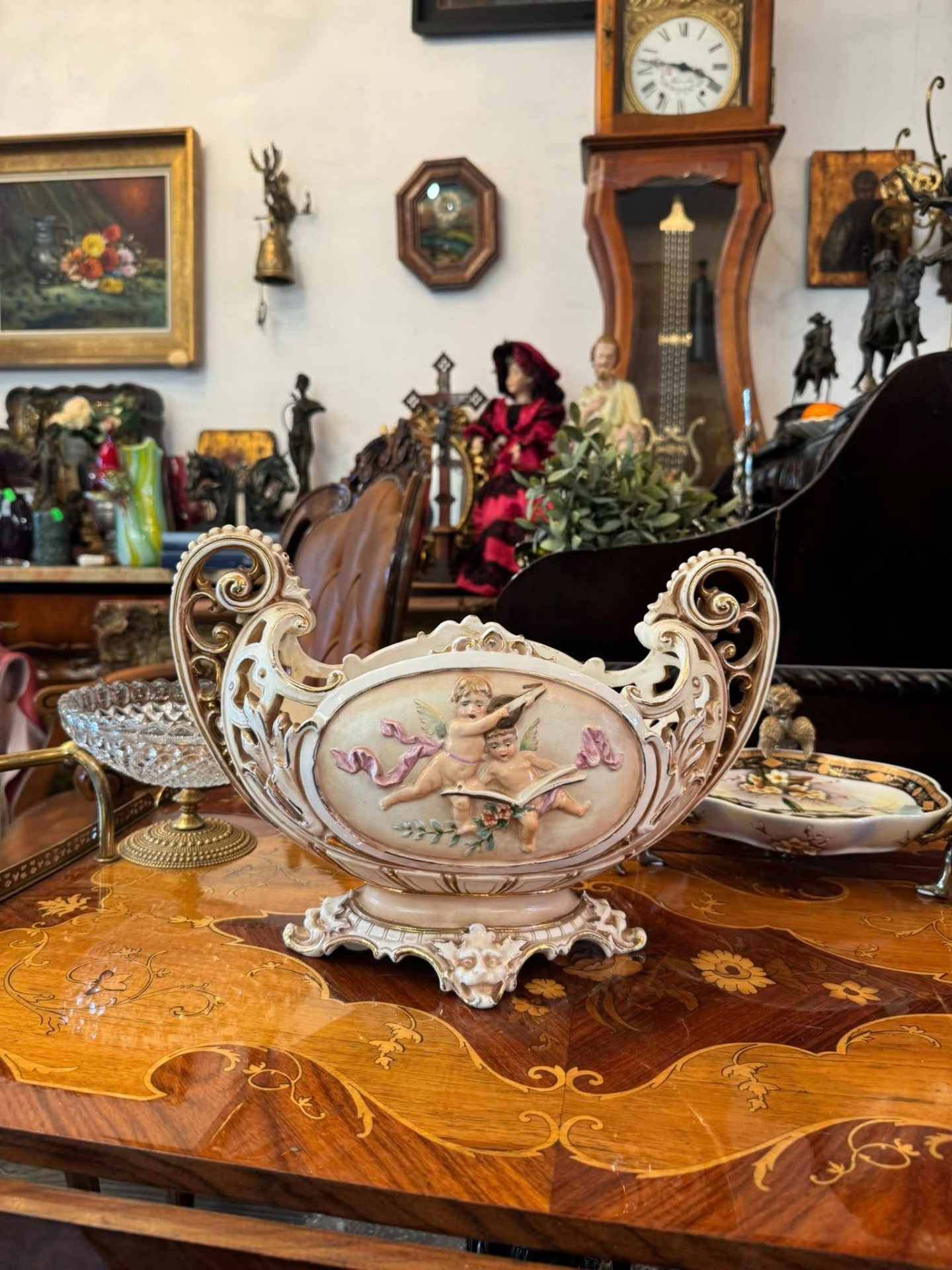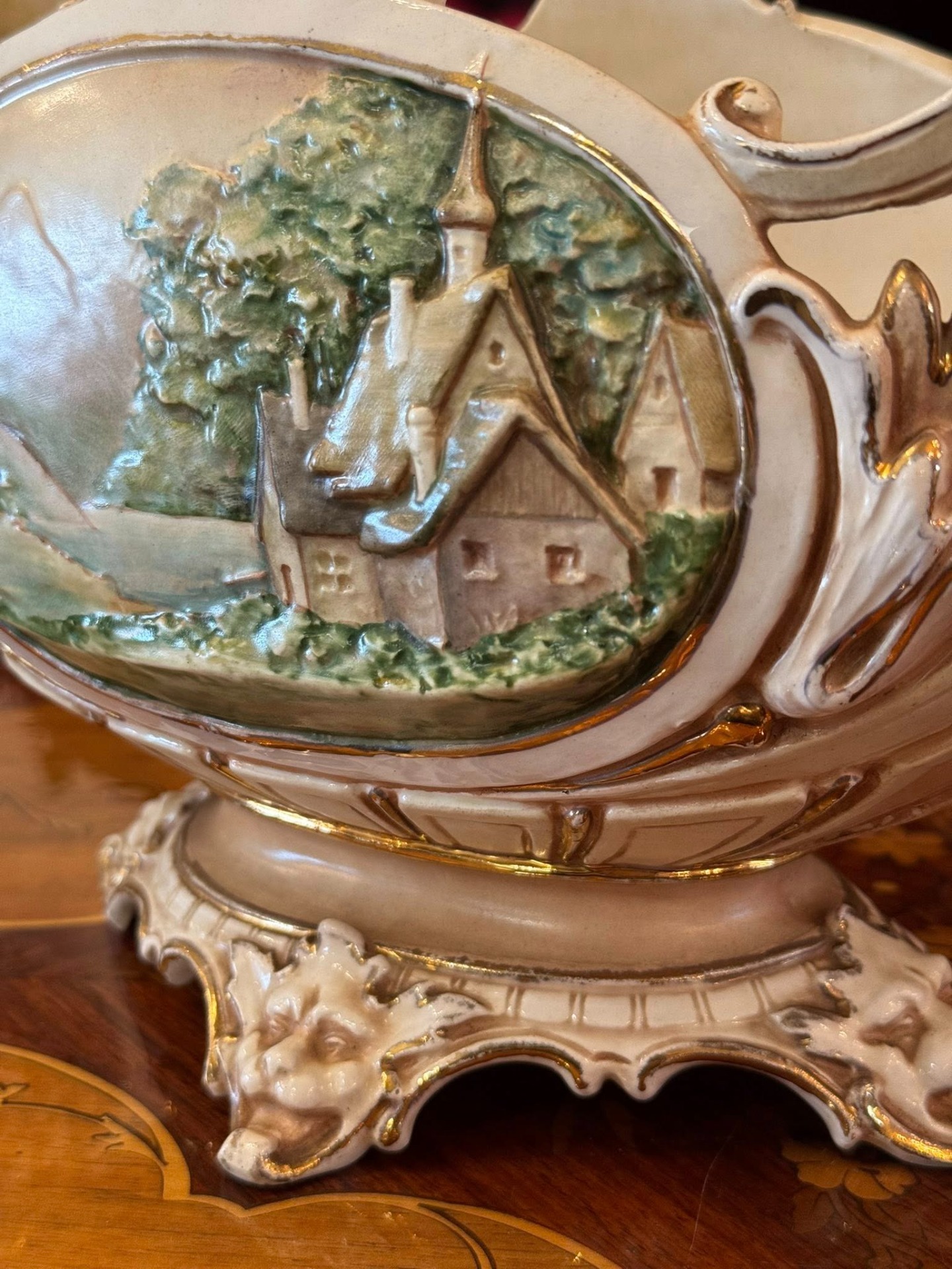 Piesă decorativă spectaculoasă, o fructieră tip "centru de masă" (centerpiece), realizată din majolică într-un stil Neobaroc. (cca 1900)