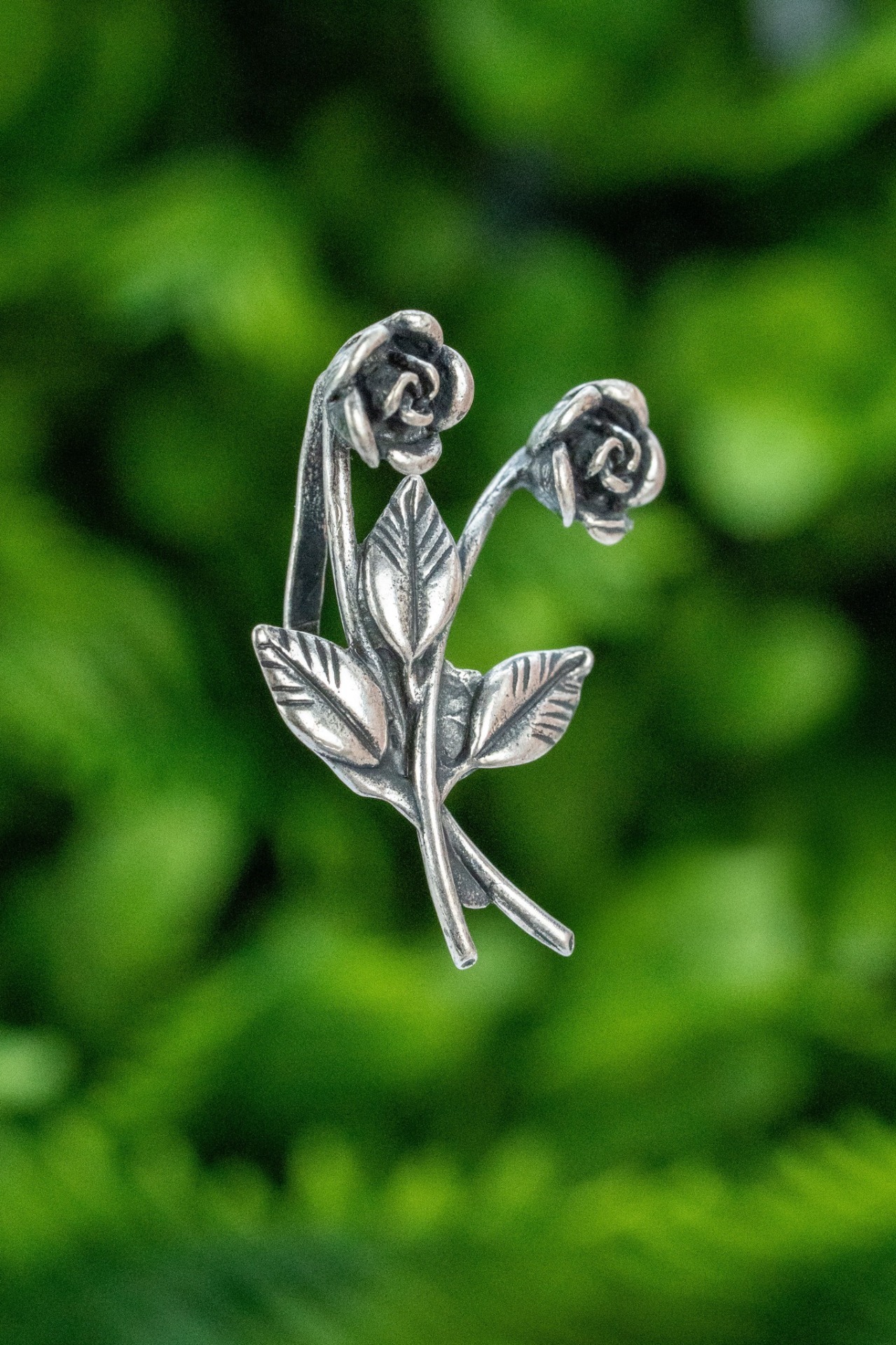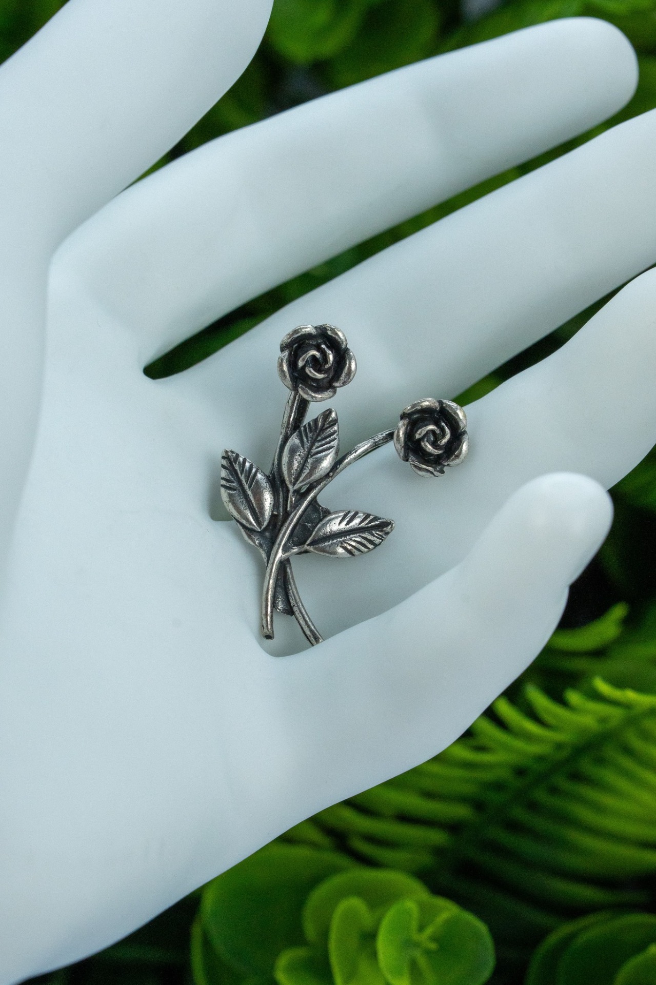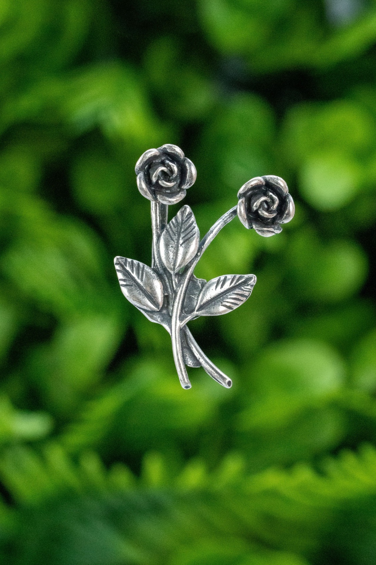 Pin de rever vintage, din argint, frumos stilizat în motiv floral.