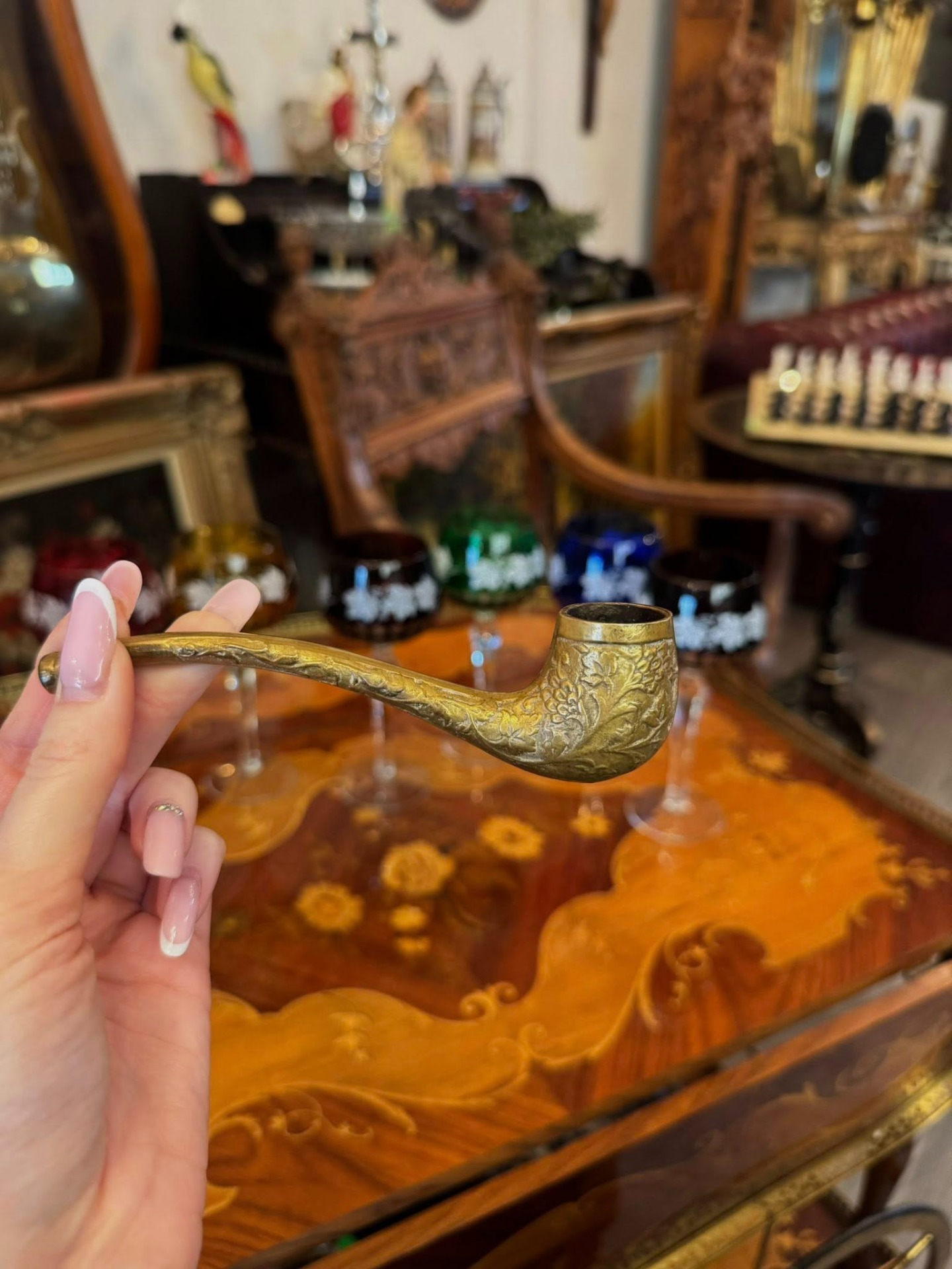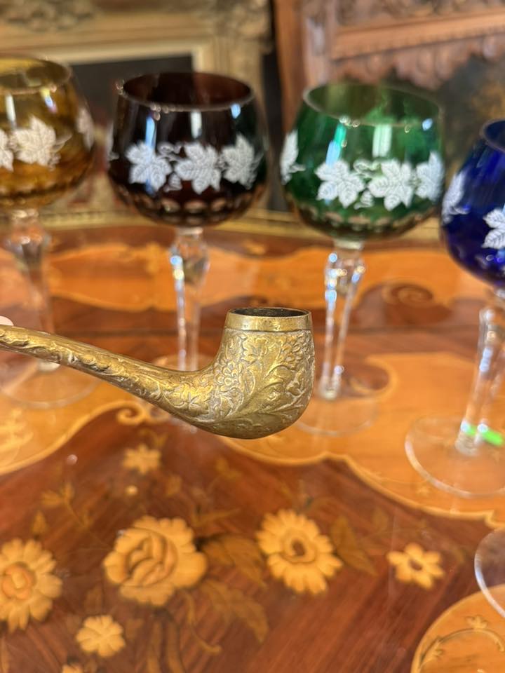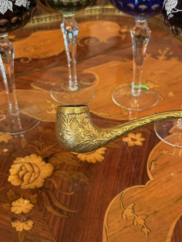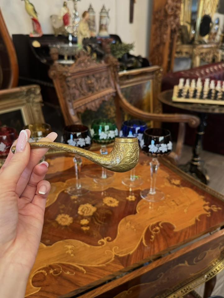 Pipă decorativă deosebită din bronz, realizată într-un stil clasic, bogat ornamentat, datând din perioada Belle Époque.(începutul secolului XX)