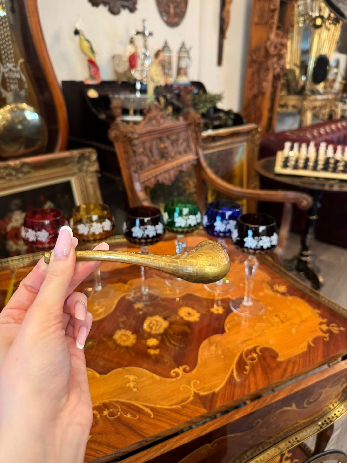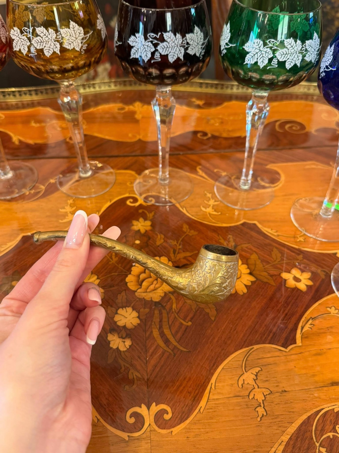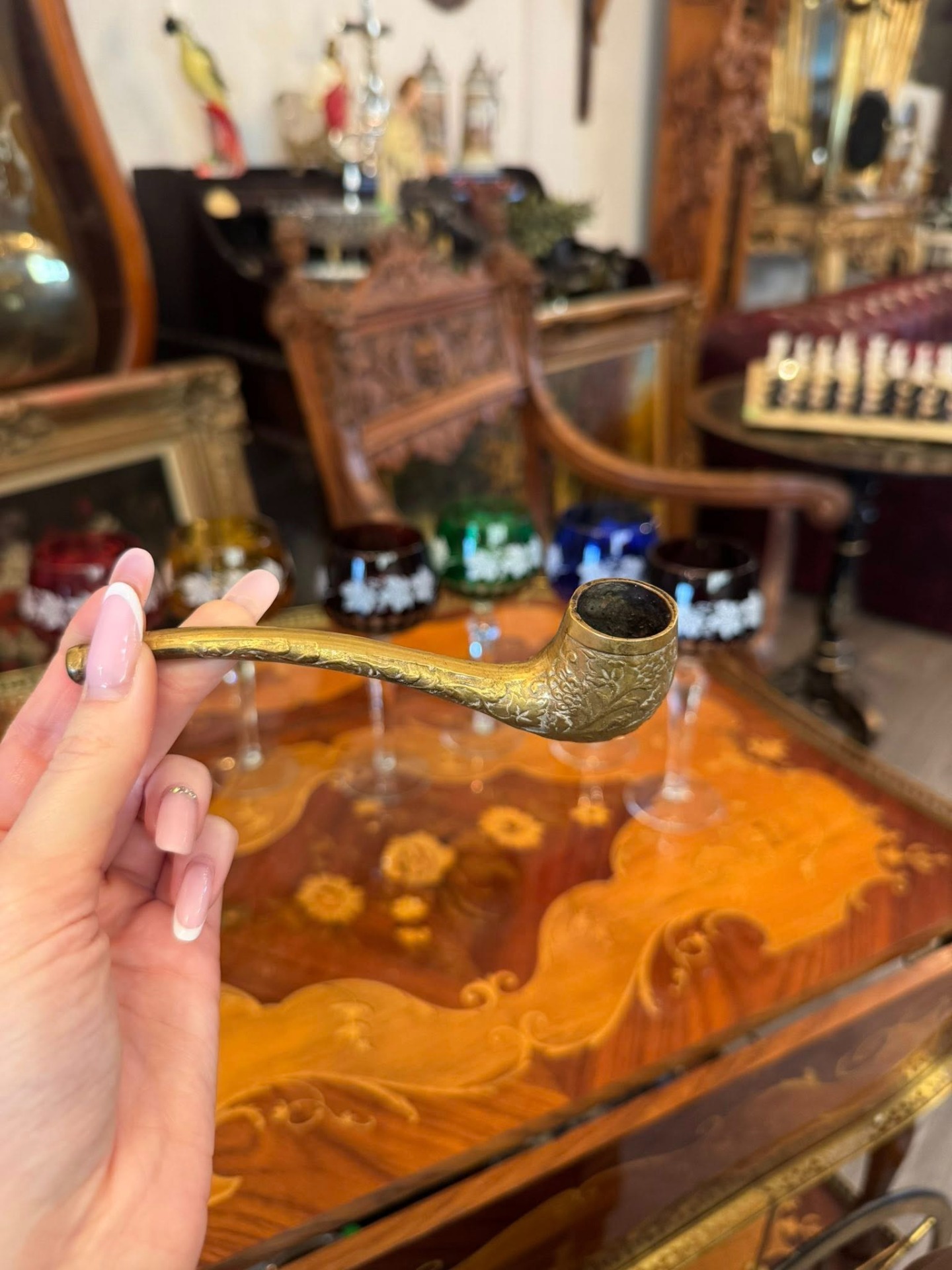 Pipă decorativă deosebită din bronz, realizată într-un stil clasic, bogat ornamentat, datând din perioada Belle Époque.(începutul secolului XX)