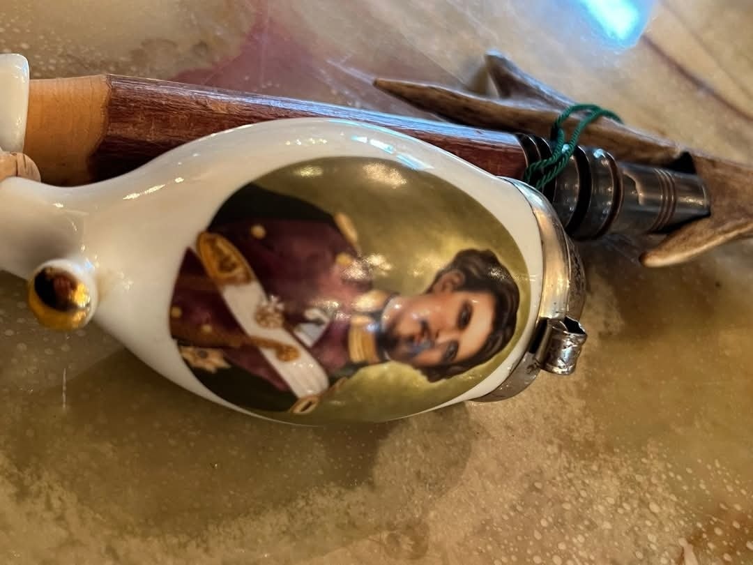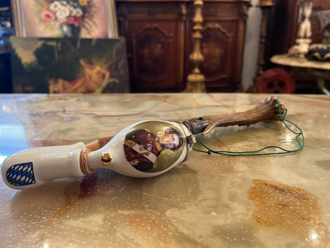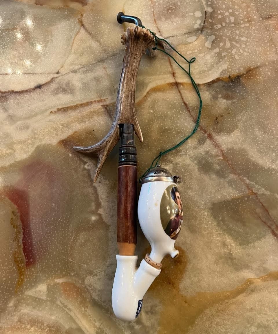 Pipă tradițională de vânătoare, model rar, cu mâner realizat din corn natural de cerb și compartiment din porțelan pictat manual cu portret regal.