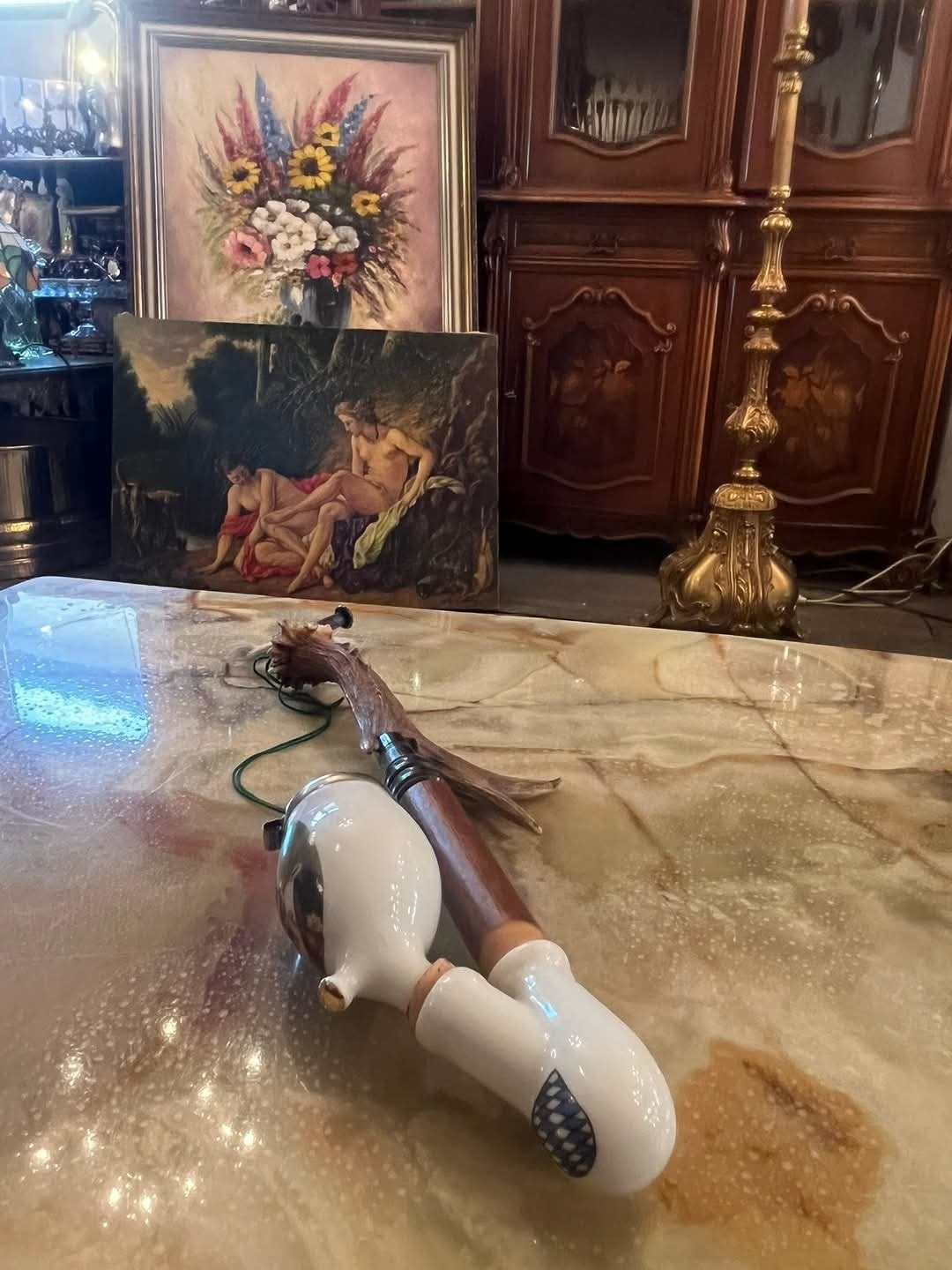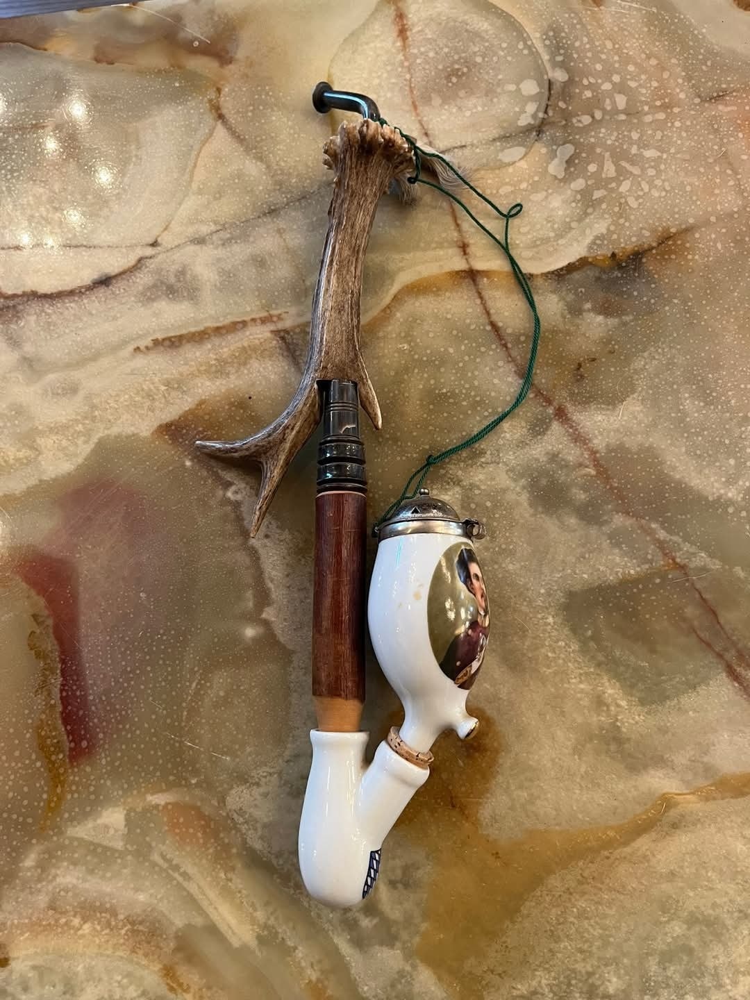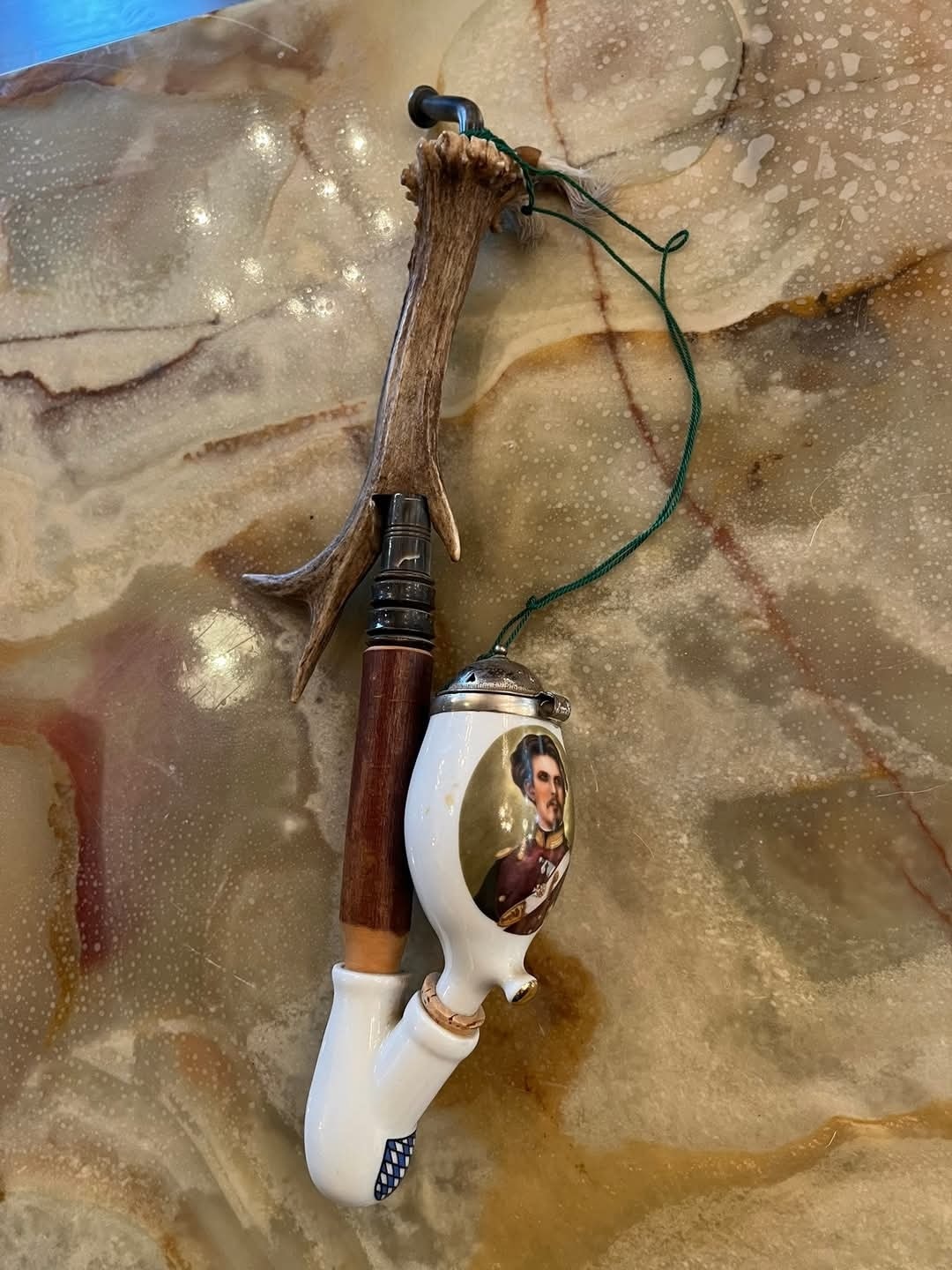 Pipă tradițională de vânătoare, model rar, cu mâner realizat din corn natural de cerb și compartiment din porțelan pictat manual cu portret regal.