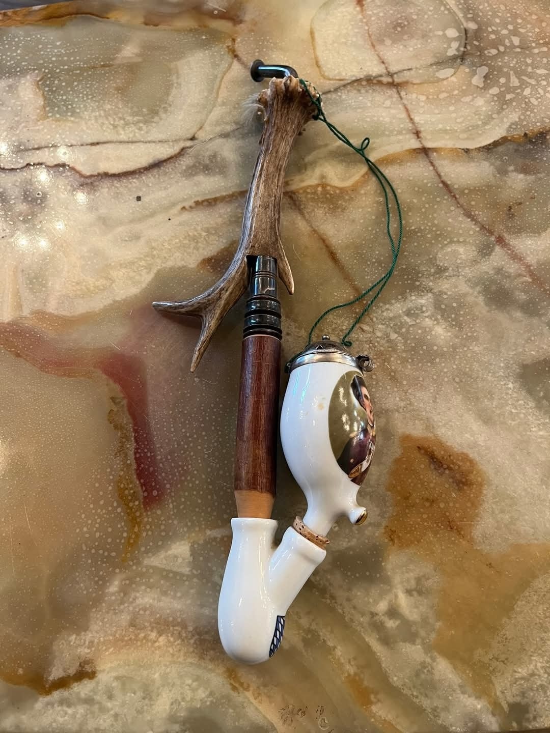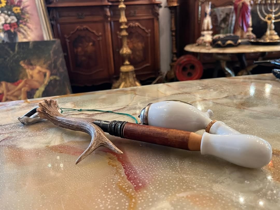 Pipă tradițională de vânătoare, model rar, cu mâner realizat din corn natural de cerb,
