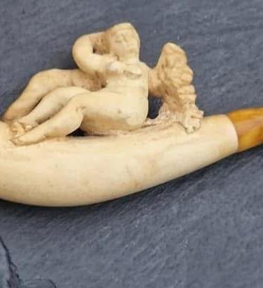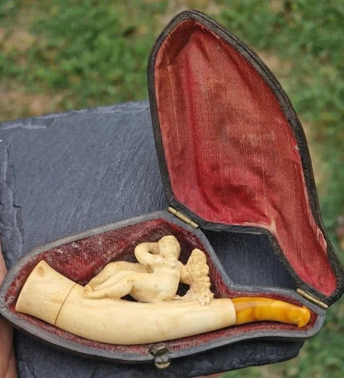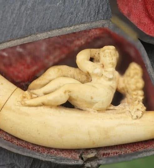 Pipă veche, victoriană din spumă de mare, sculptura cu temă erotică, în cutia originală (sf.sec.XX)