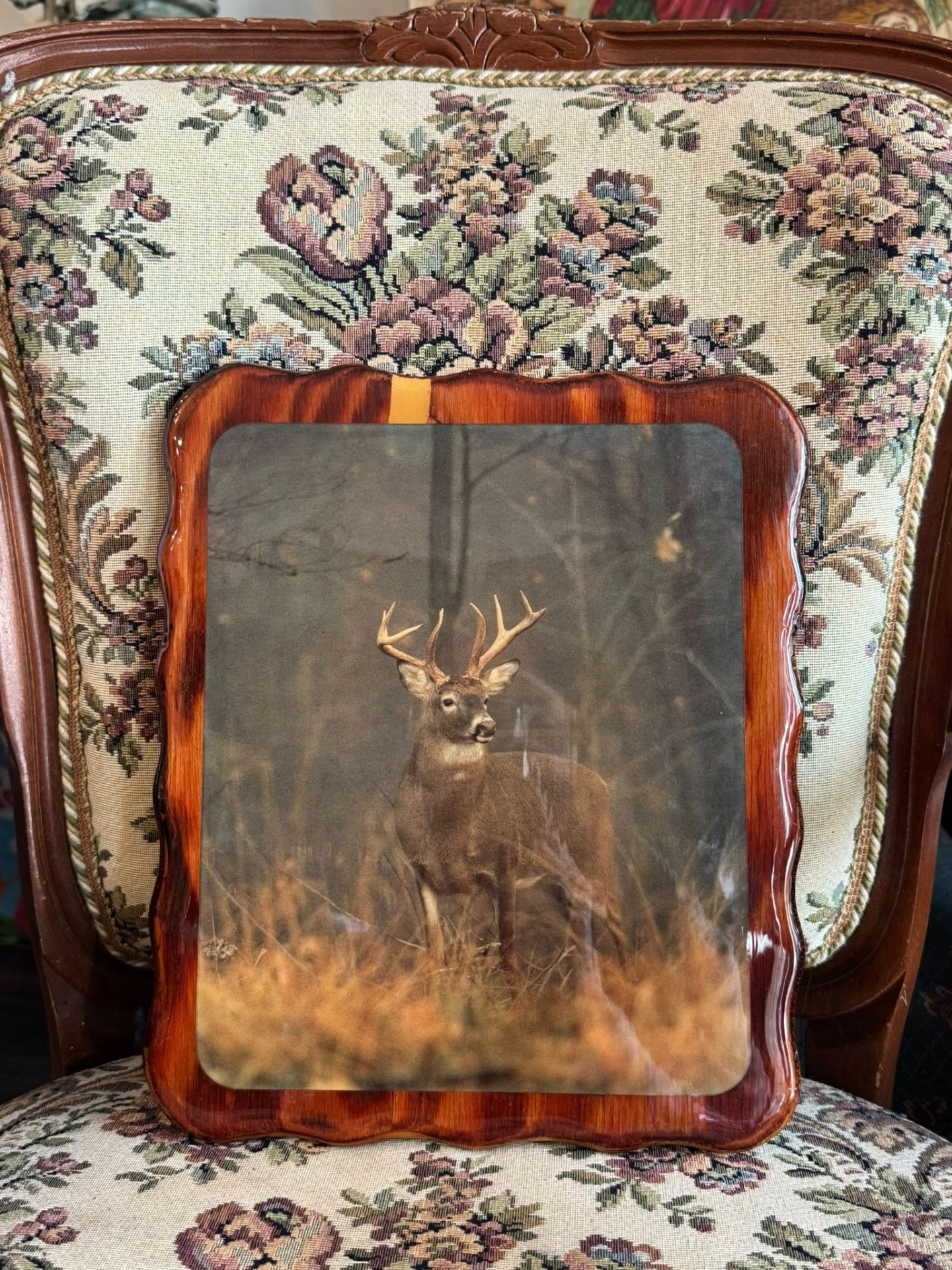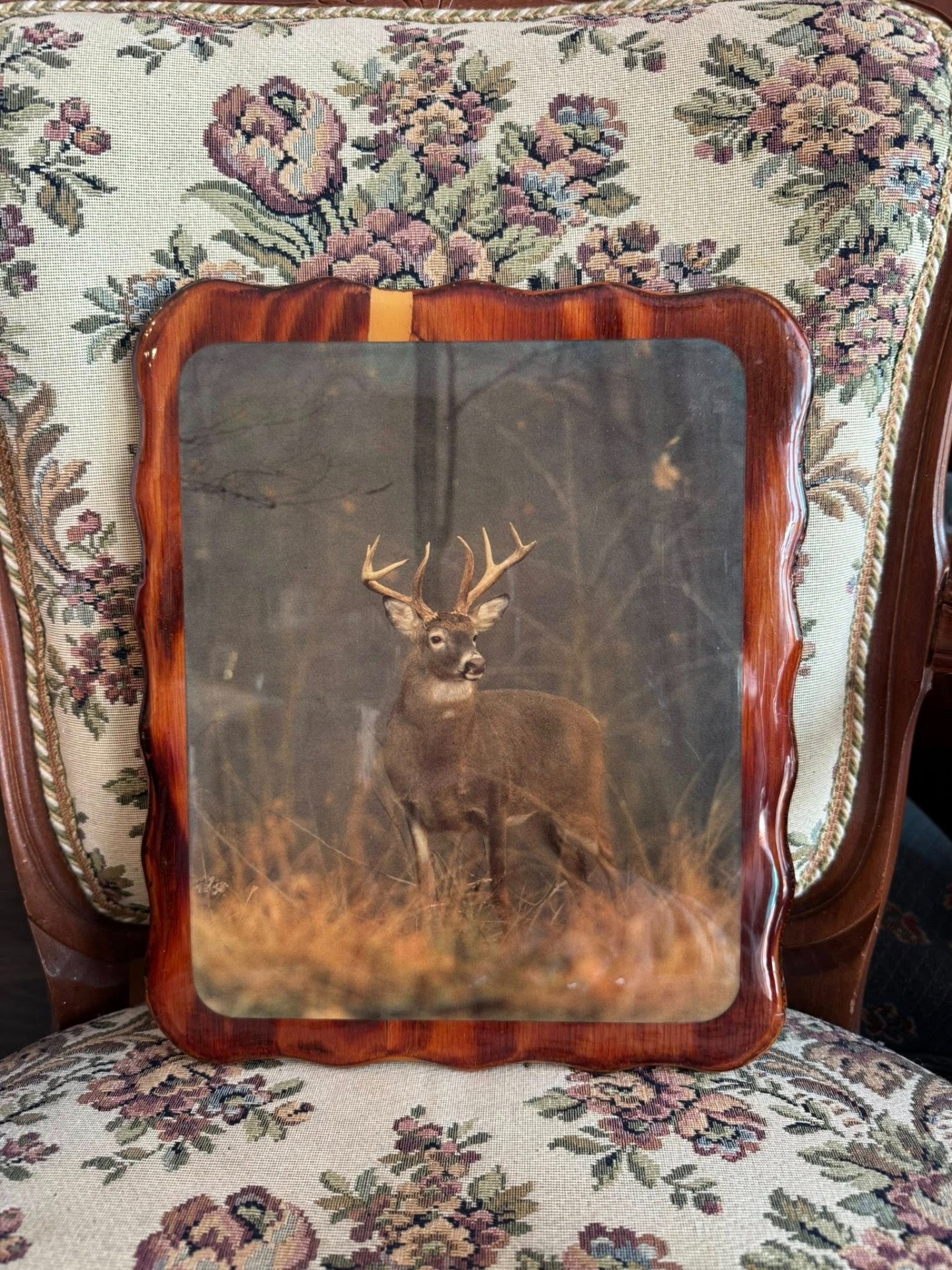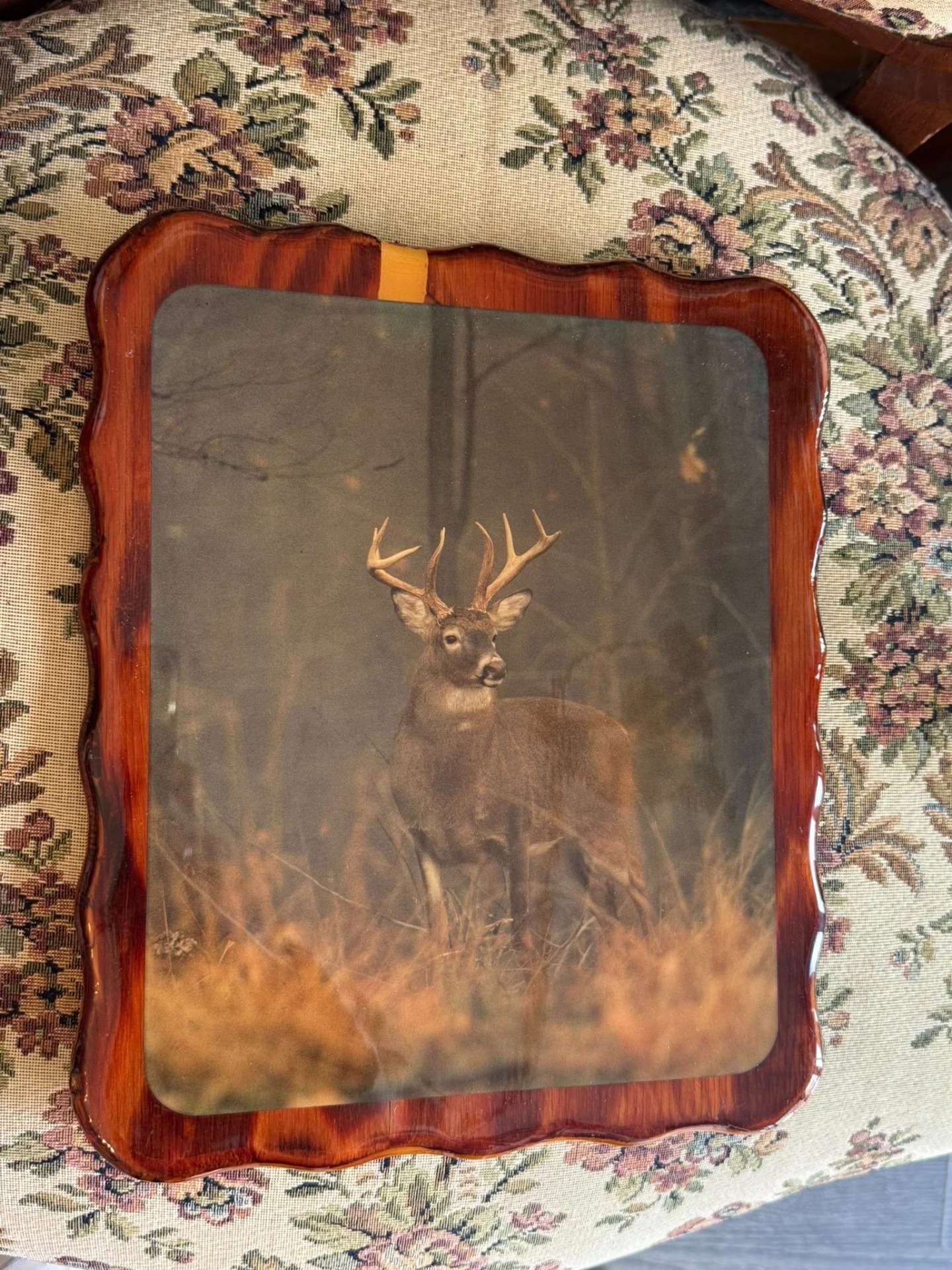 Placă decorativă realizata dintr-o imprimare cu cerb aplicată pe un suport de lemn și apoi lăcuită sau încapsulată în rășină.