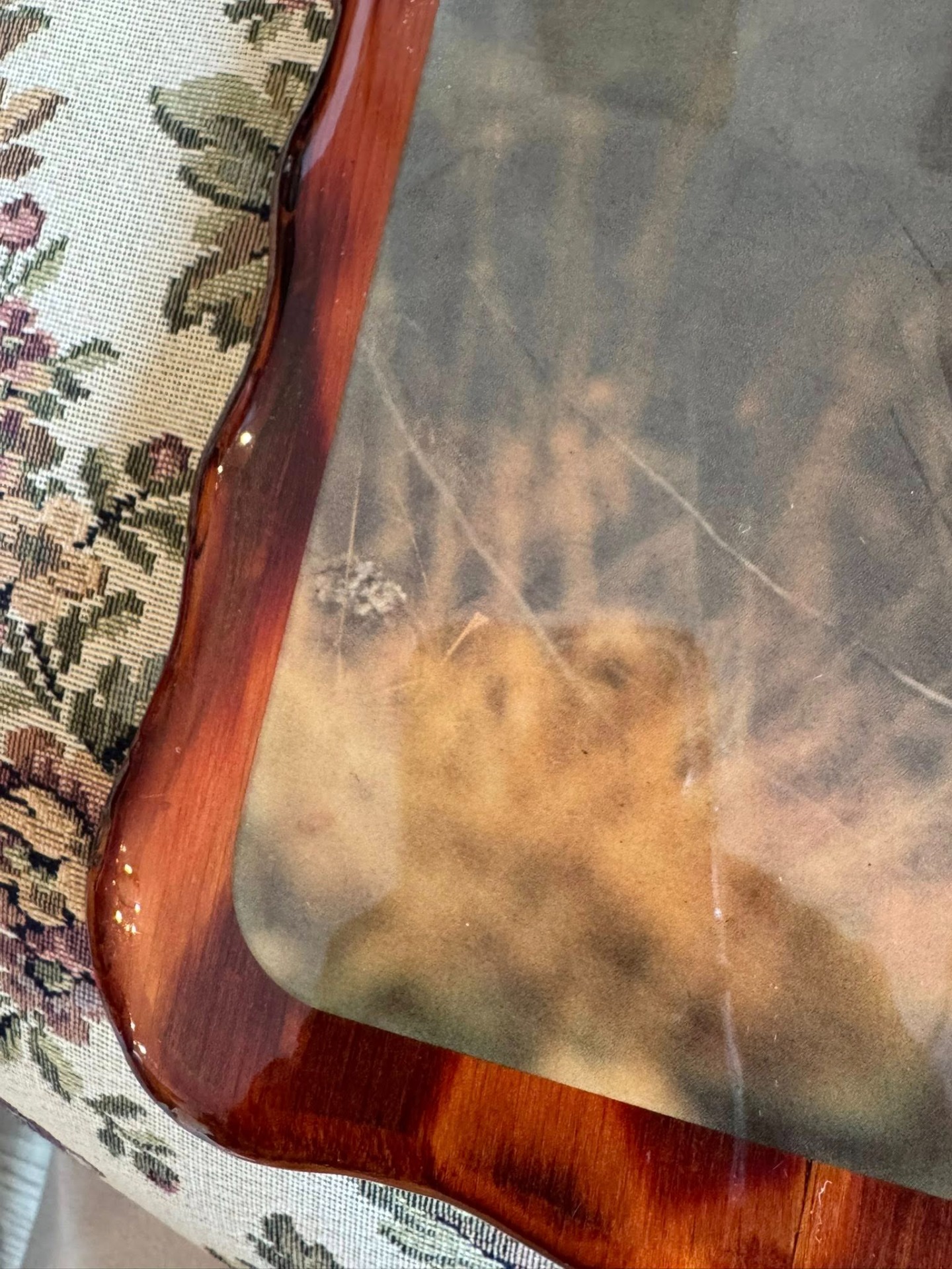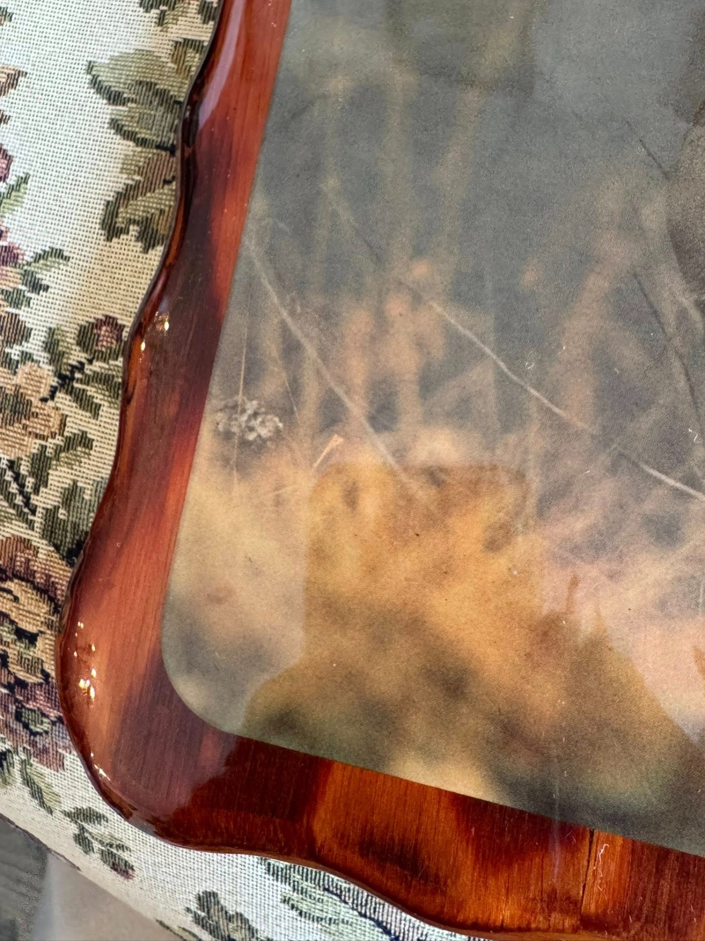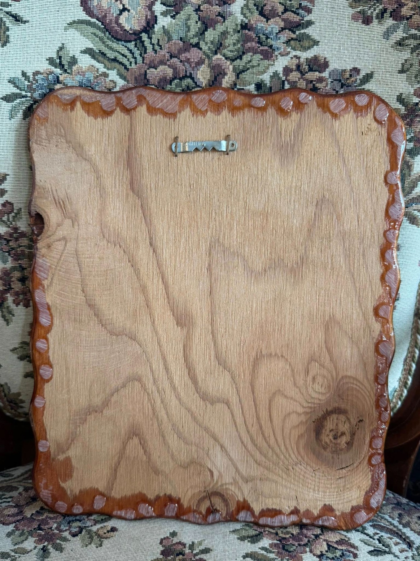 Placă decorativă realizata dintr-o imprimare cu cerb aplicată pe un suport de lemn și apoi lăcuită sau încapsulată în rășină.