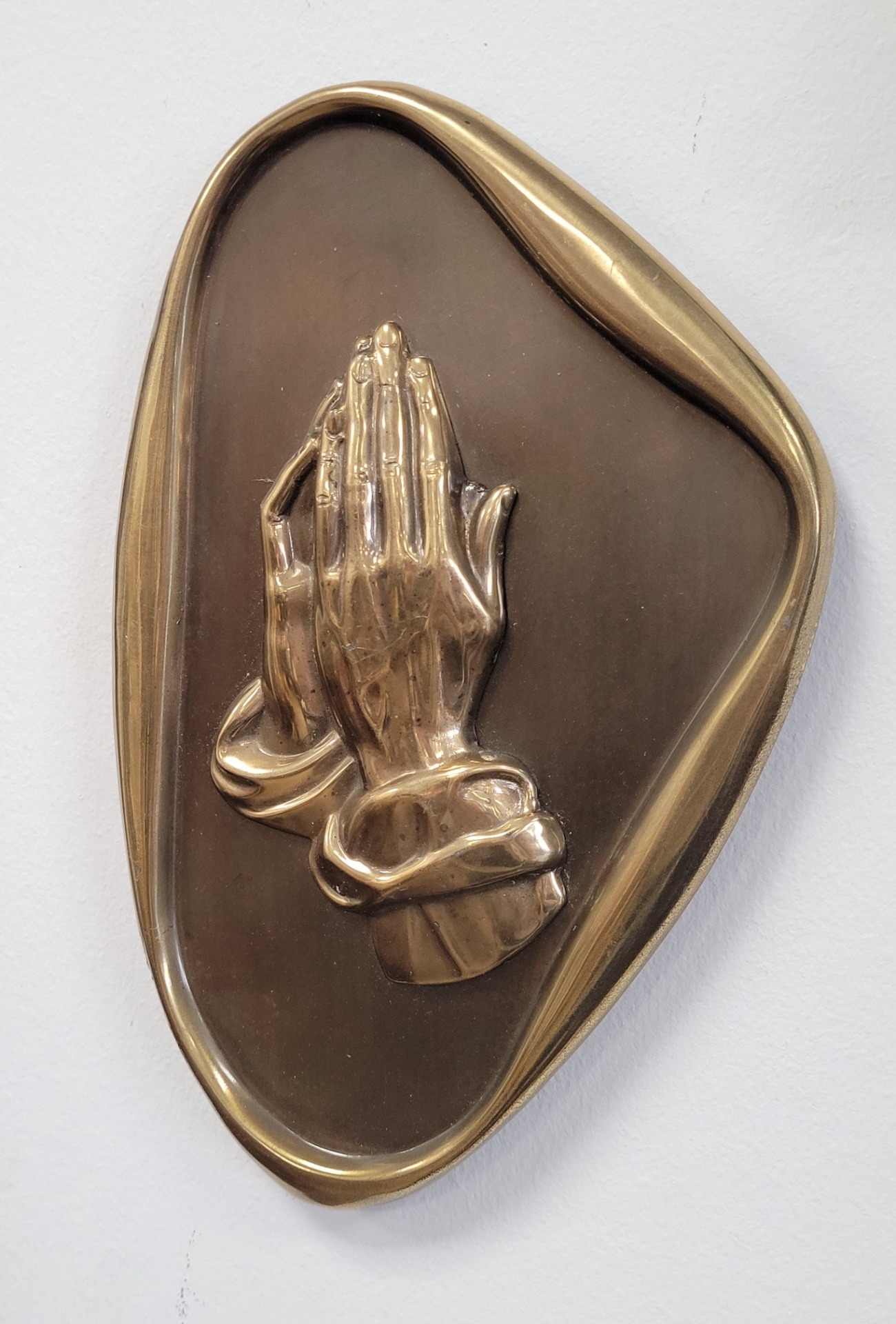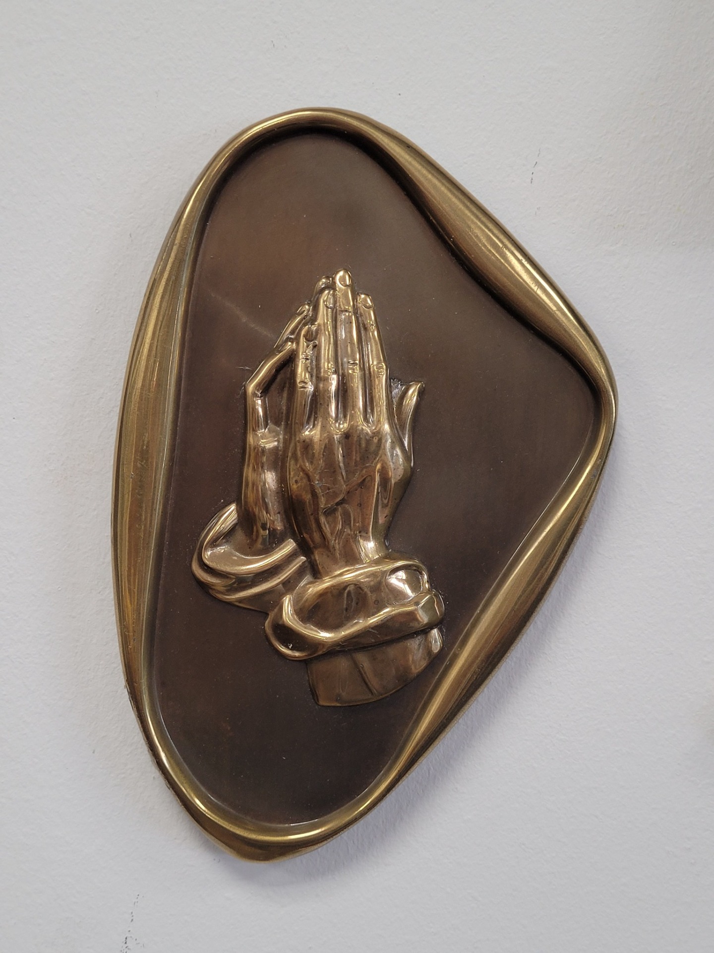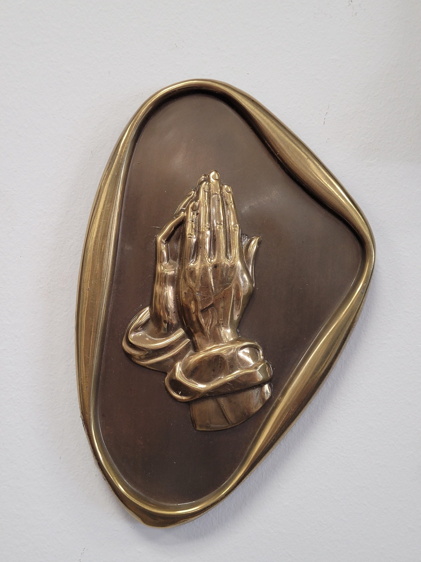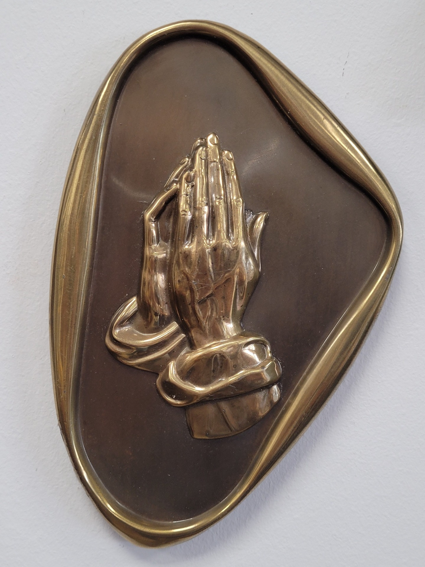 Plachetă decorativă de perete, din bronz, reprezentând iconicul simbol al credinței „Praying Hands” (Mâinile în rugăciune). Piesa se remarcă prin rama cu formă neregulată, organică, specifică designului Mid-Century Modern (anii '50-'60).