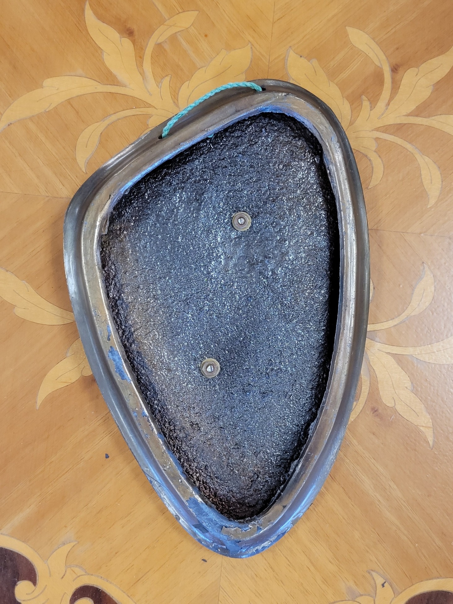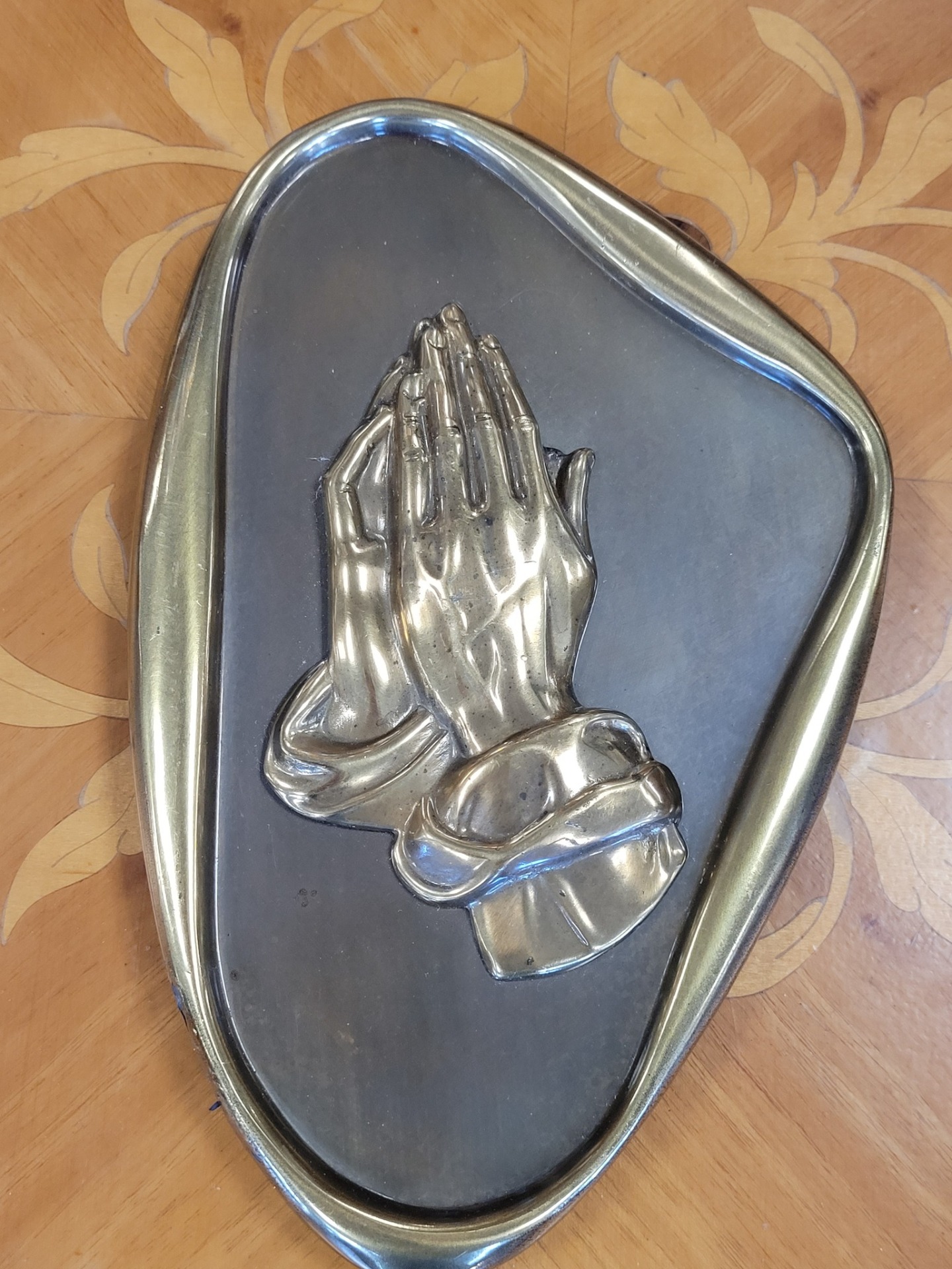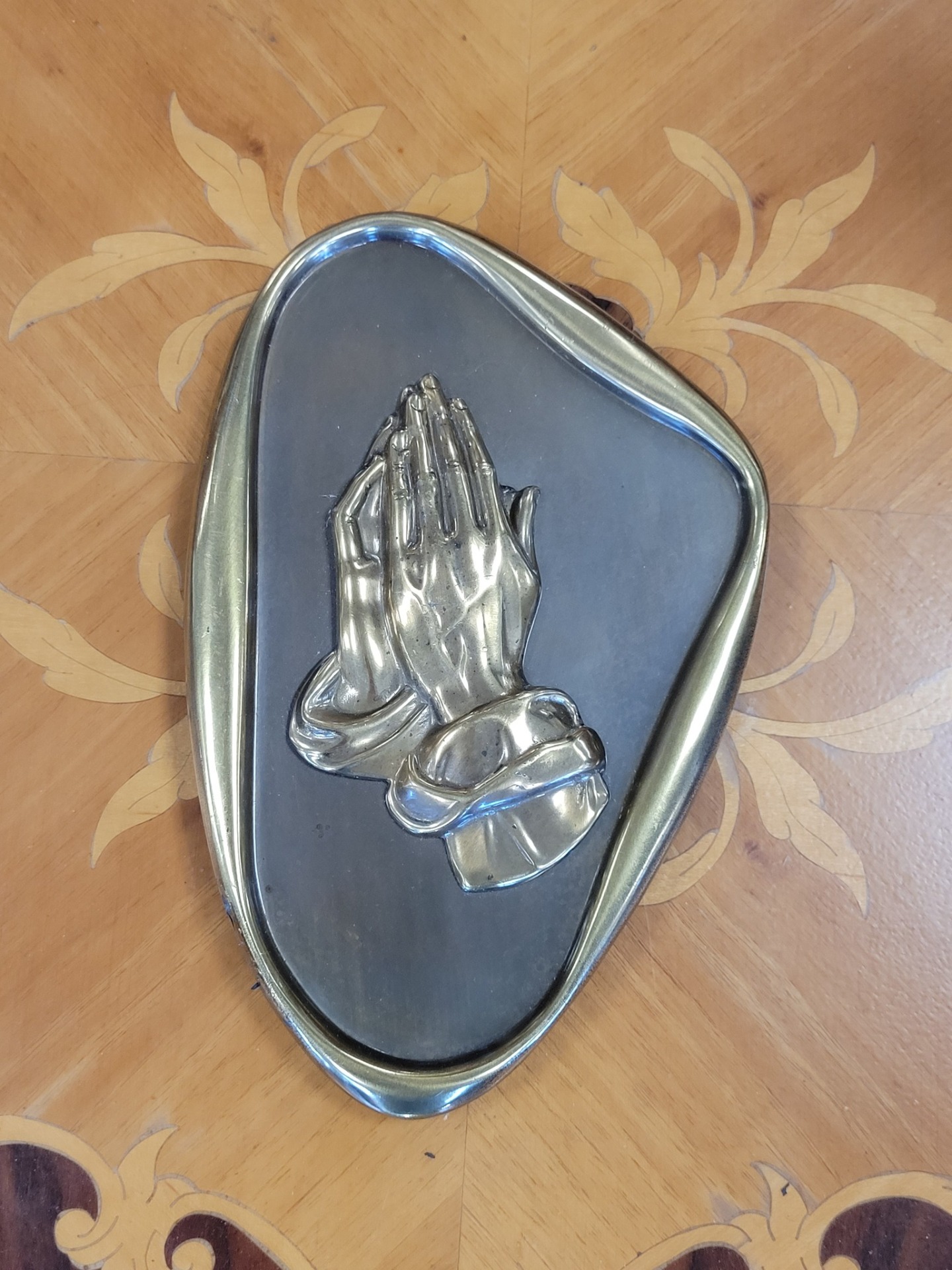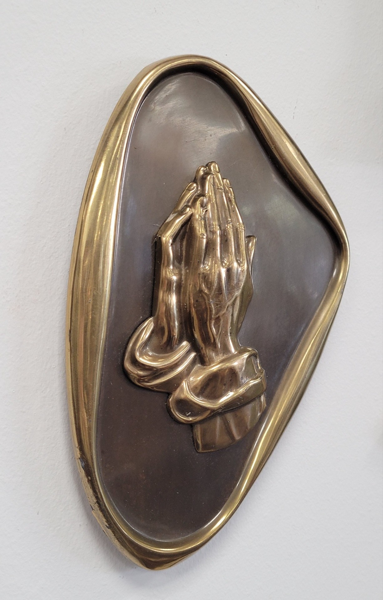 Plachetă decorativă de perete, din bronz, reprezentând iconicul simbol al credinței „Praying Hands” (Mâinile în rugăciune). Piesa se remarcă prin rama cu formă neregulată, organică, specifică designului Mid-Century Modern (anii '50-'60).