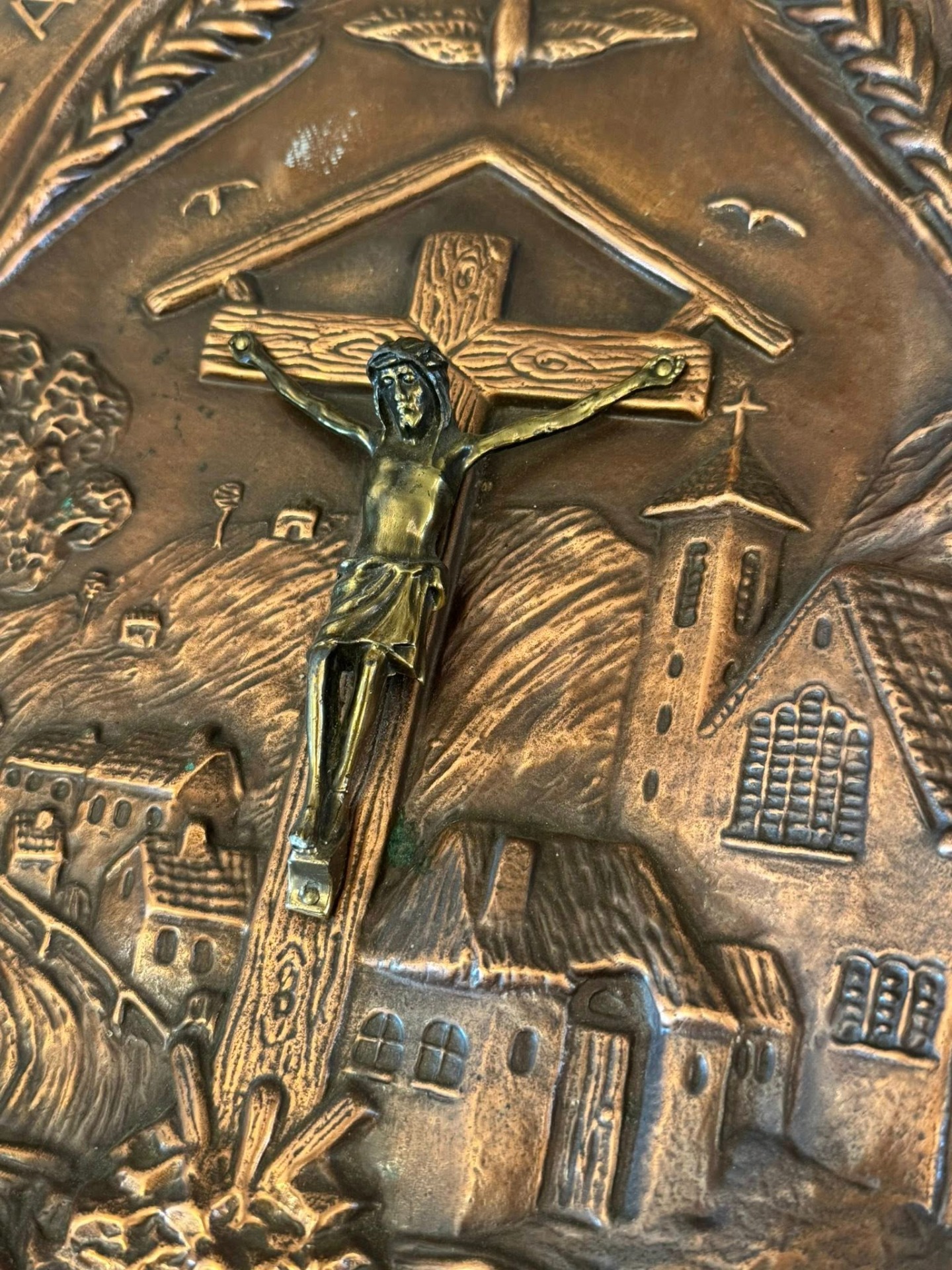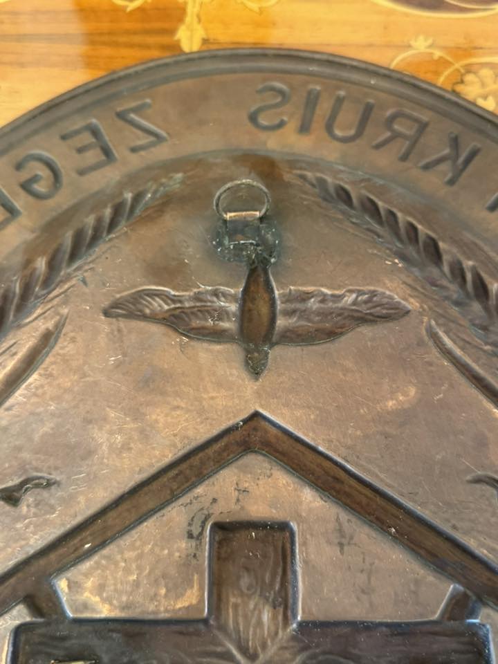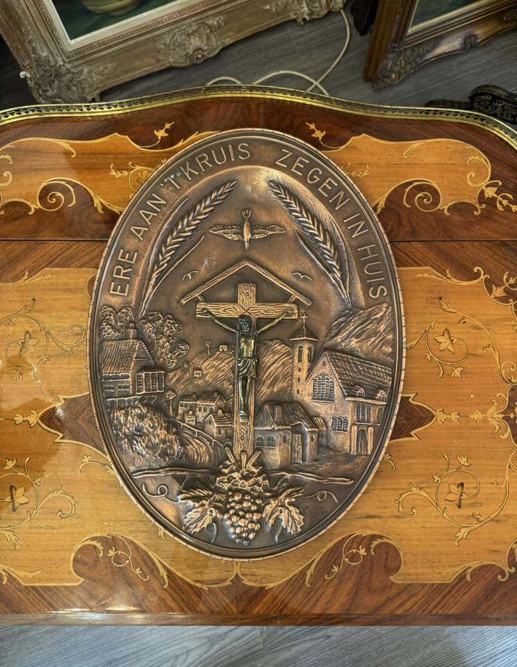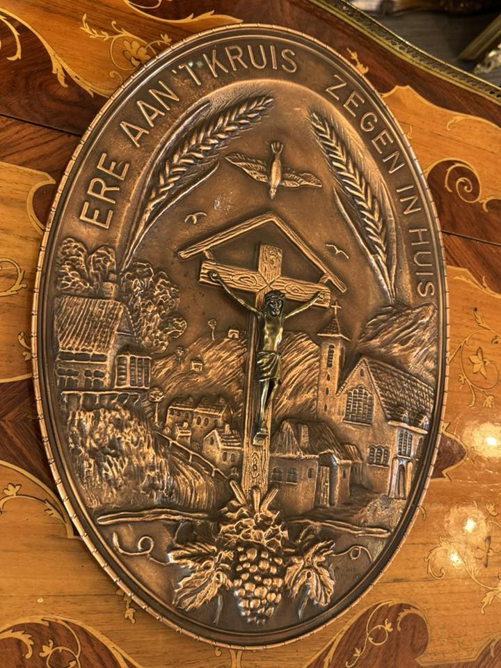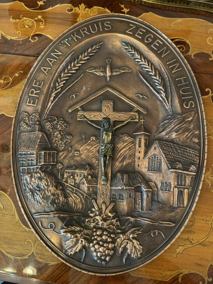 Plachetă religioasă decorativă de perete din cupru cu statuetă din bronz. Inscripția de pe margine este în limba olandeză: "ERE AAN 'T KRUIS - ZEGEN IN HUIS", ceea ce se traduce prin "Slavă Crucii - Binecuvântare în casă". (cca 1950)