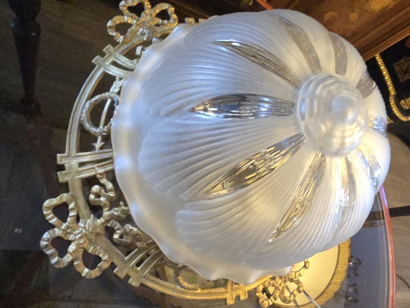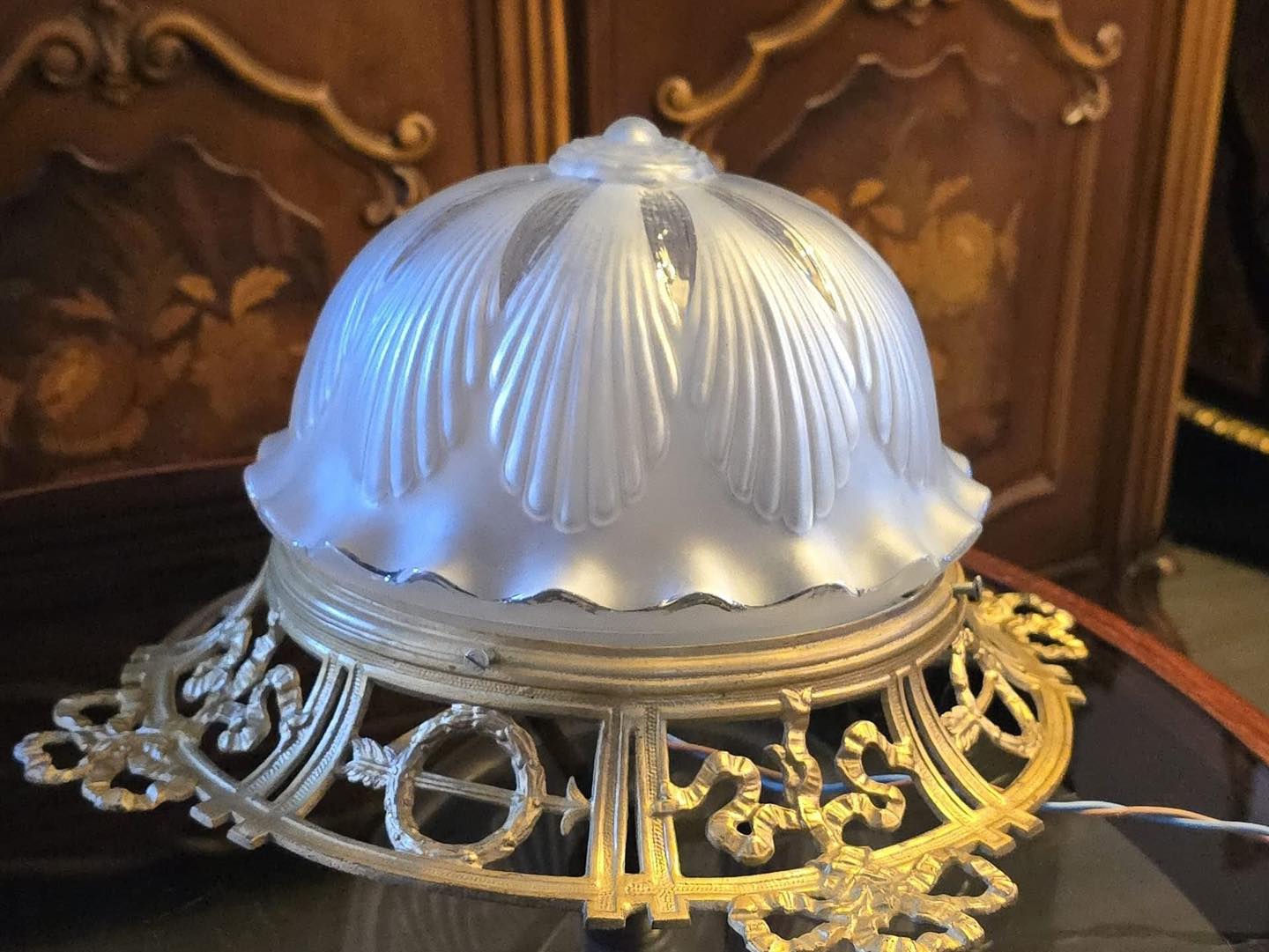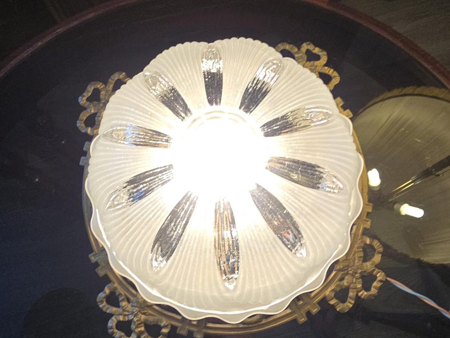 Abajurul din Sticlă: Cupola este realizată din sticlă mată (satinată), decorată cu nervuri radiale ce imită petalele unei flori sau o scoică.