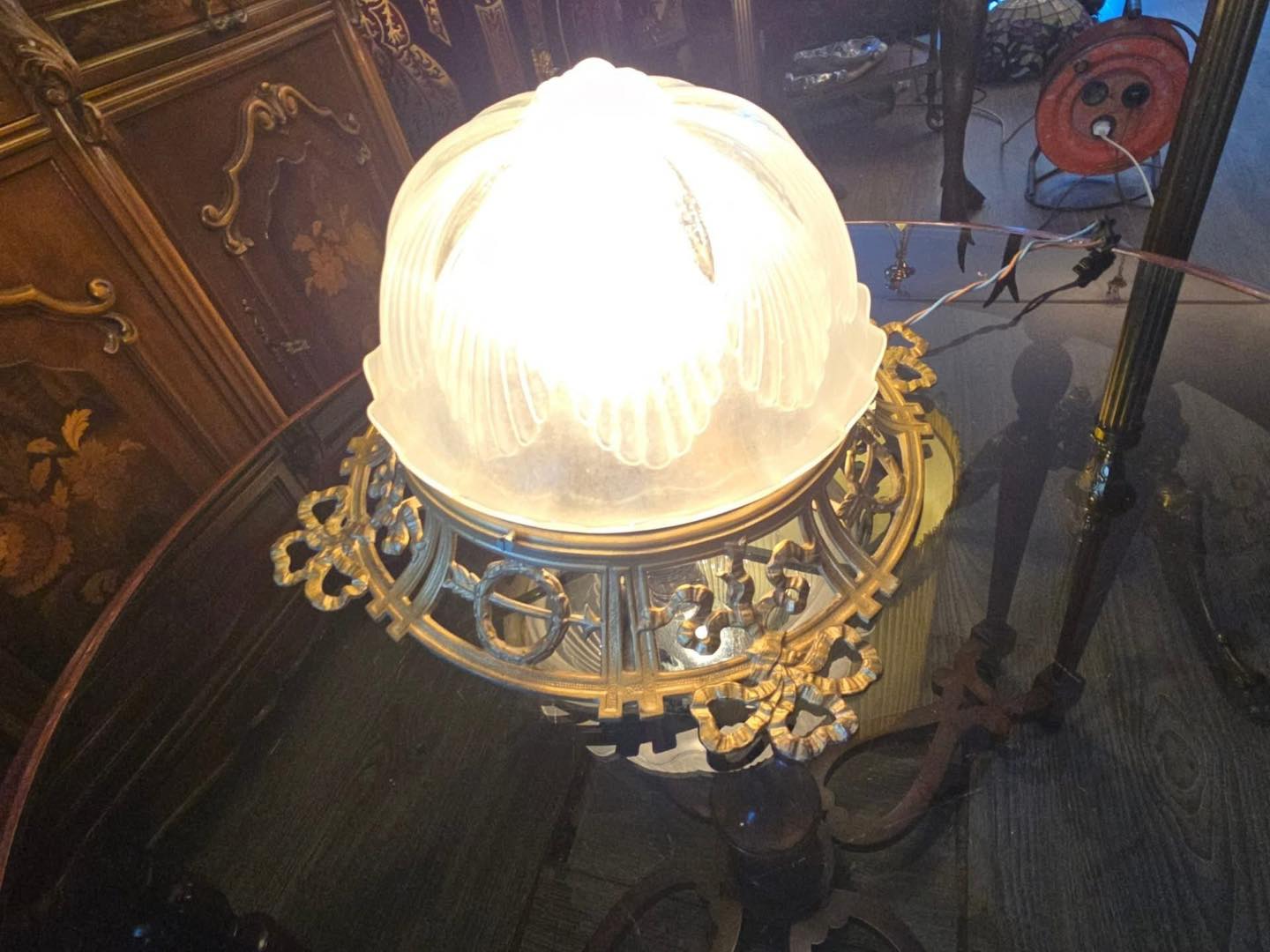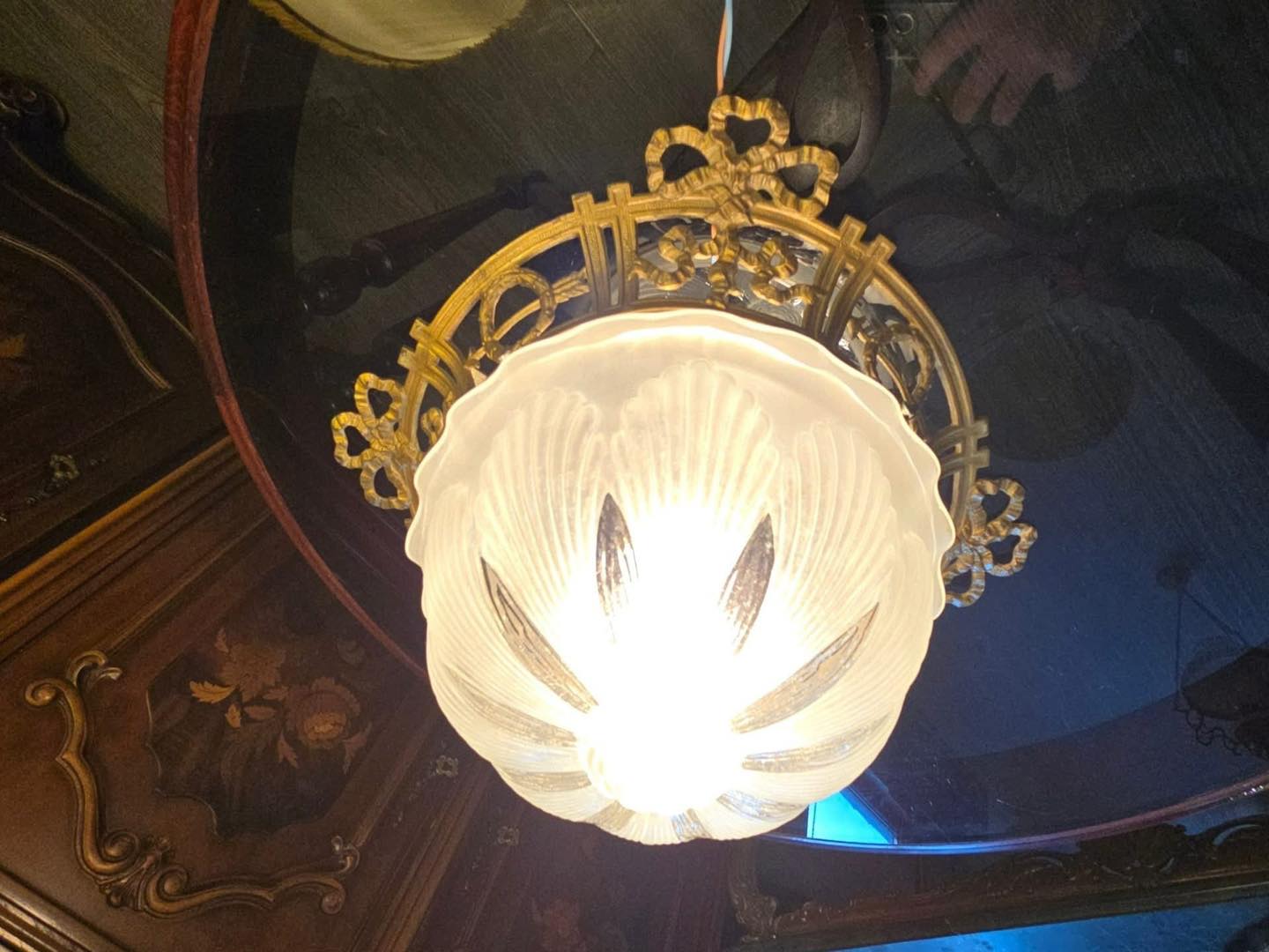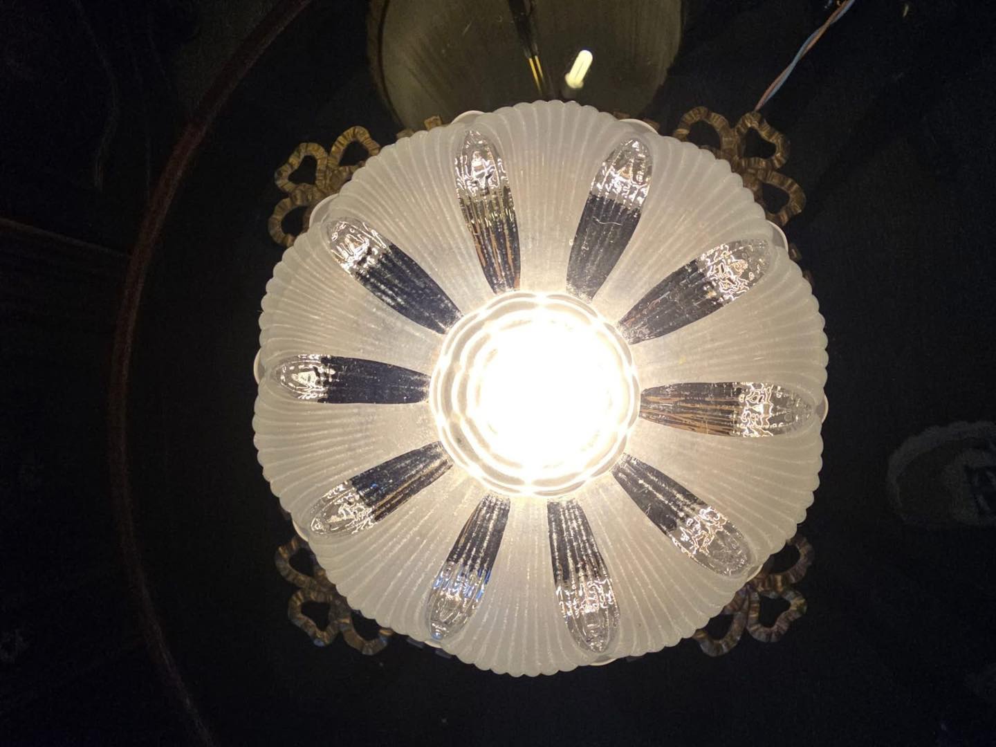 Abajurul din Sticlă: Cupola este realizată din sticlă mată (satinată), decorată cu nervuri radiale ce imită petalele unei flori sau o scoică.