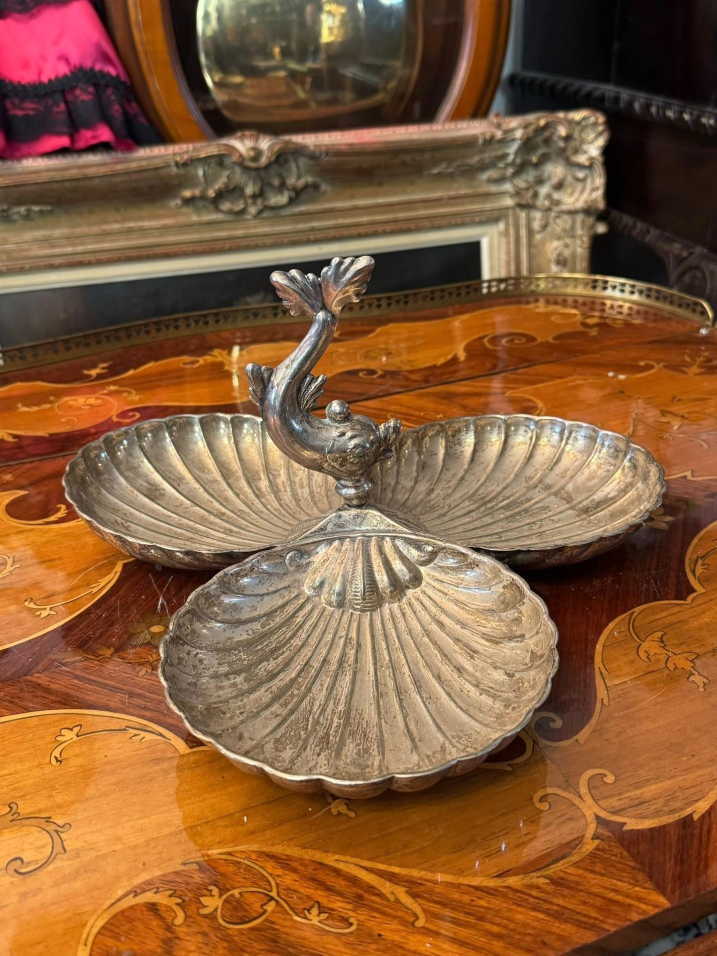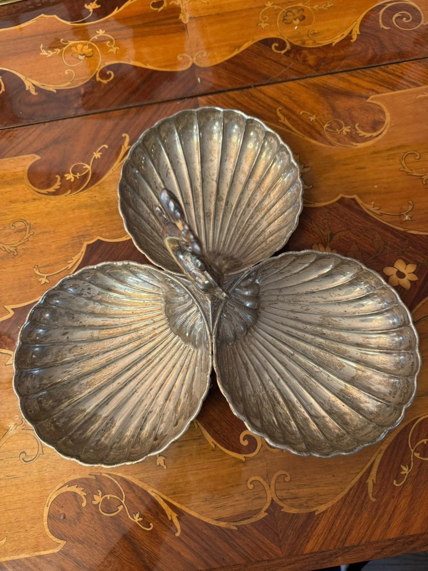 Platou de servire din metal argintat,compus din trei compartimente în formă de scoică.