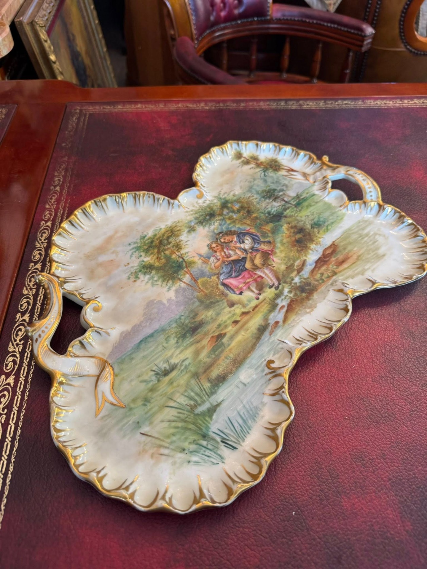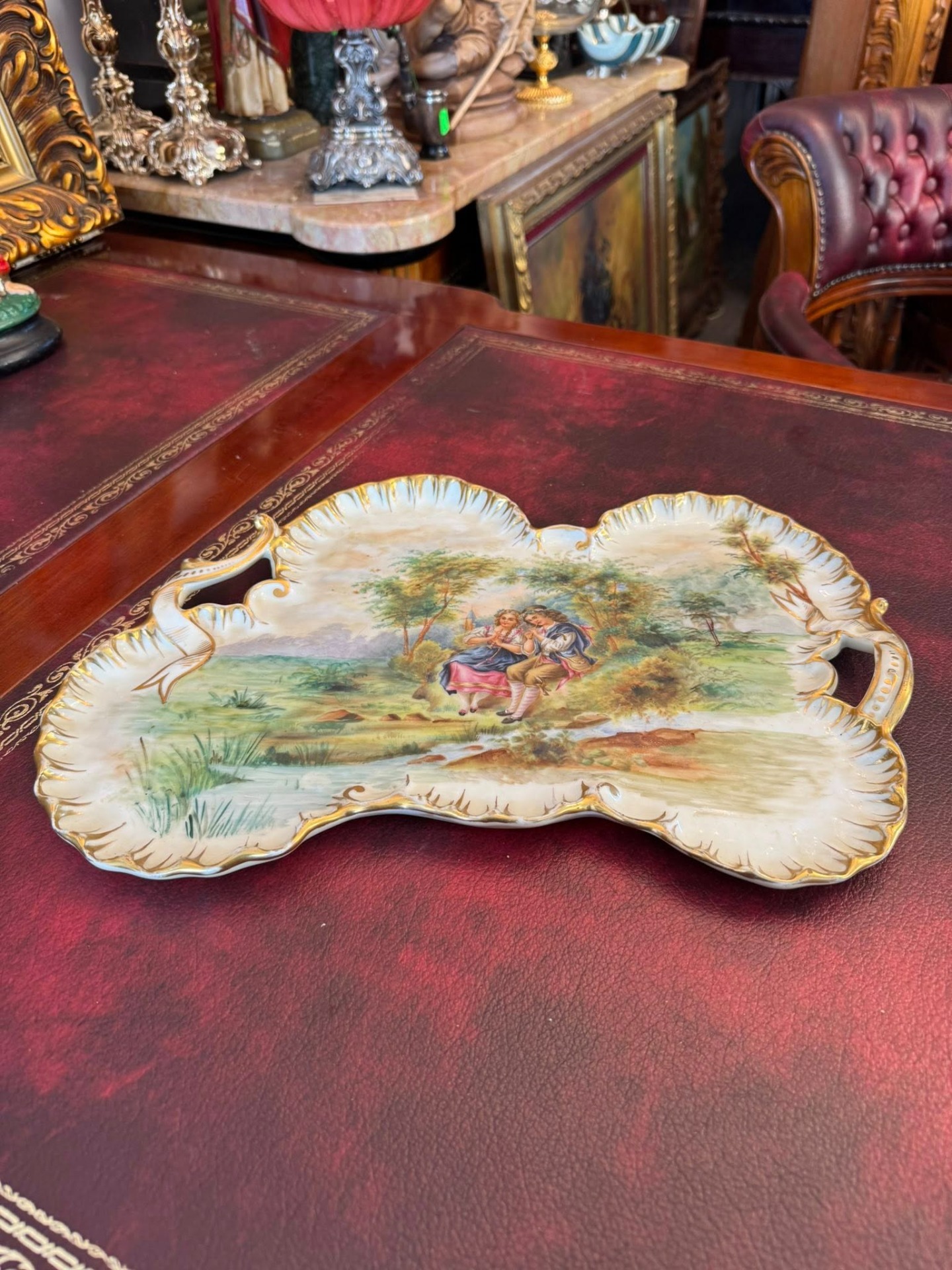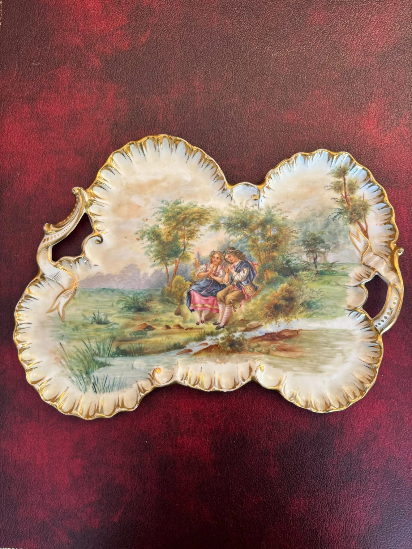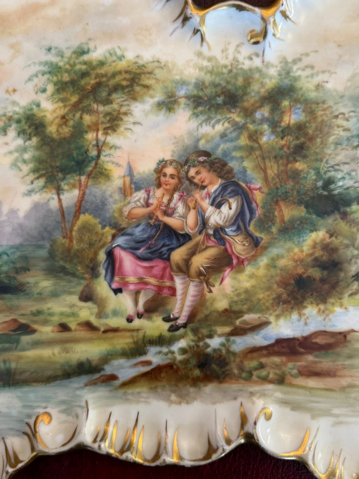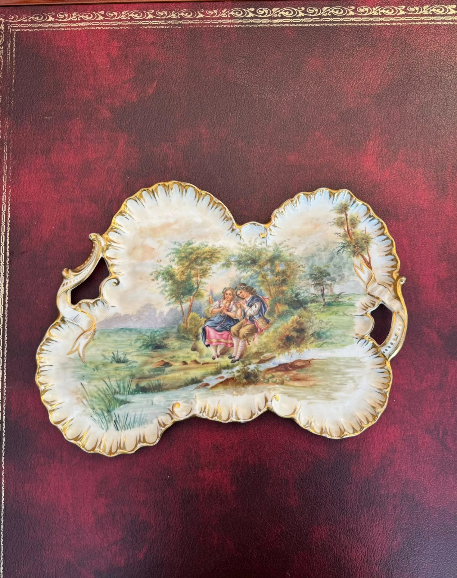 Platou de servire din porțelan, realizat în stil Rococo cu motive romantice (Ungaria, cca 1910)
