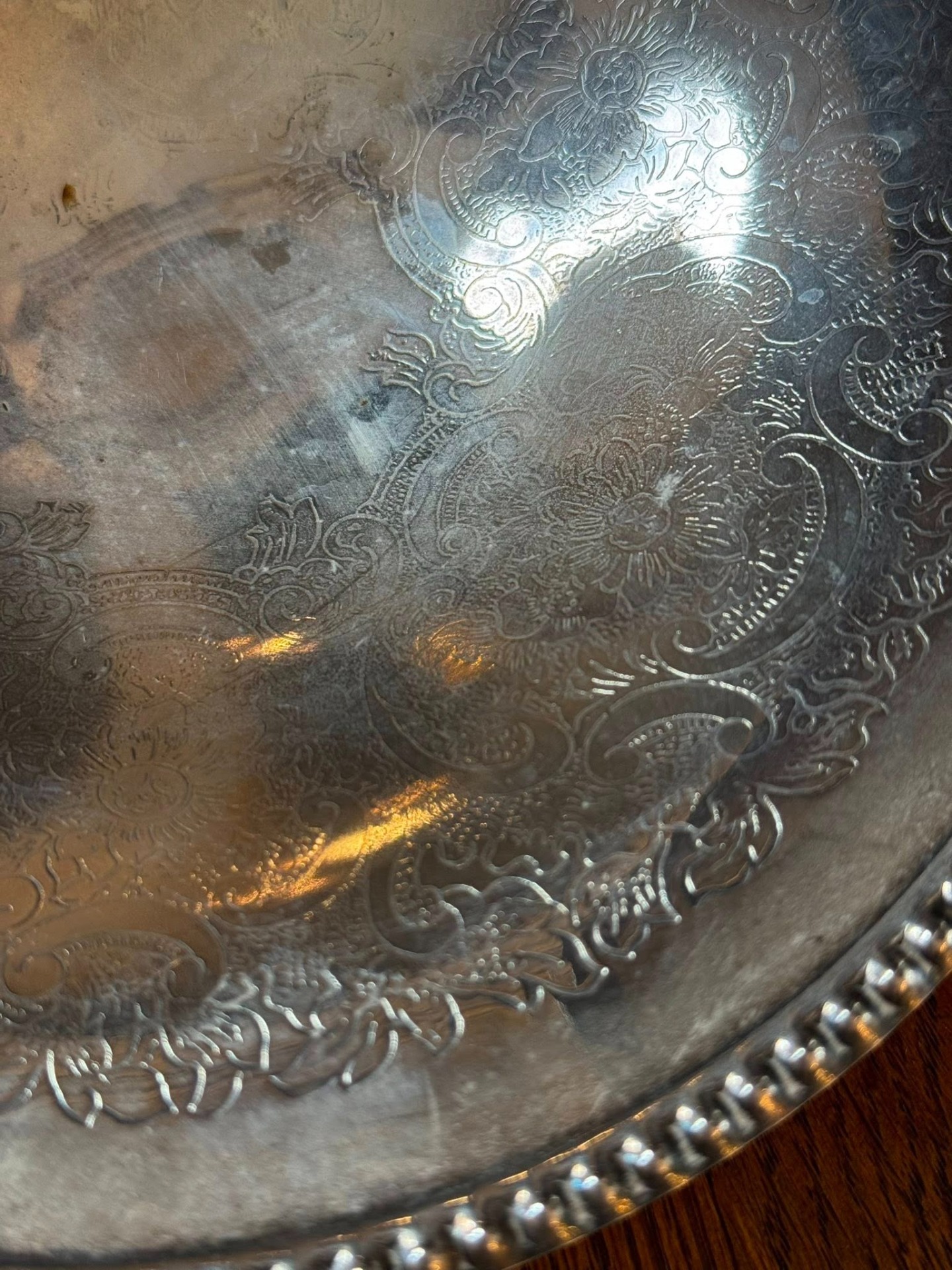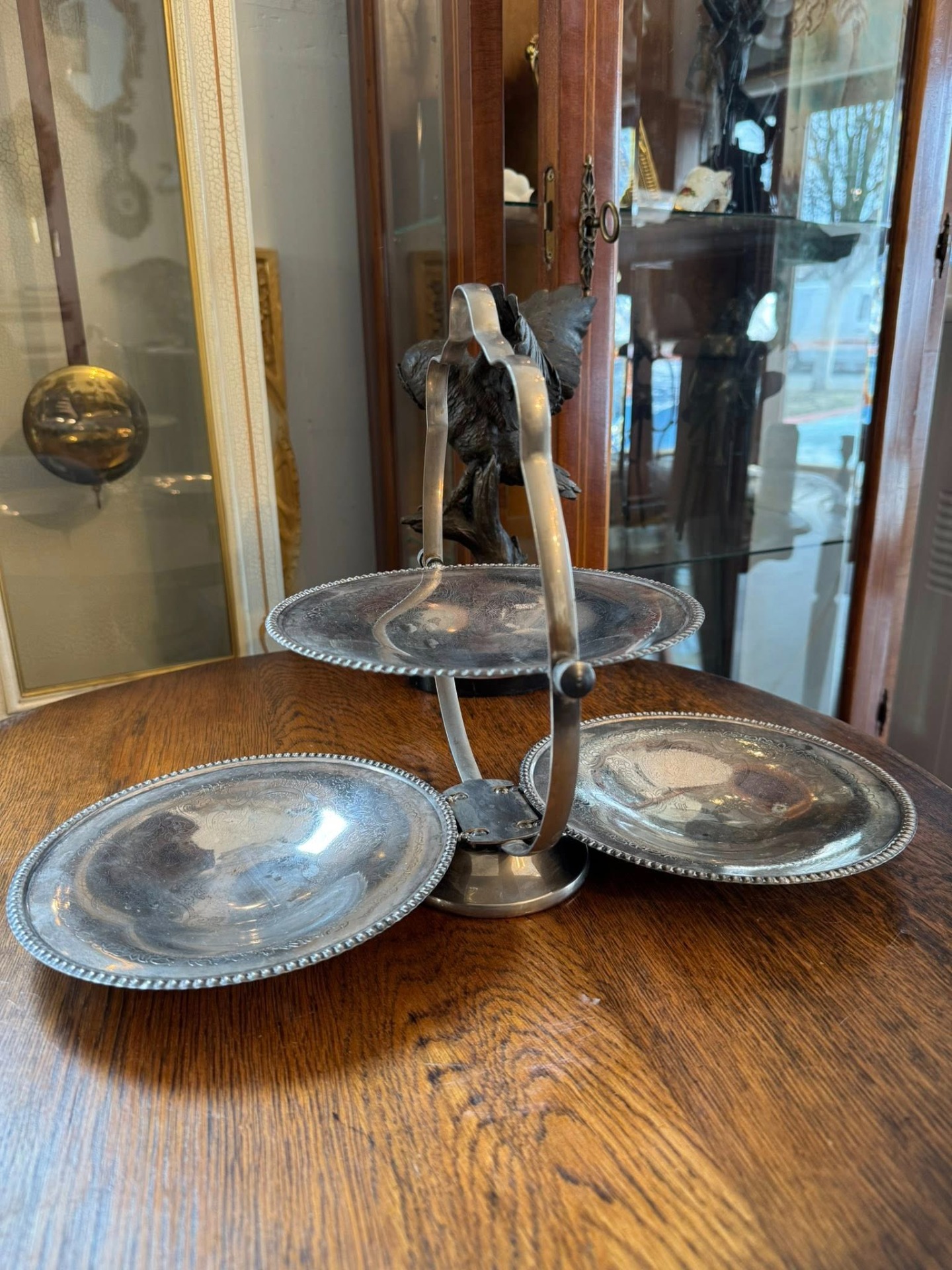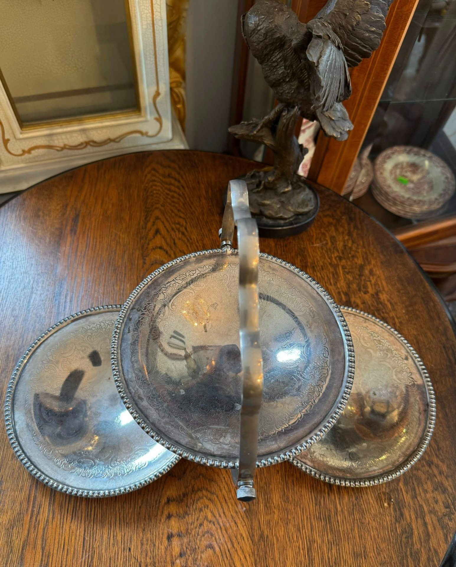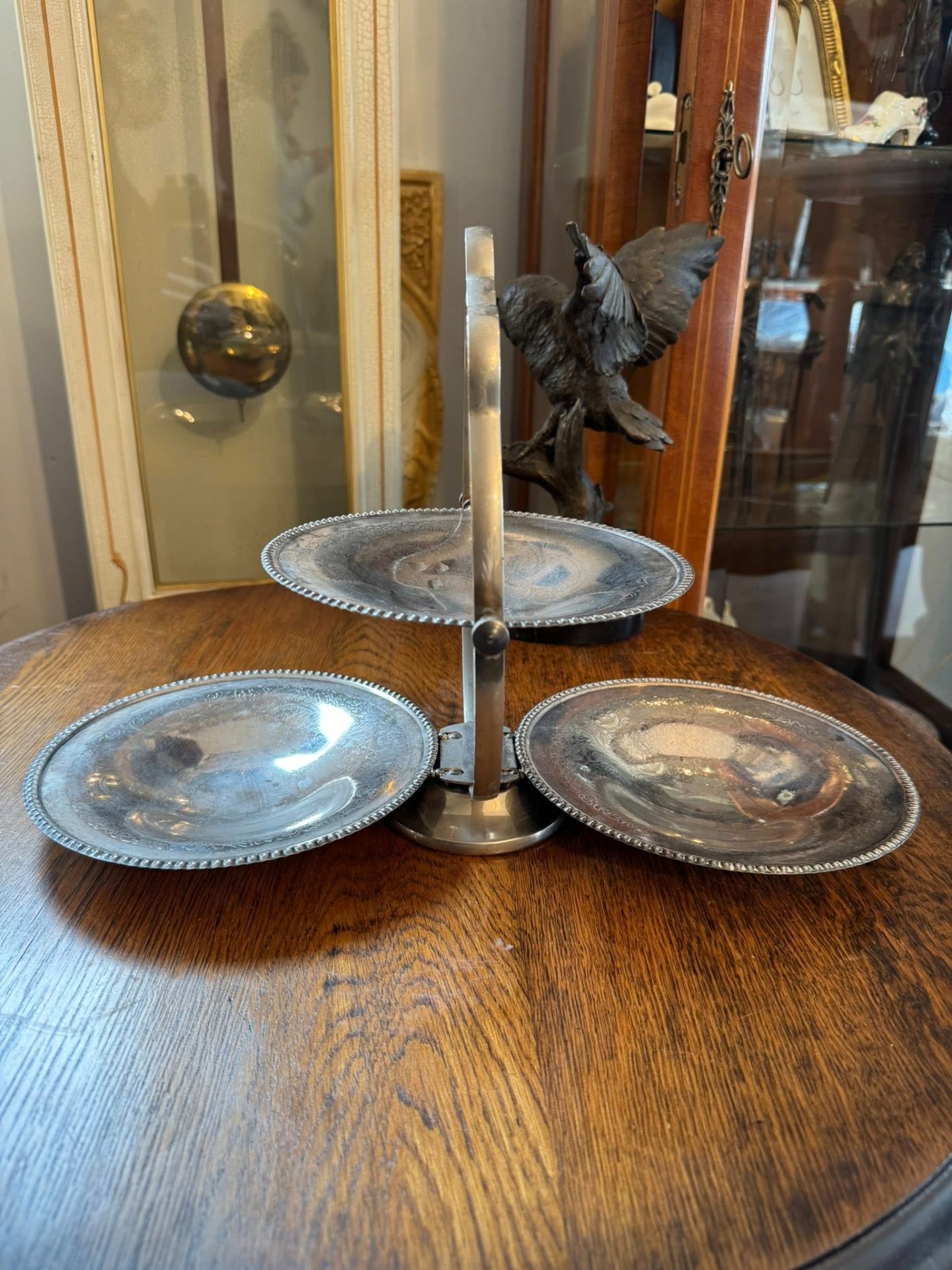 Platou de servire etajat, pliabil, realizat din metal argintat. Marginile farfuriilor sunt decorate cu o bordură perlată fină, iar suprafața metalului prezintă gravuri ornamentale elegante. (cca 1920,Anglia)