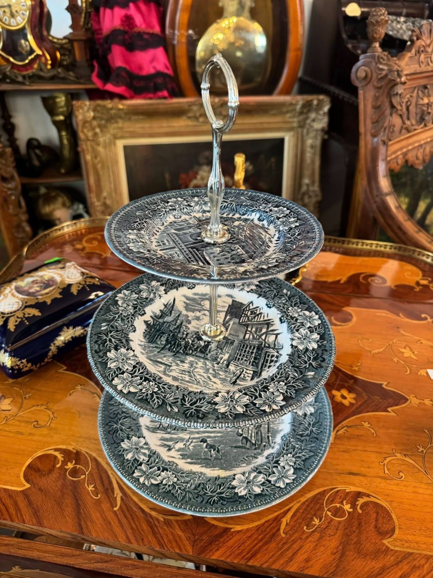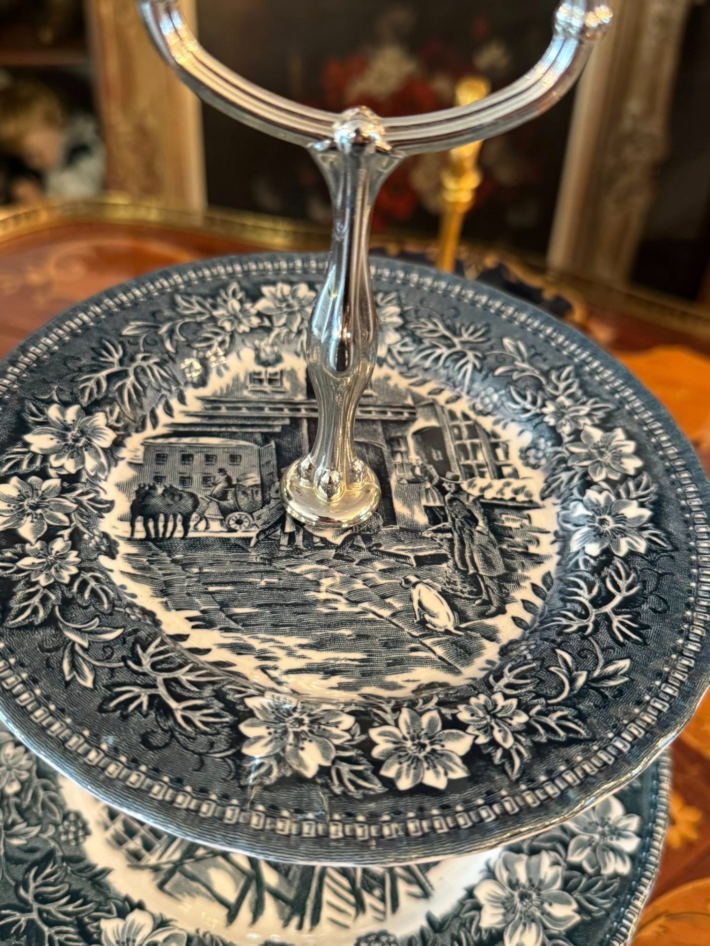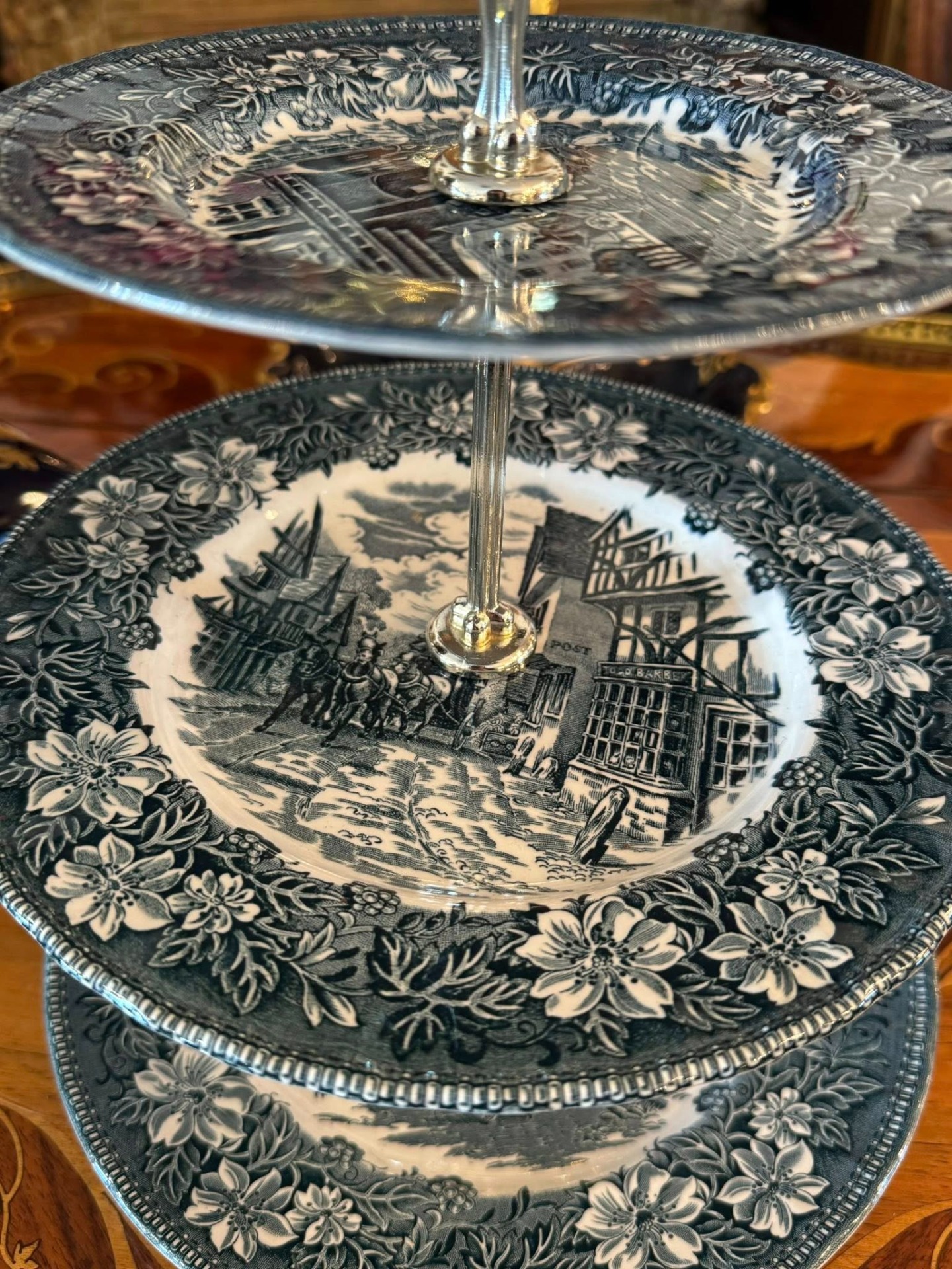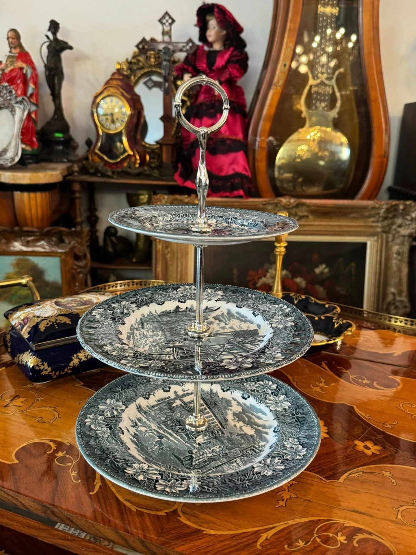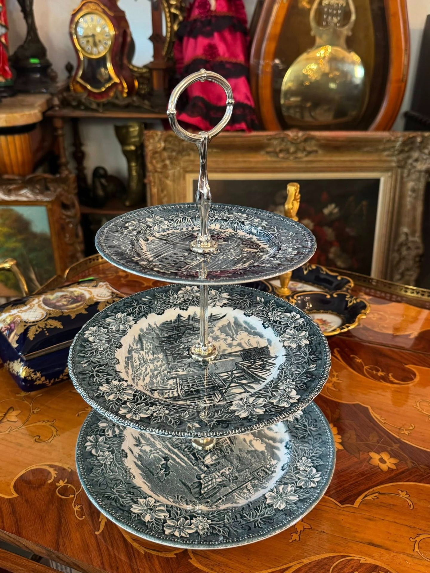 Platou etajat pentru servire (cunoscut sub denumirea de cake stand sau étagère), compus din trei niveluri, realizat din porțelan.