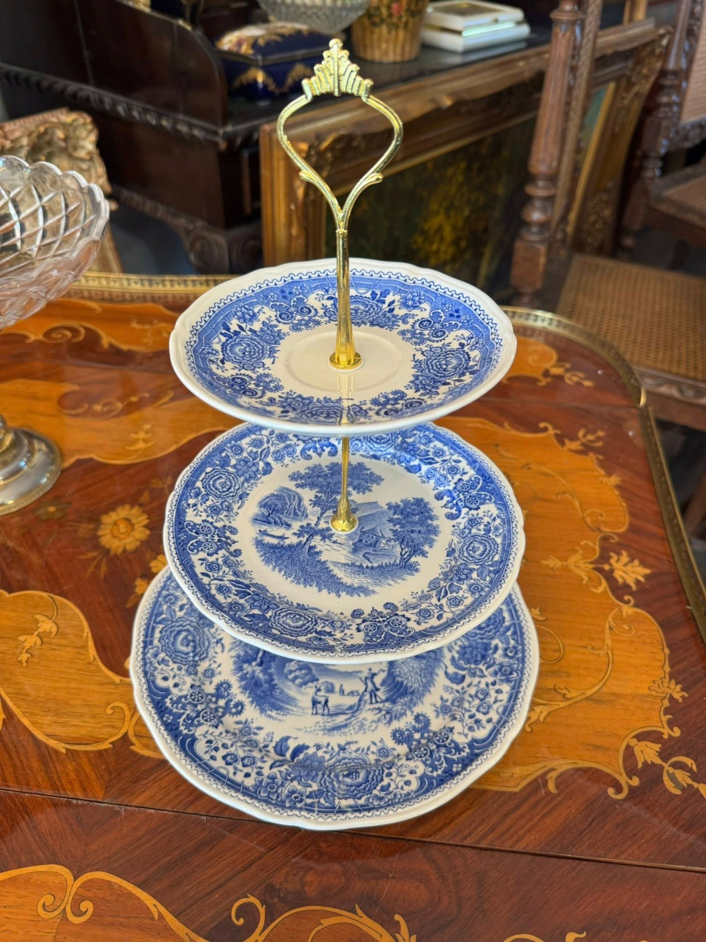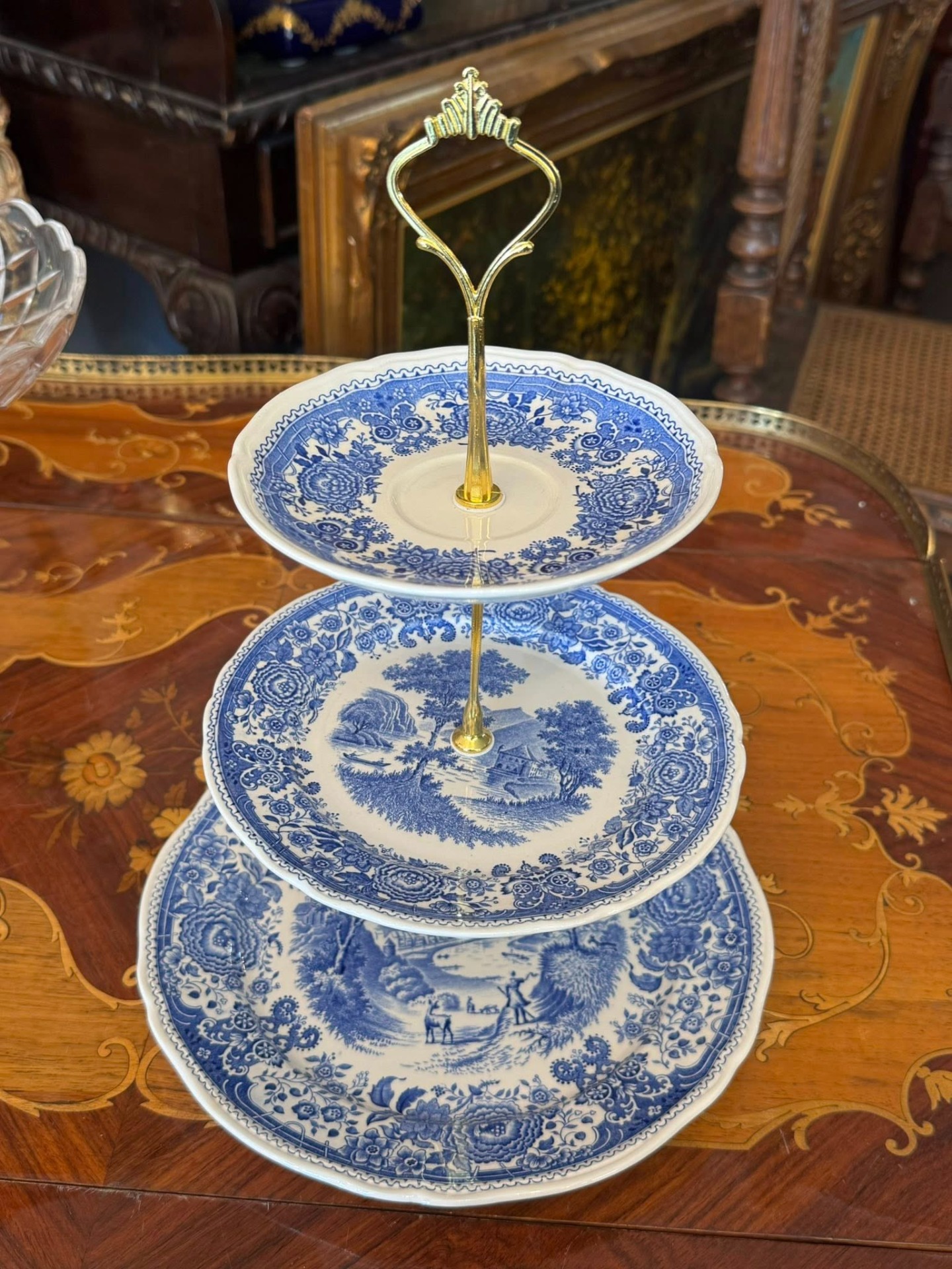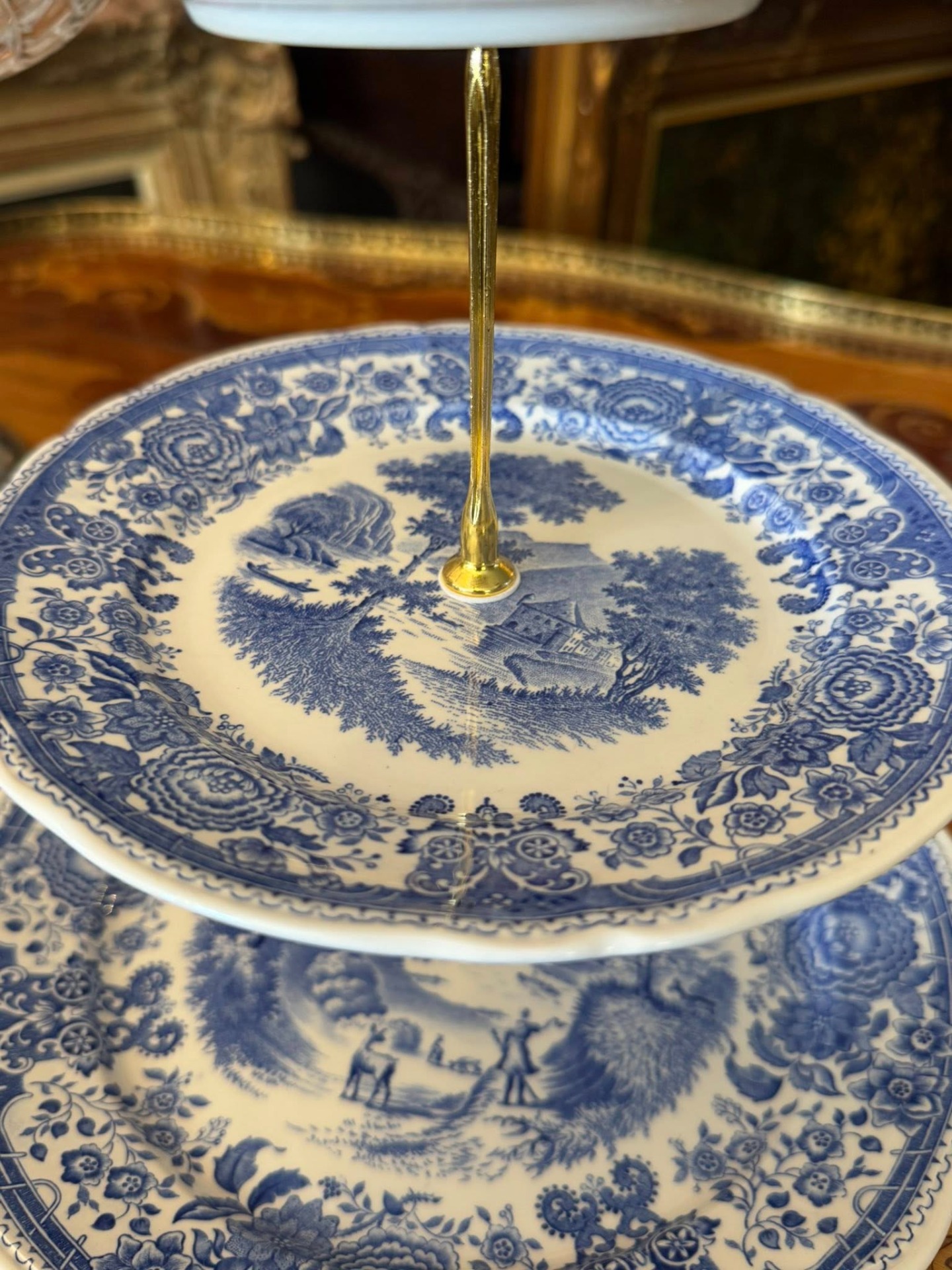 Platou supraetajat din porțelan, Villeroy & Boch ilustrând scene detaliate cu castele, peisaje rurale, râuri și vegetație luxuriantă pe margini.