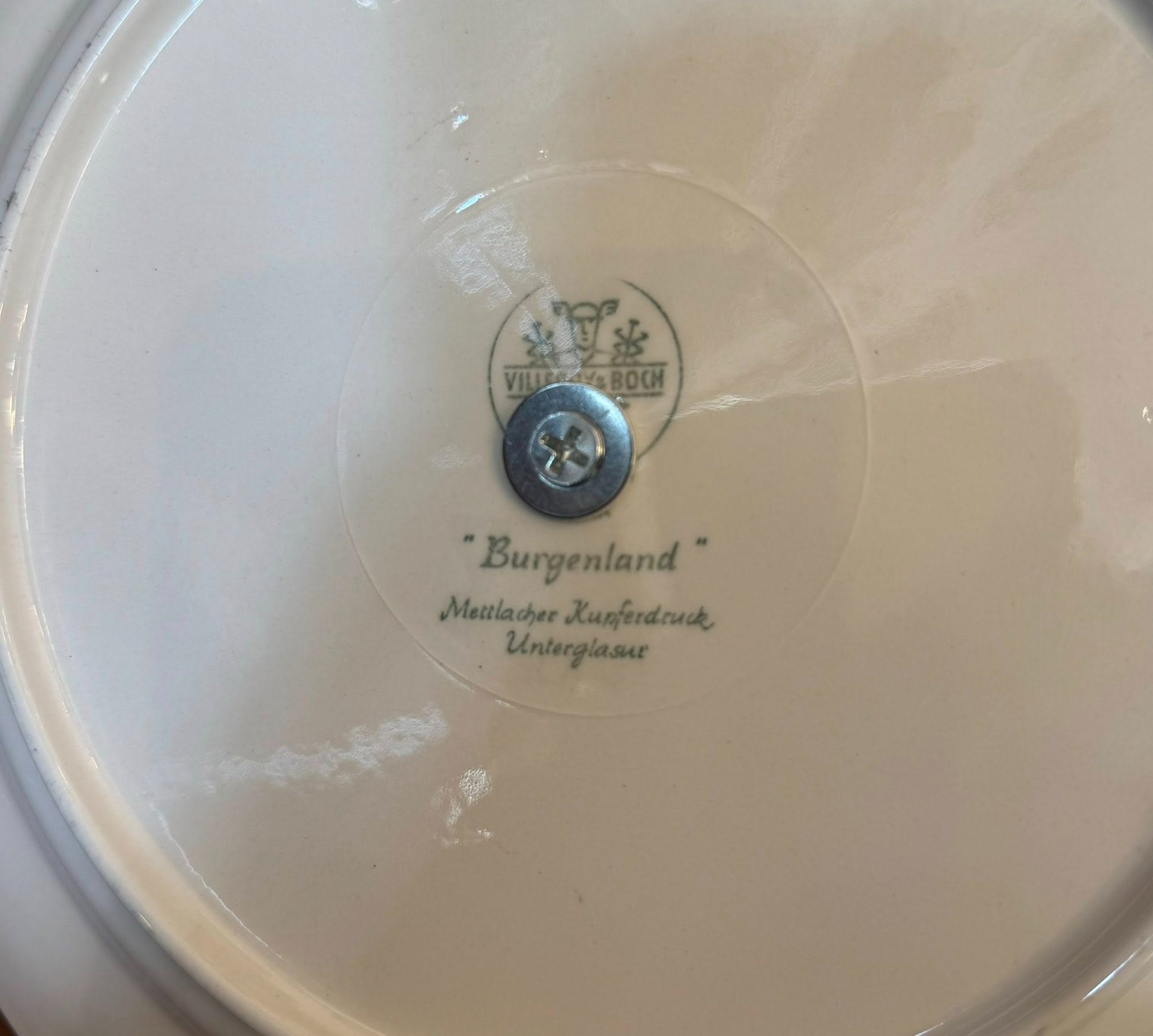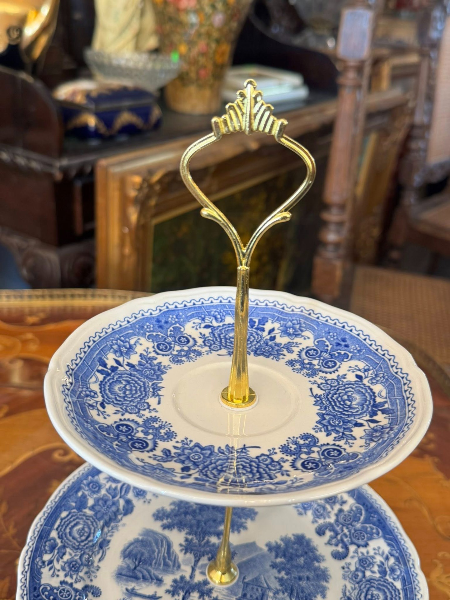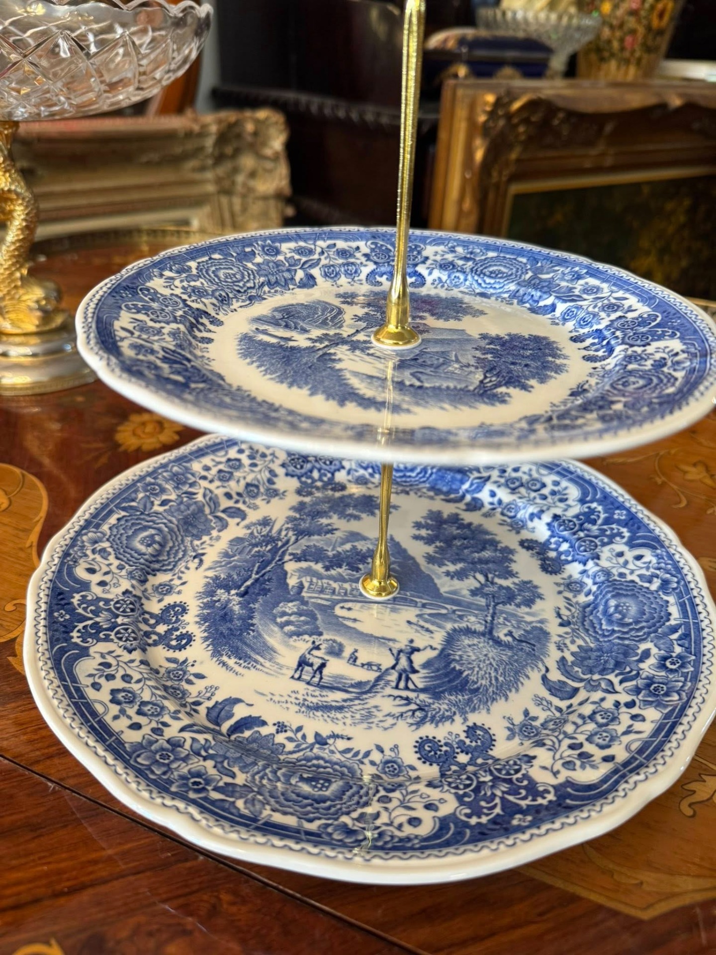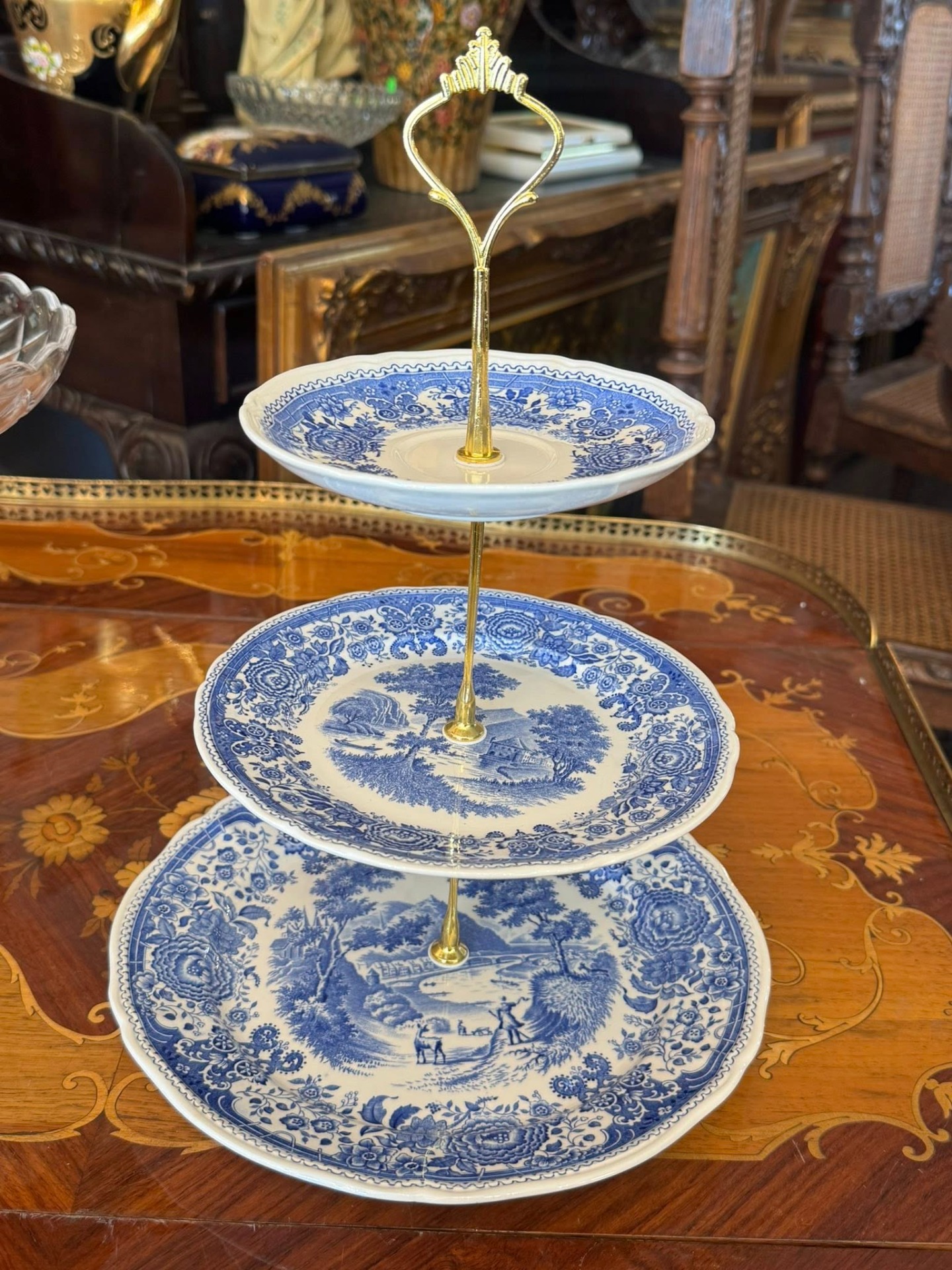 Platou supraetajat din porțelan, Villeroy & Boch ilustrând scene detaliate cu castele, peisaje rurale, râuri și vegetație luxuriantă pe margini.