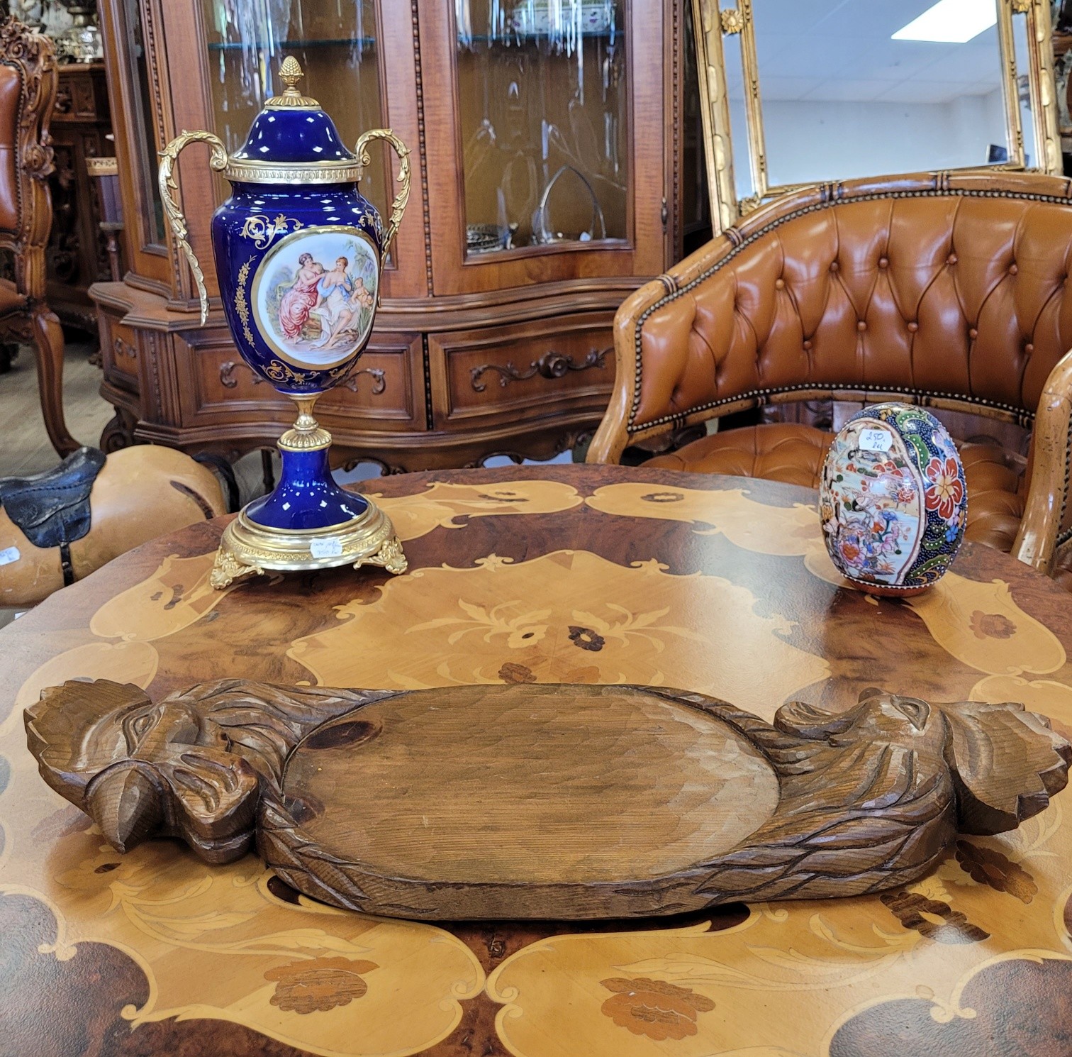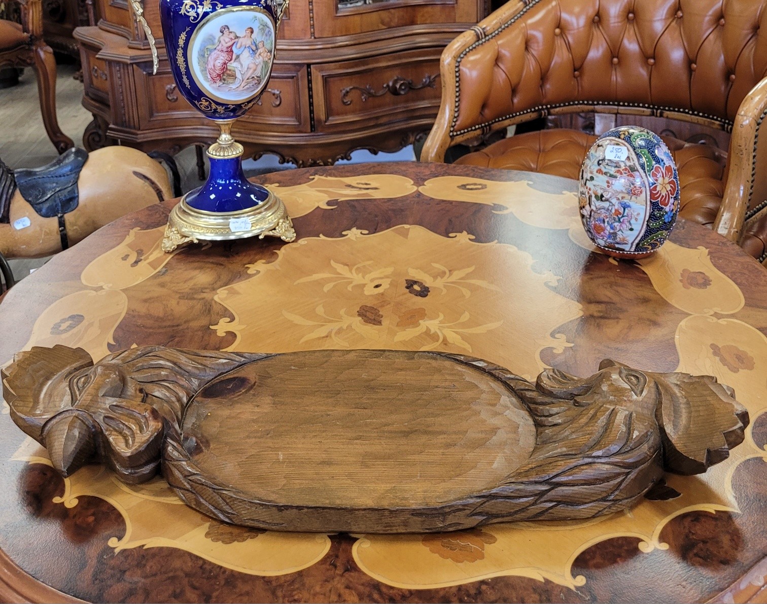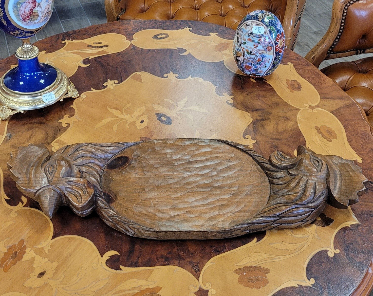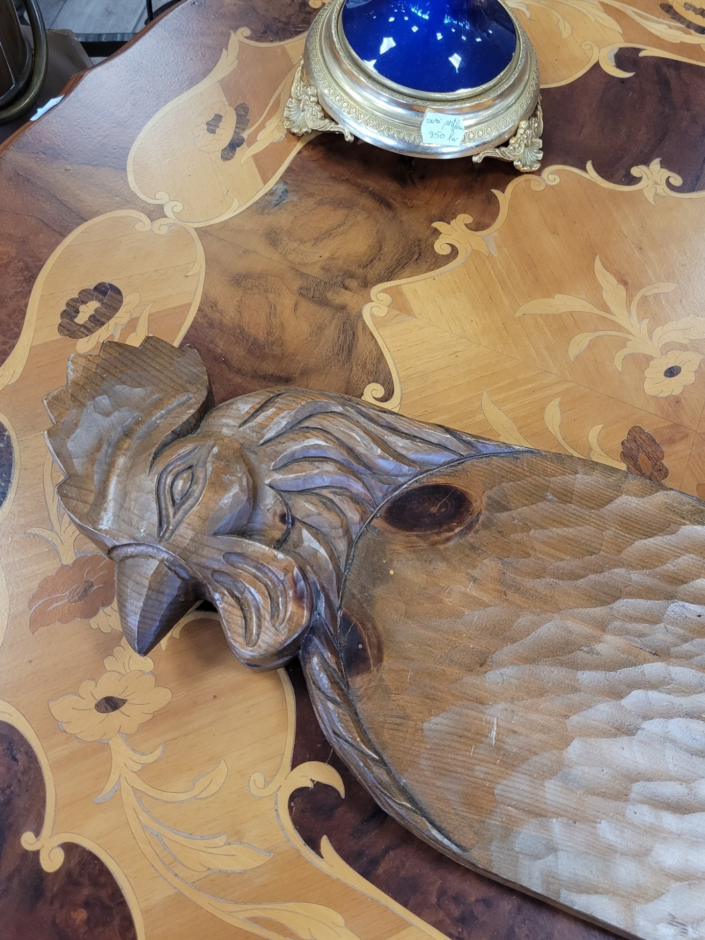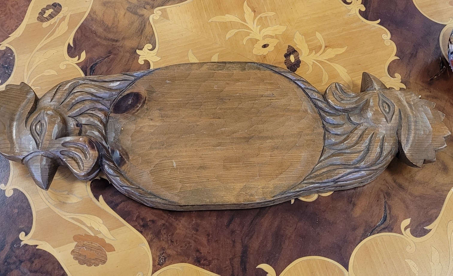 Platou vintage din lemn sculptat manual cu o deosebită atenție la detalii, cu două capete de cocoș, simbol tradițional al vitalității și al spiritului gospodăresc.