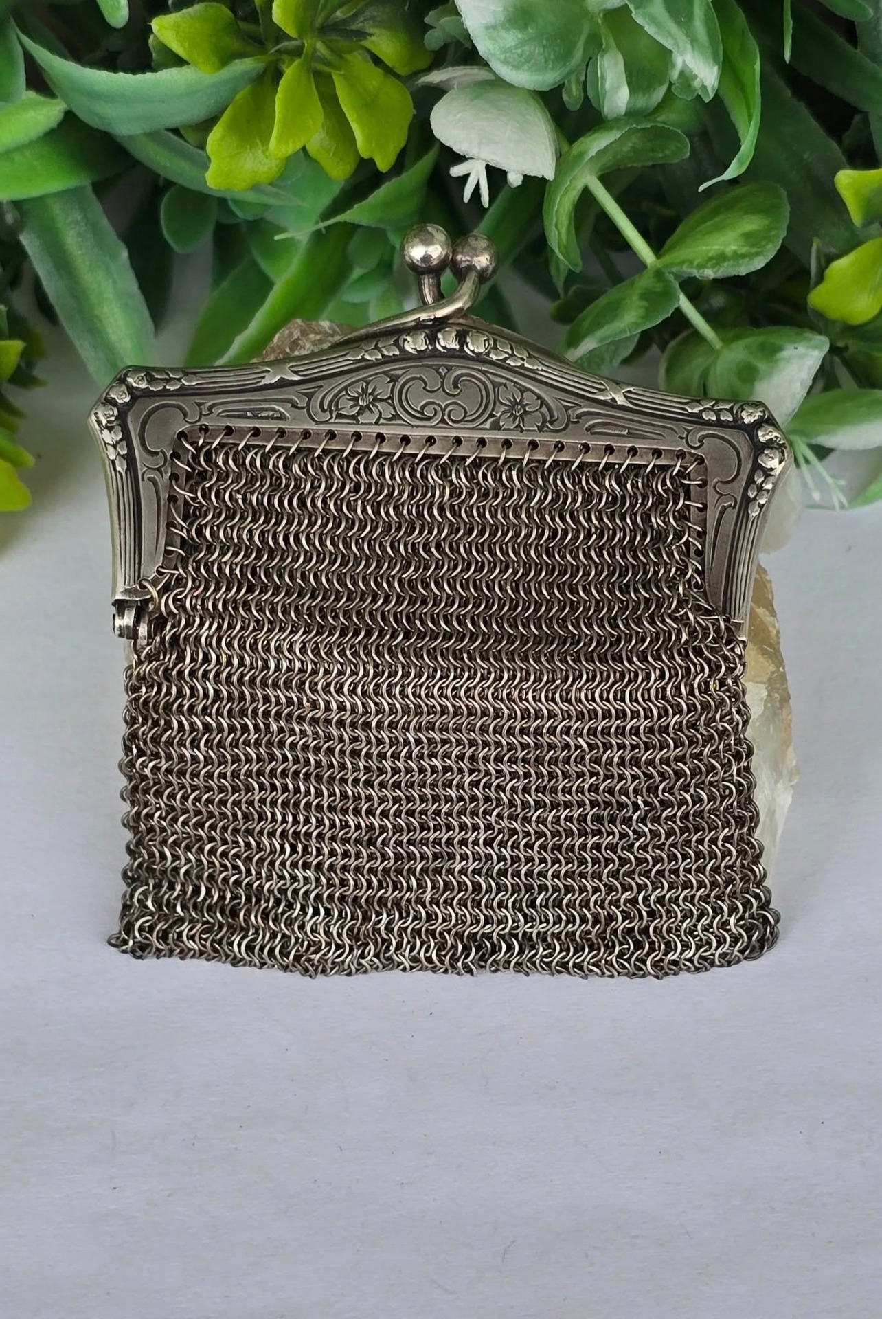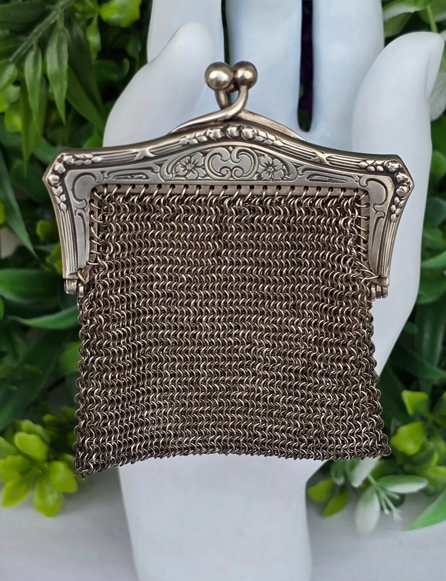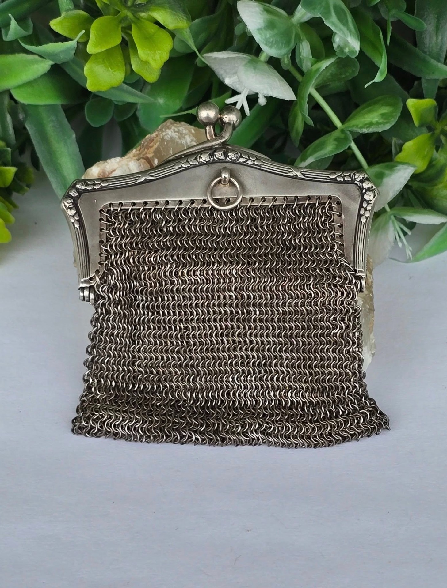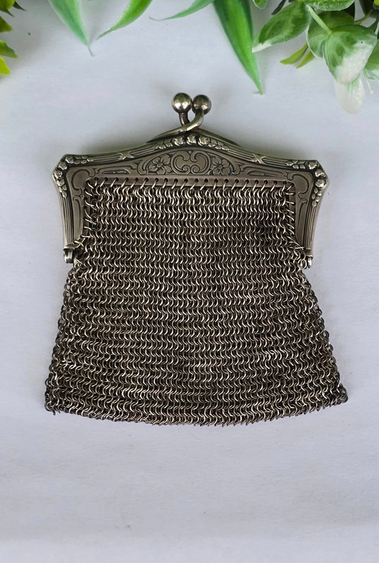 Portmoneu "chatelaine" Art Nouveau, din argint, cu două compartimente, manufactură de meșter german (anii 1910-1920, Germania).