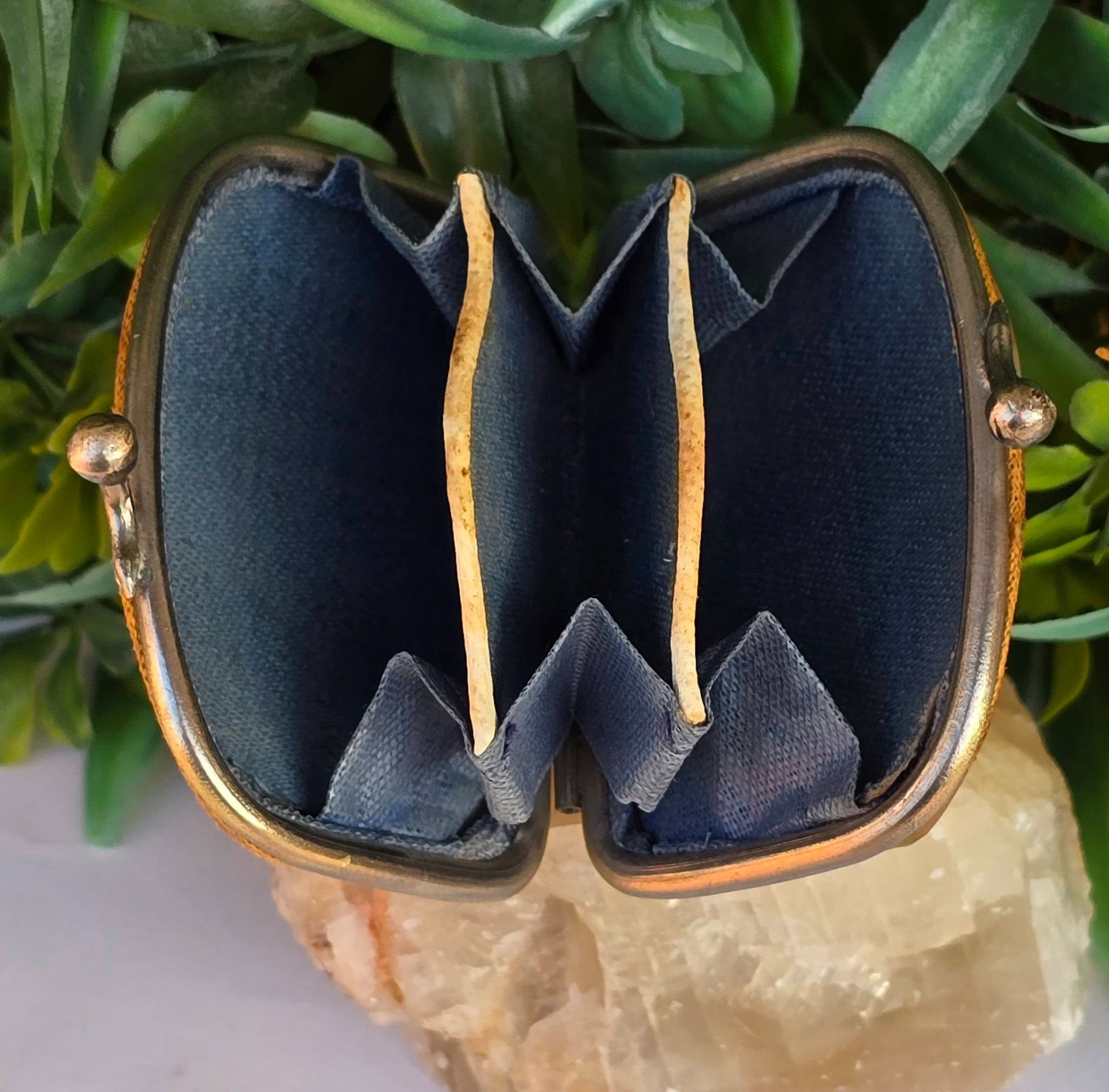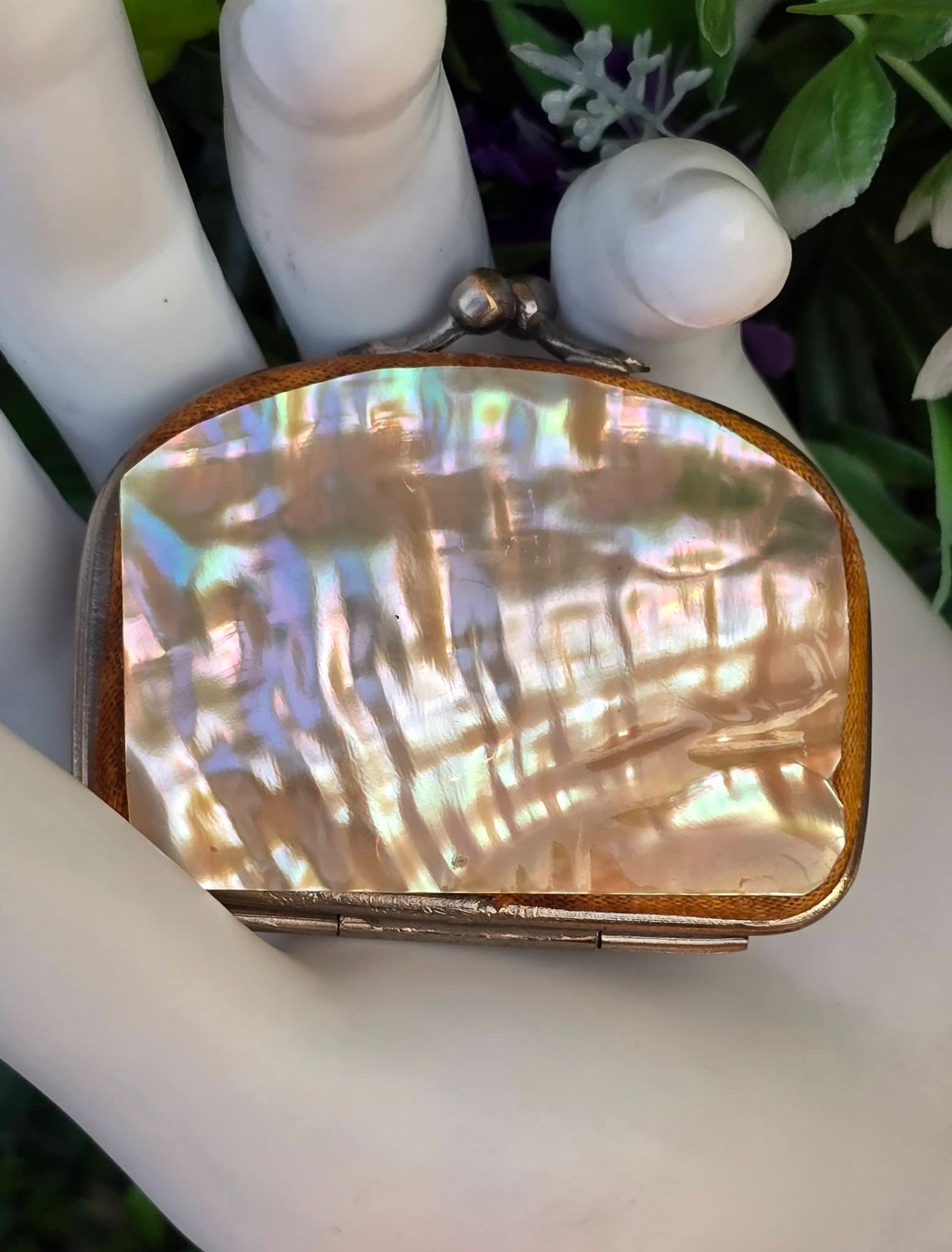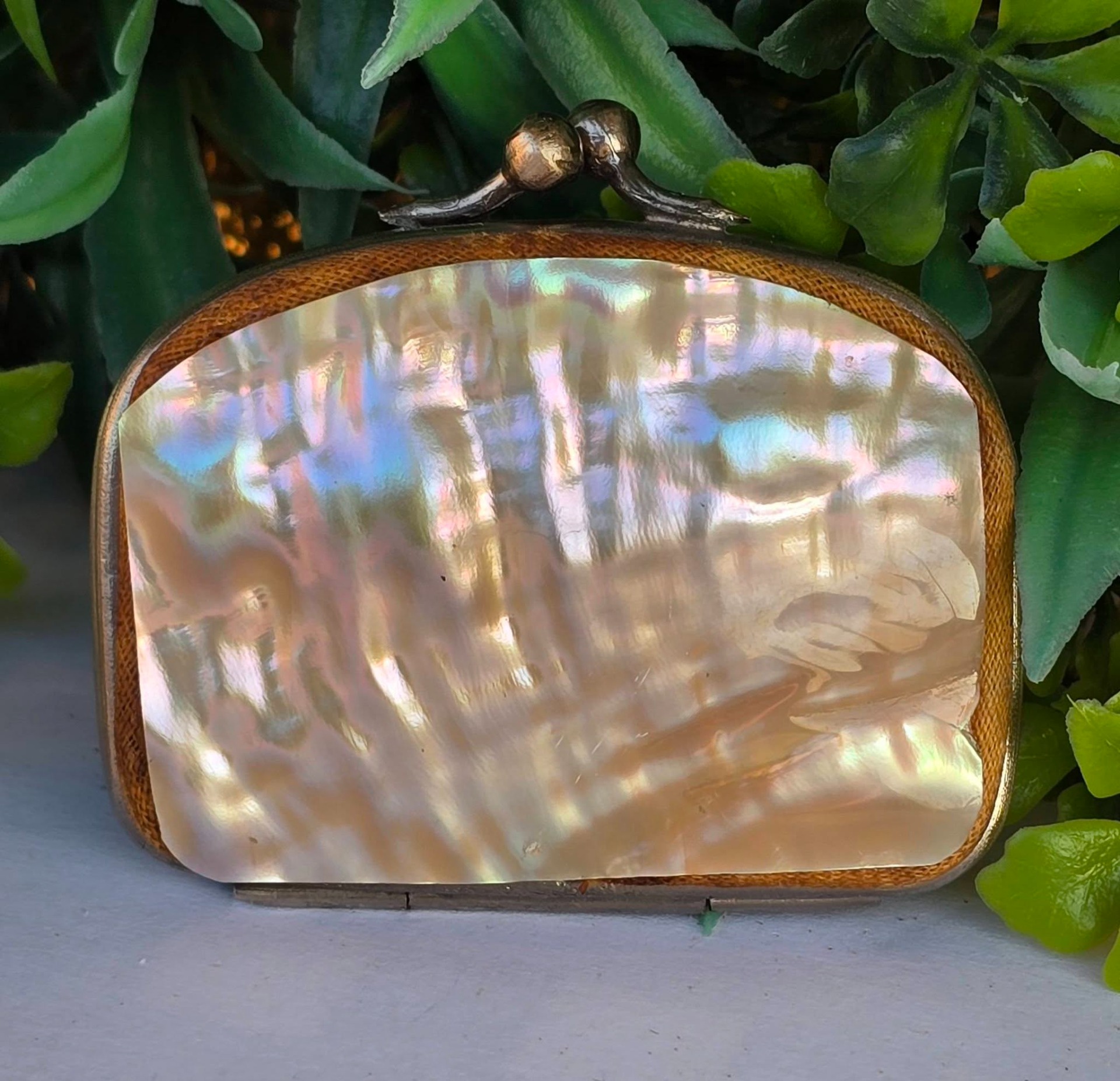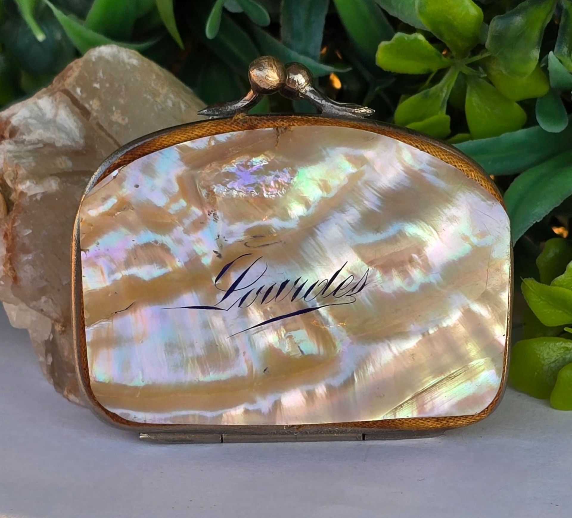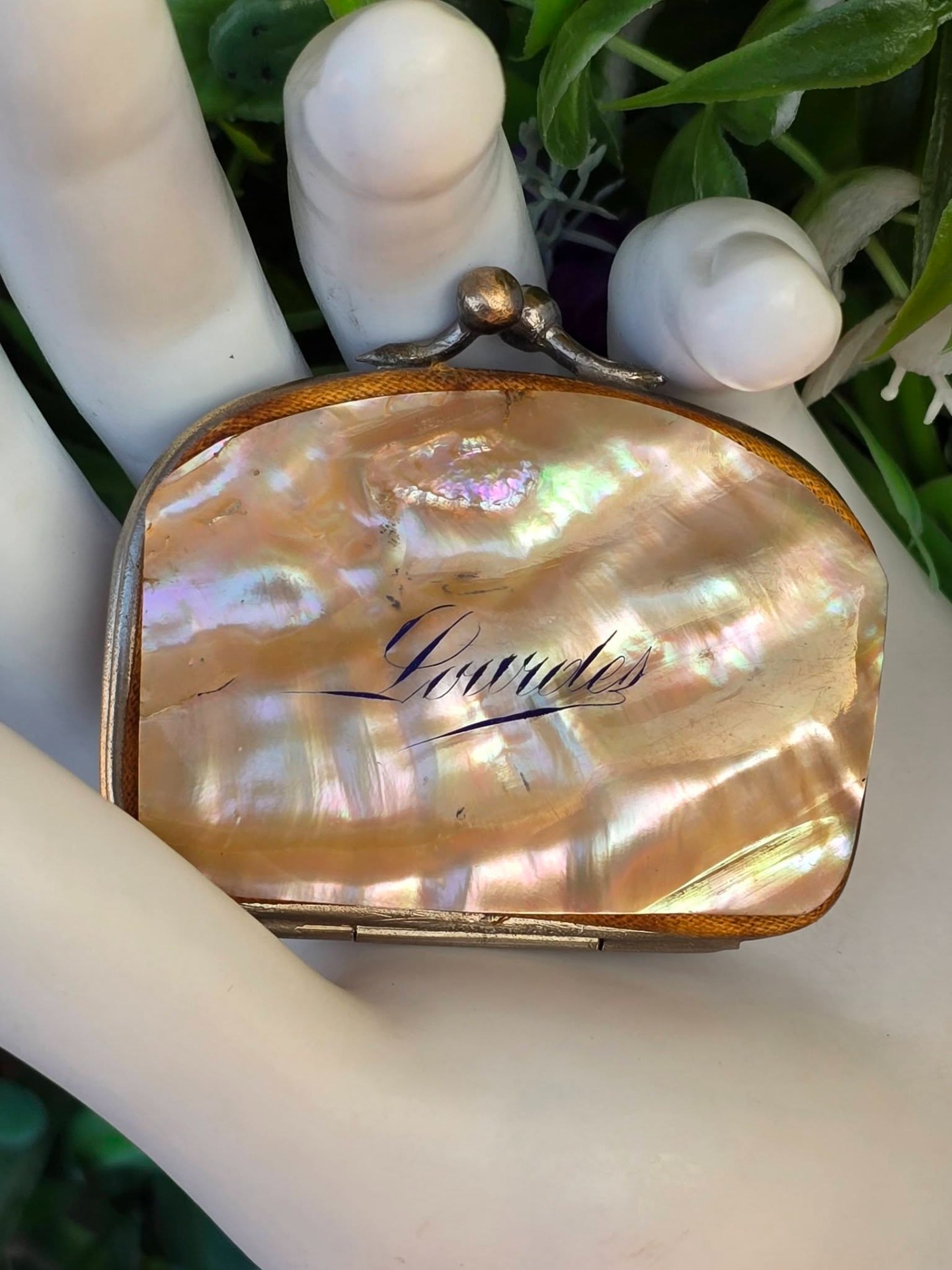 Portmoneu vechi cu sidef natural și ramă metalică, souvenir de la Lourdes, important loc de pelerinaj, fiind locul aparițiilor Fecioarei Maria (anii 1920-1940).