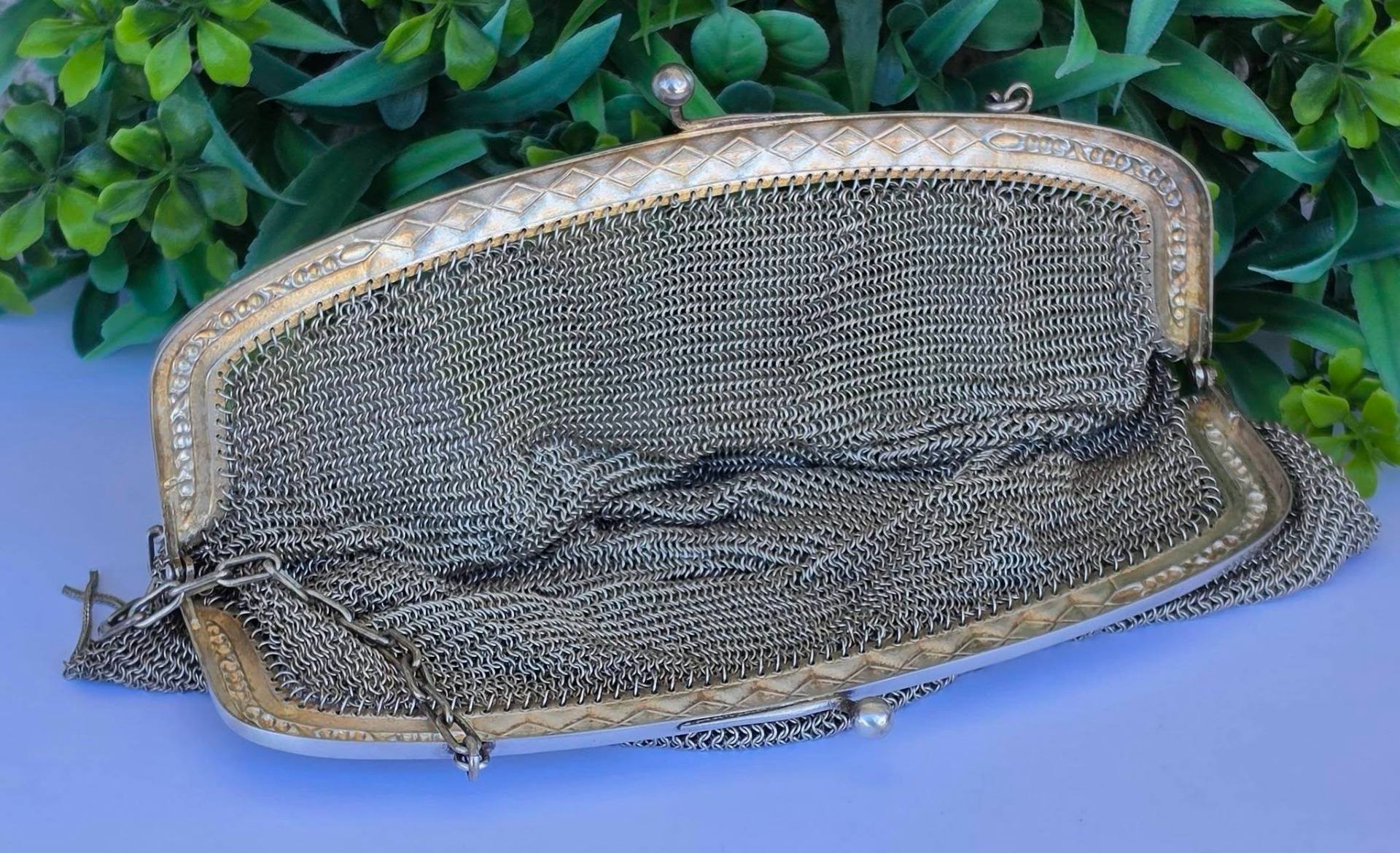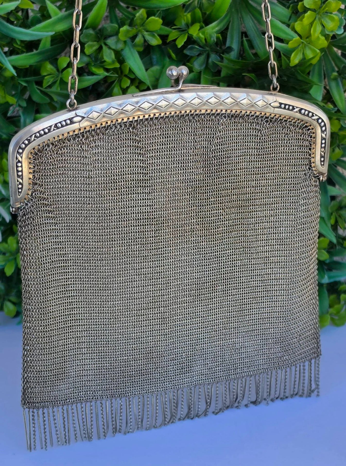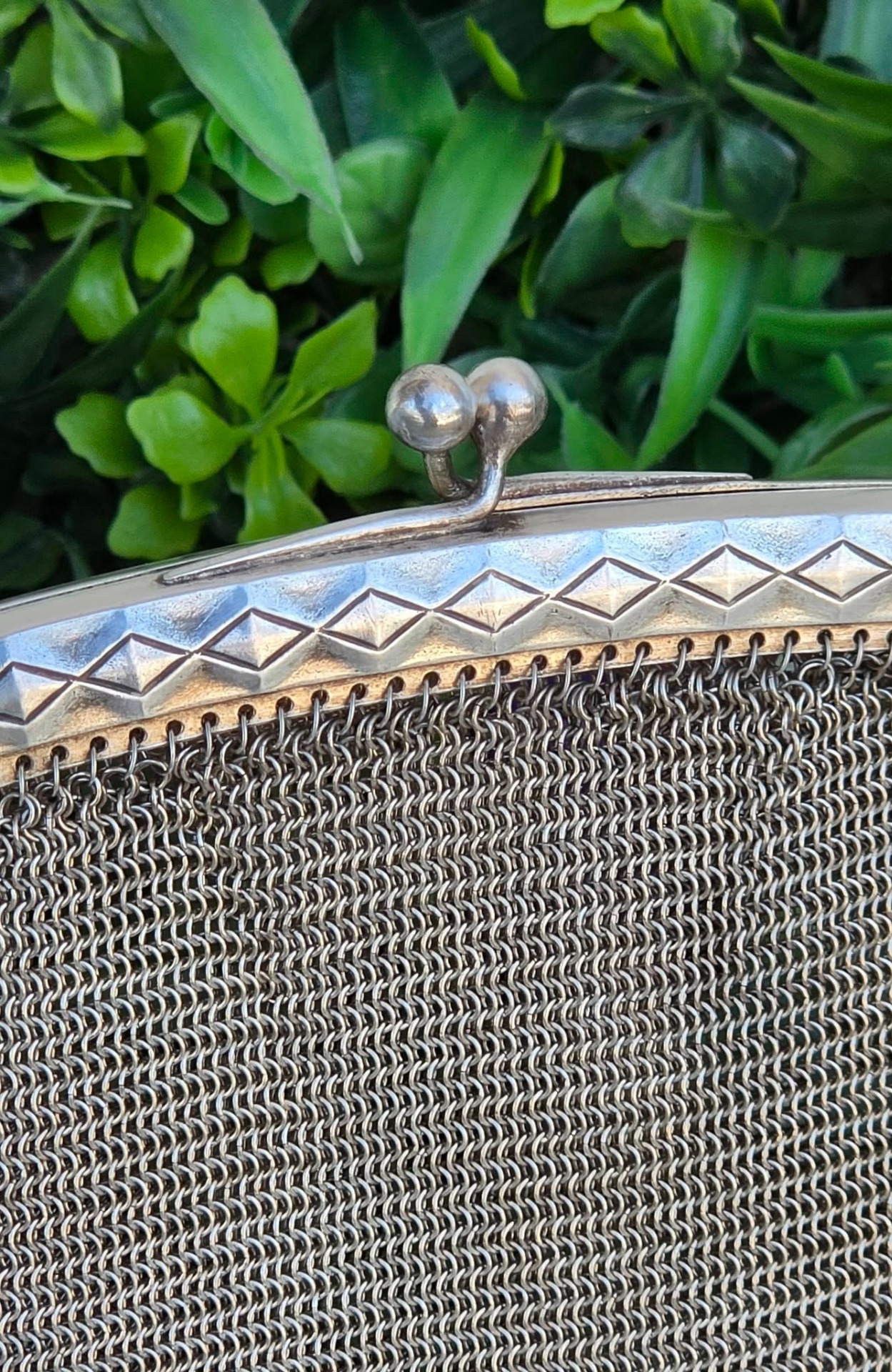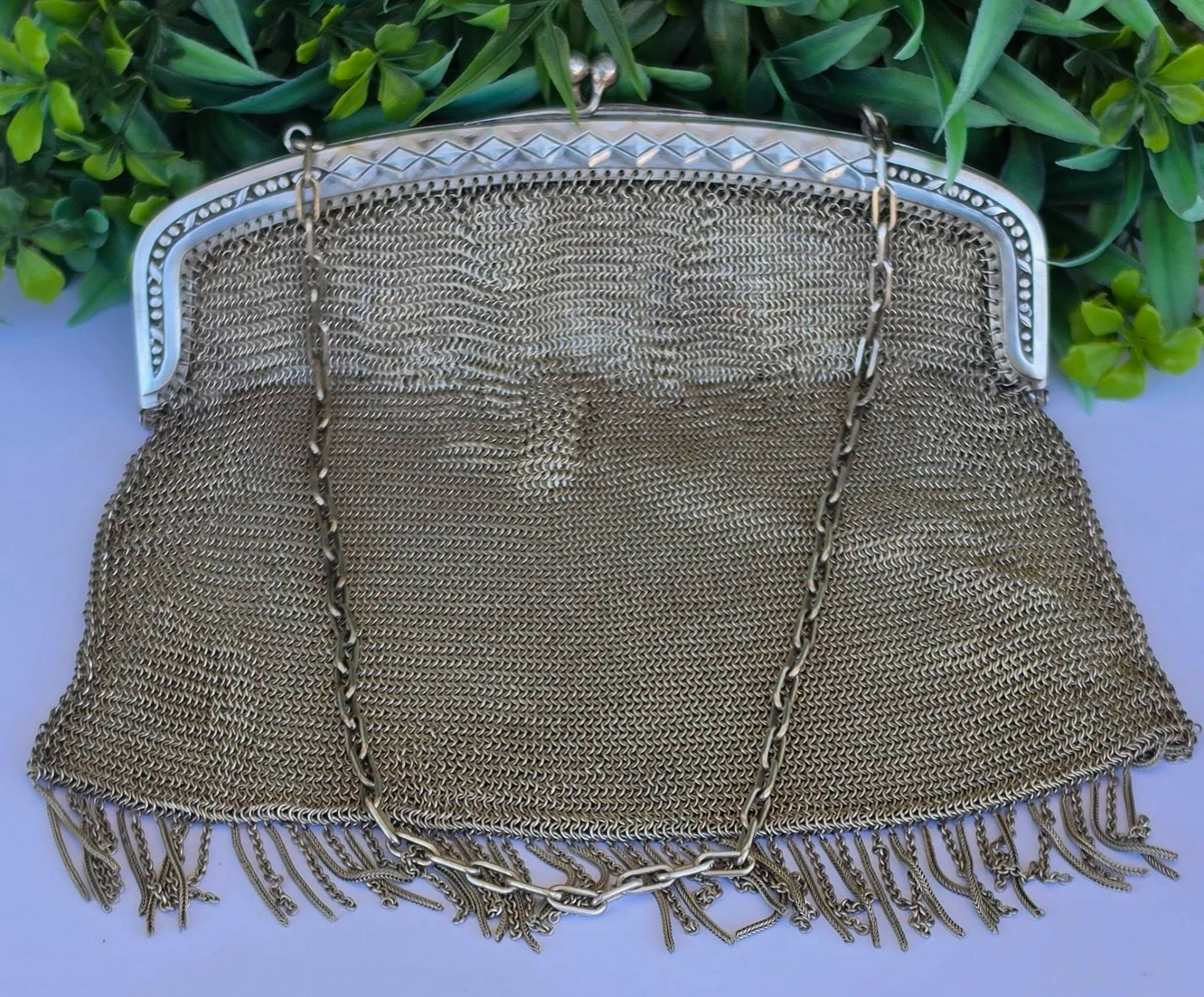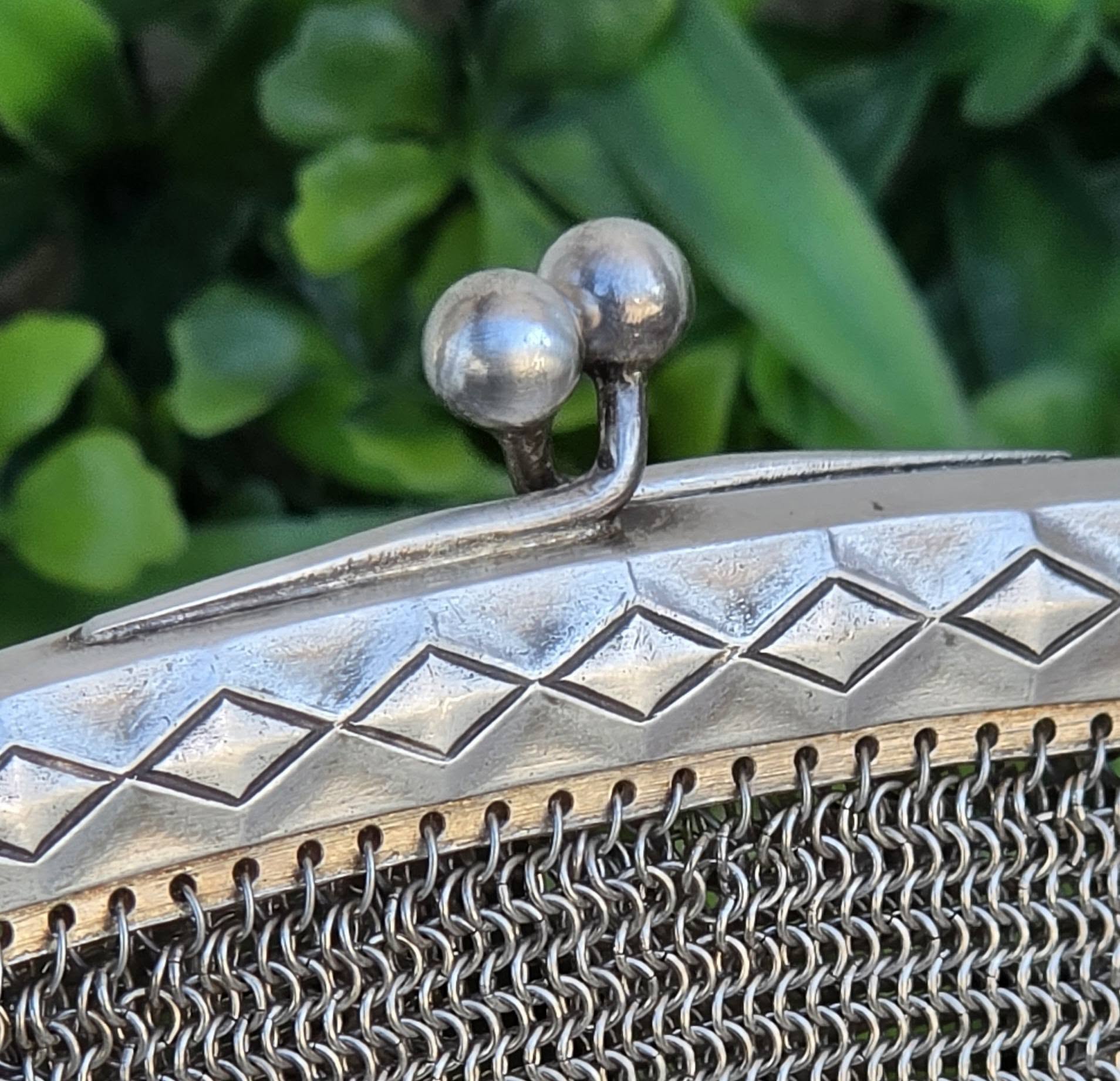 Poșetă "mesh" Art Deco, din alpaca argintată, de colecție, frumos lucrată manual cu zale foarte fine, decorată pe ramă cu motive geometrice caracteristice perioadei, în stare foarte bună (anii 1920-1930, Germania).
