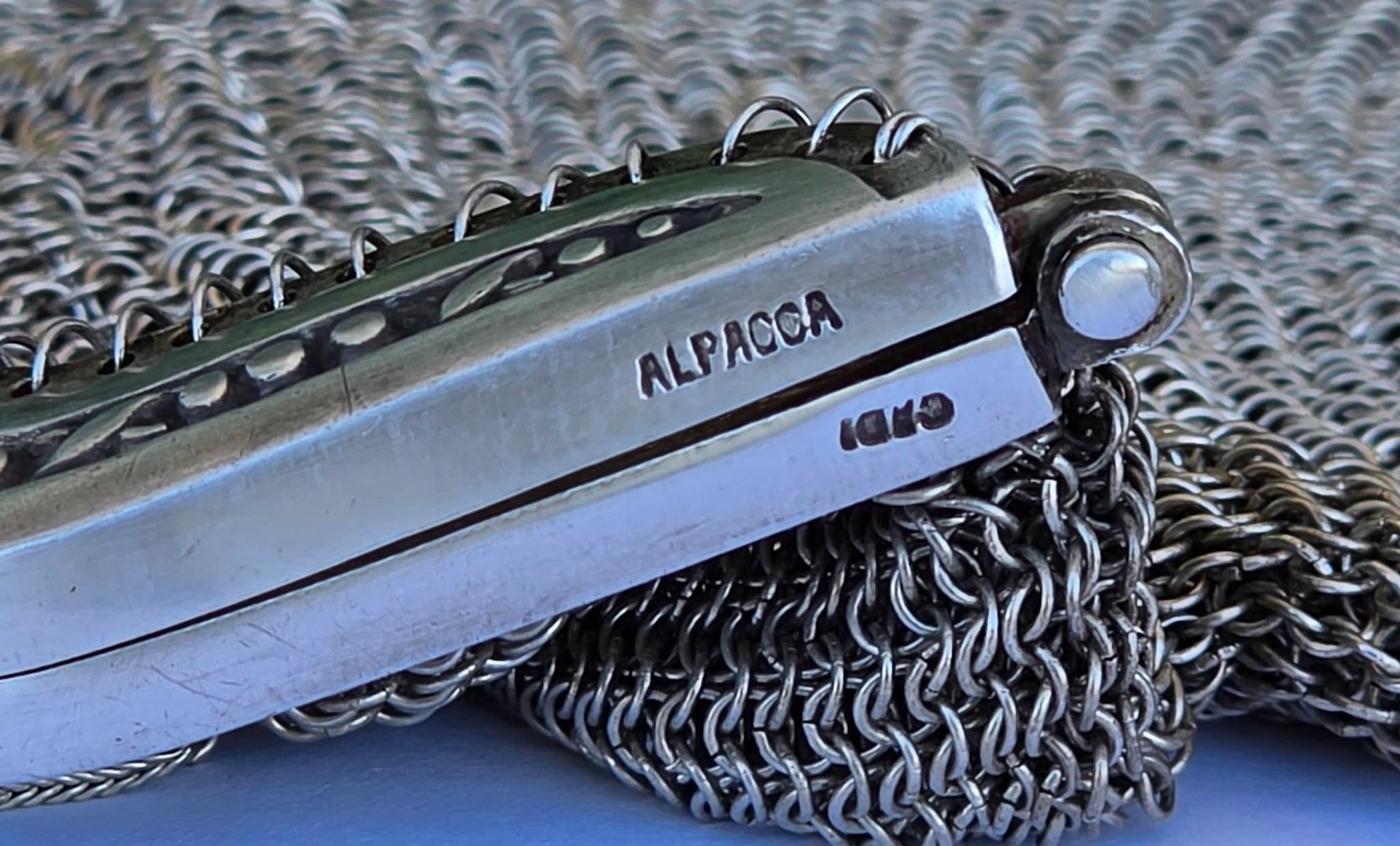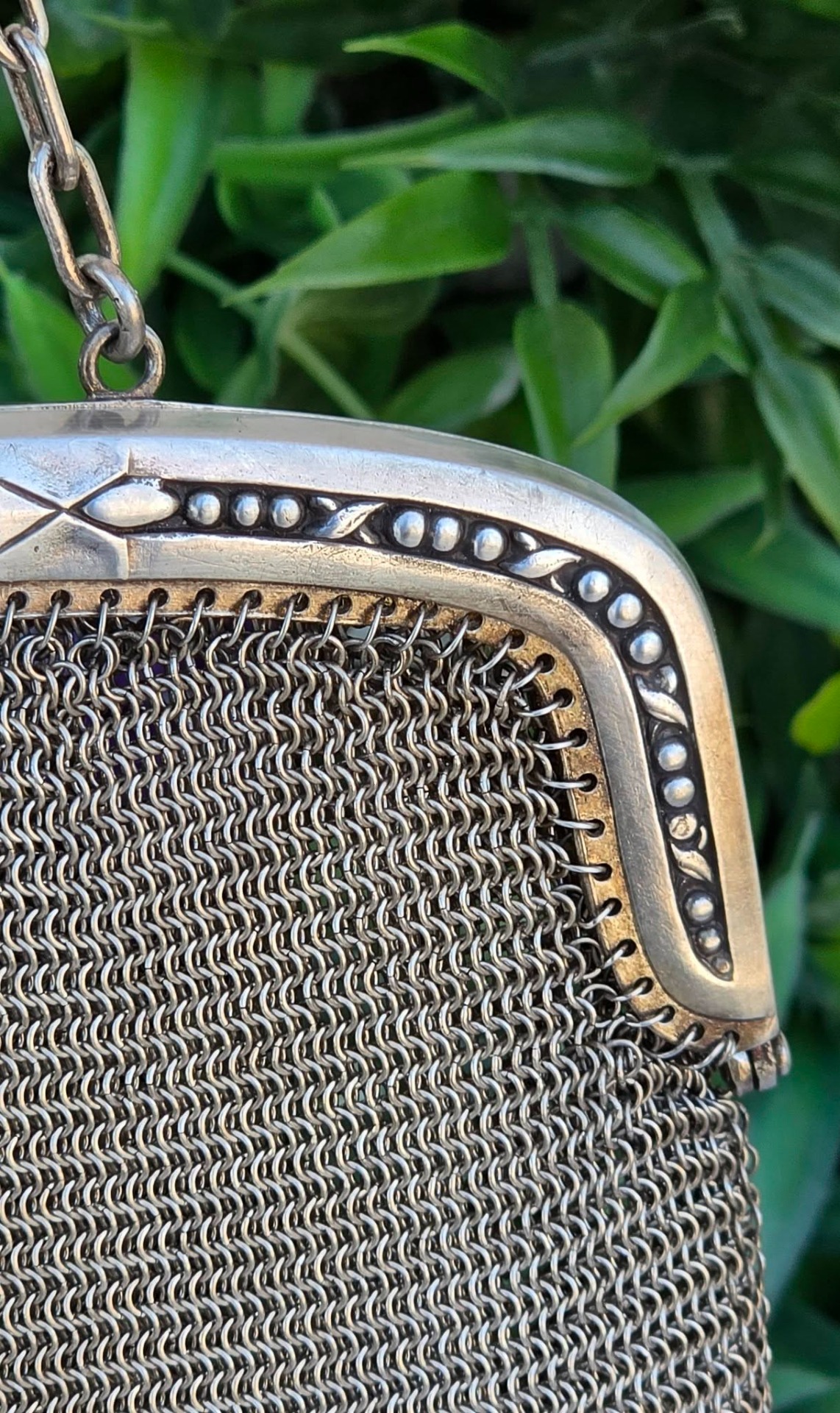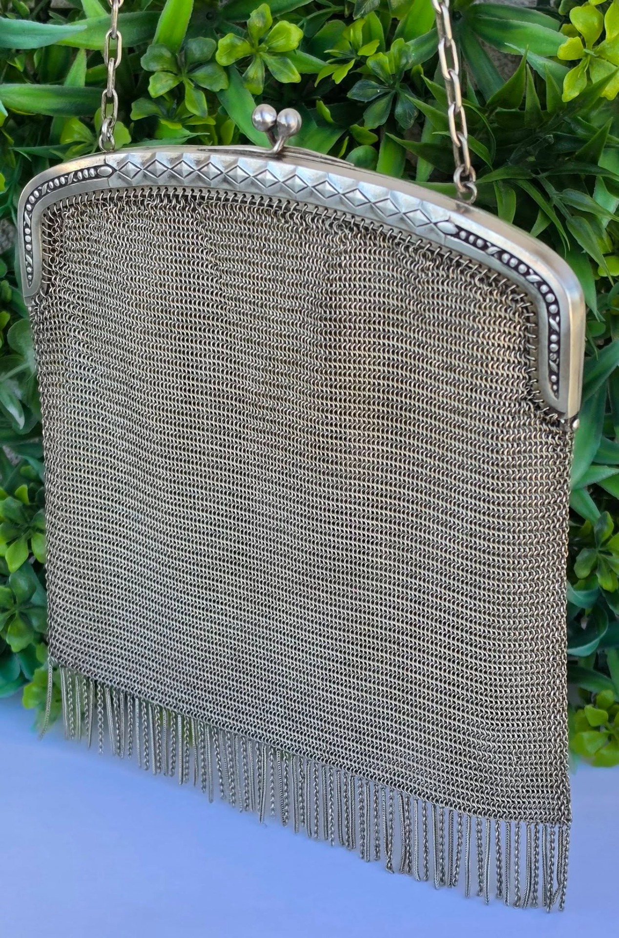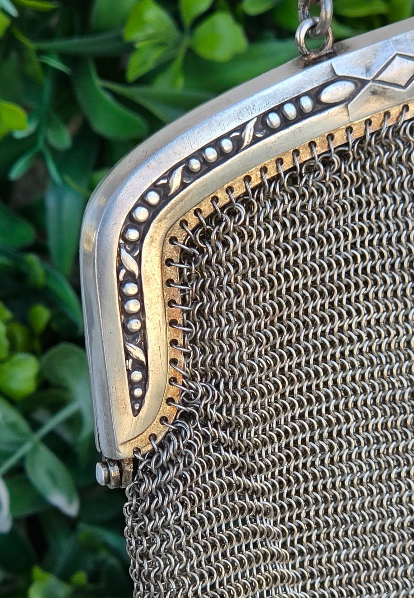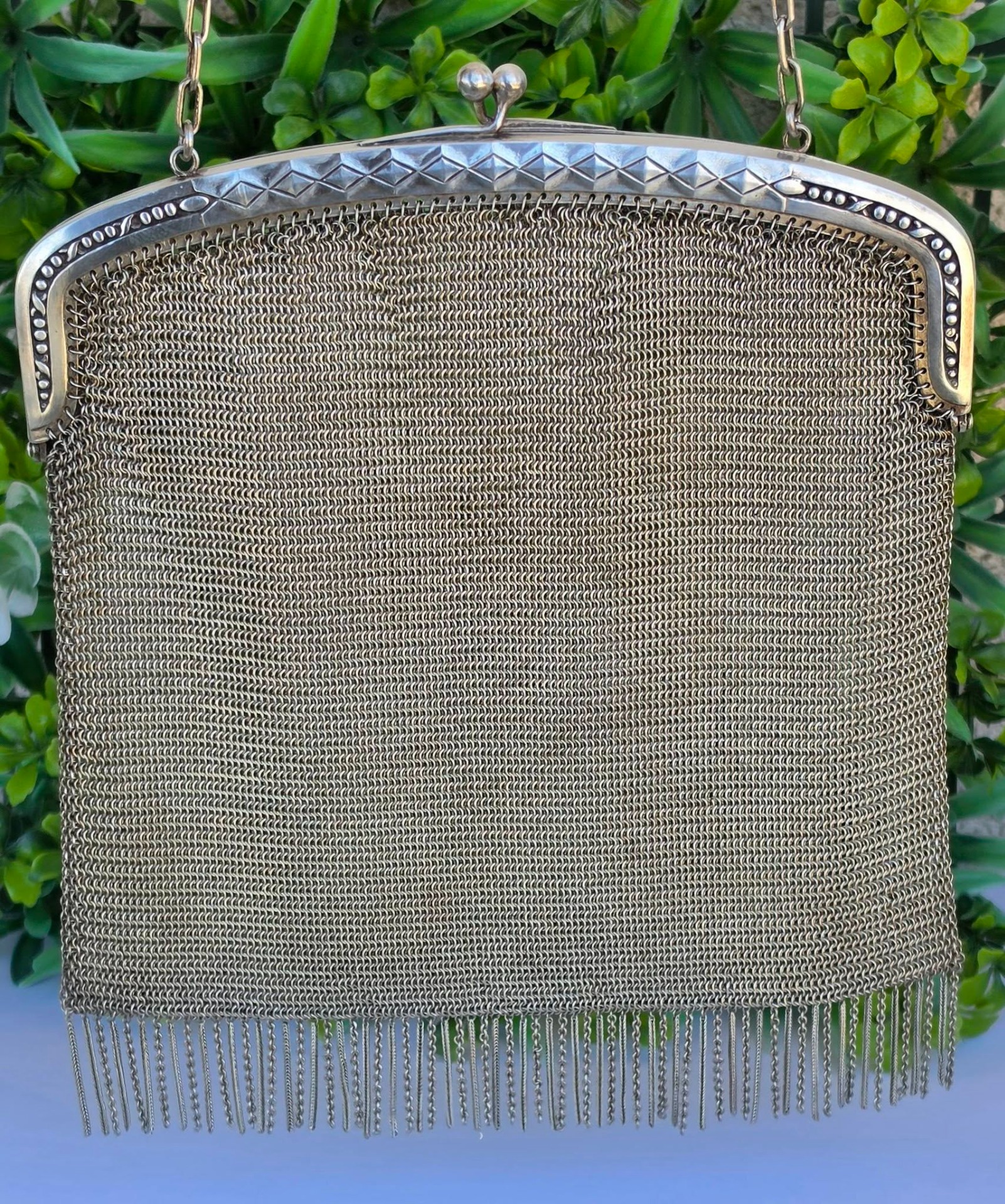 Poșetă "mesh" Art Deco, din alpaca argintată, de colecție, frumos lucrată manual cu zale foarte fine, decorată pe ramă cu motive geometrice caracteristice perioadei, în stare foarte bună (anii 1920-1930, Germania).