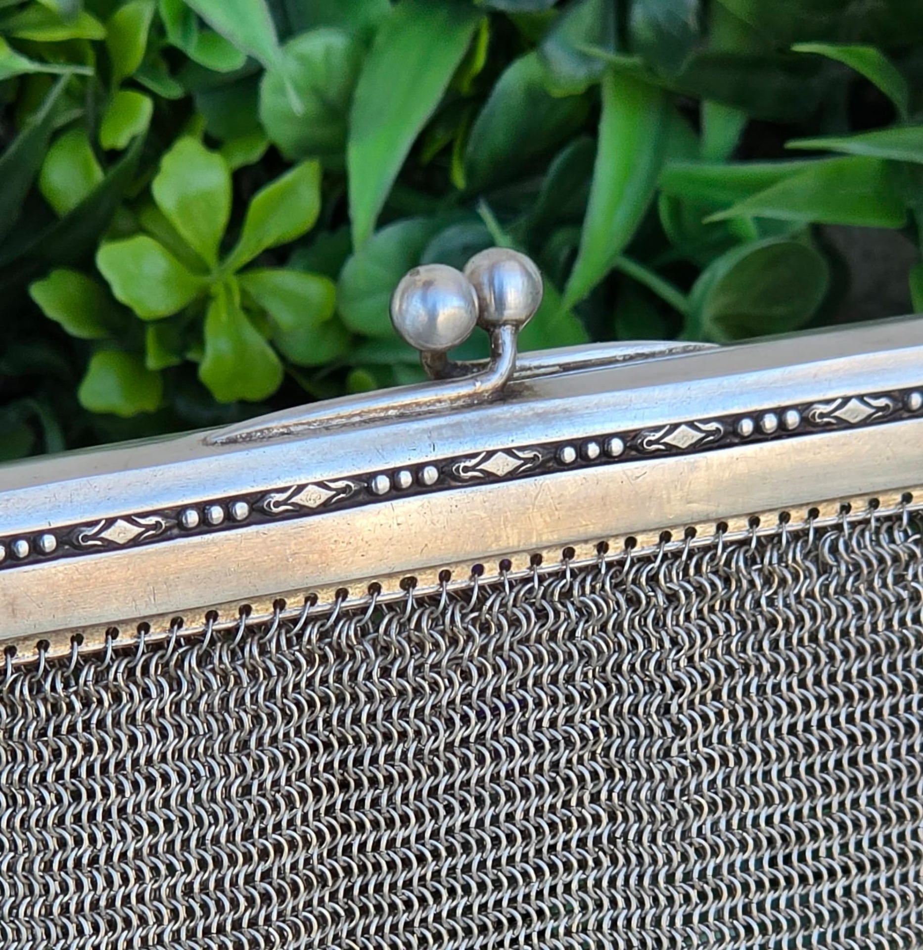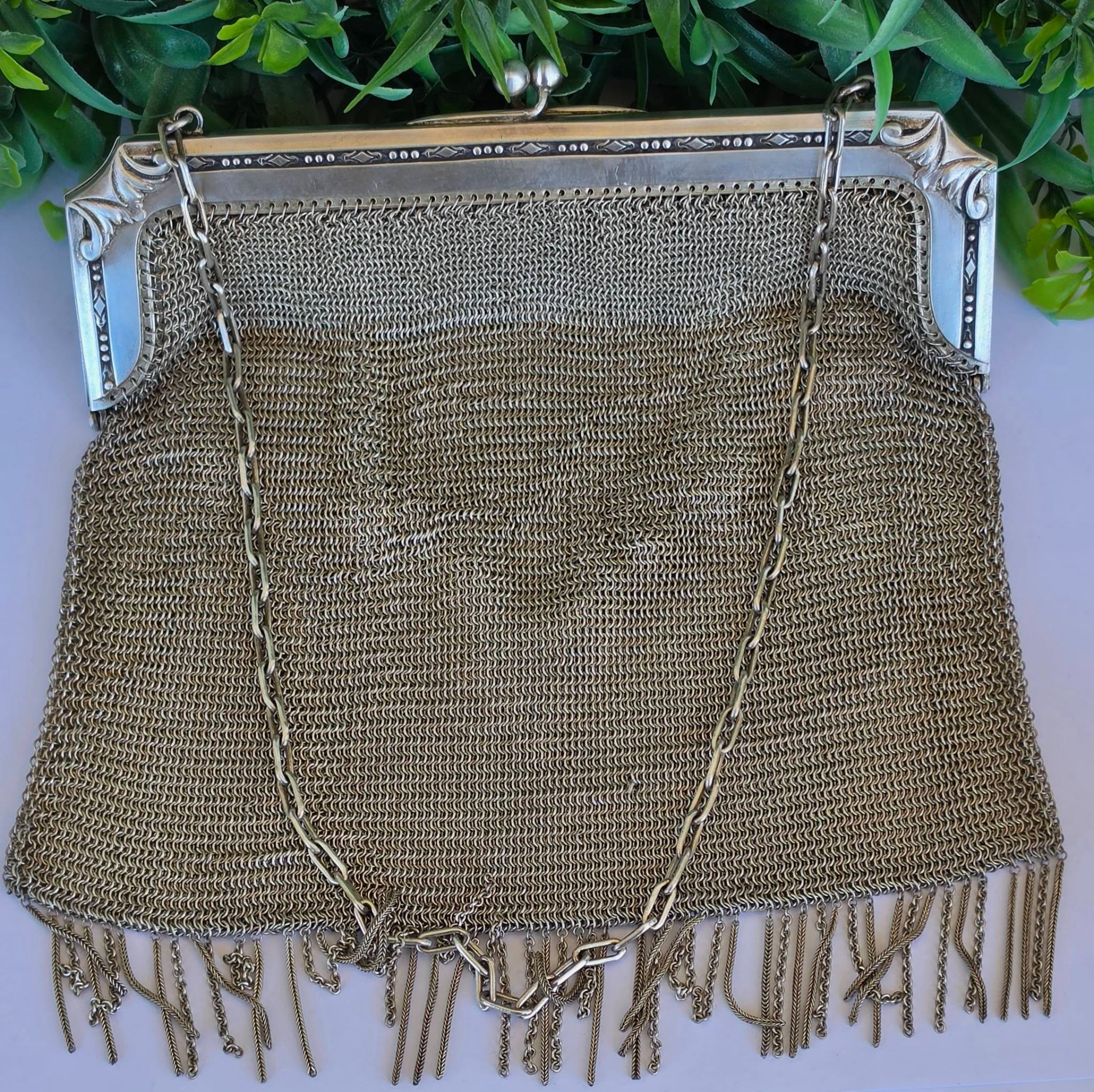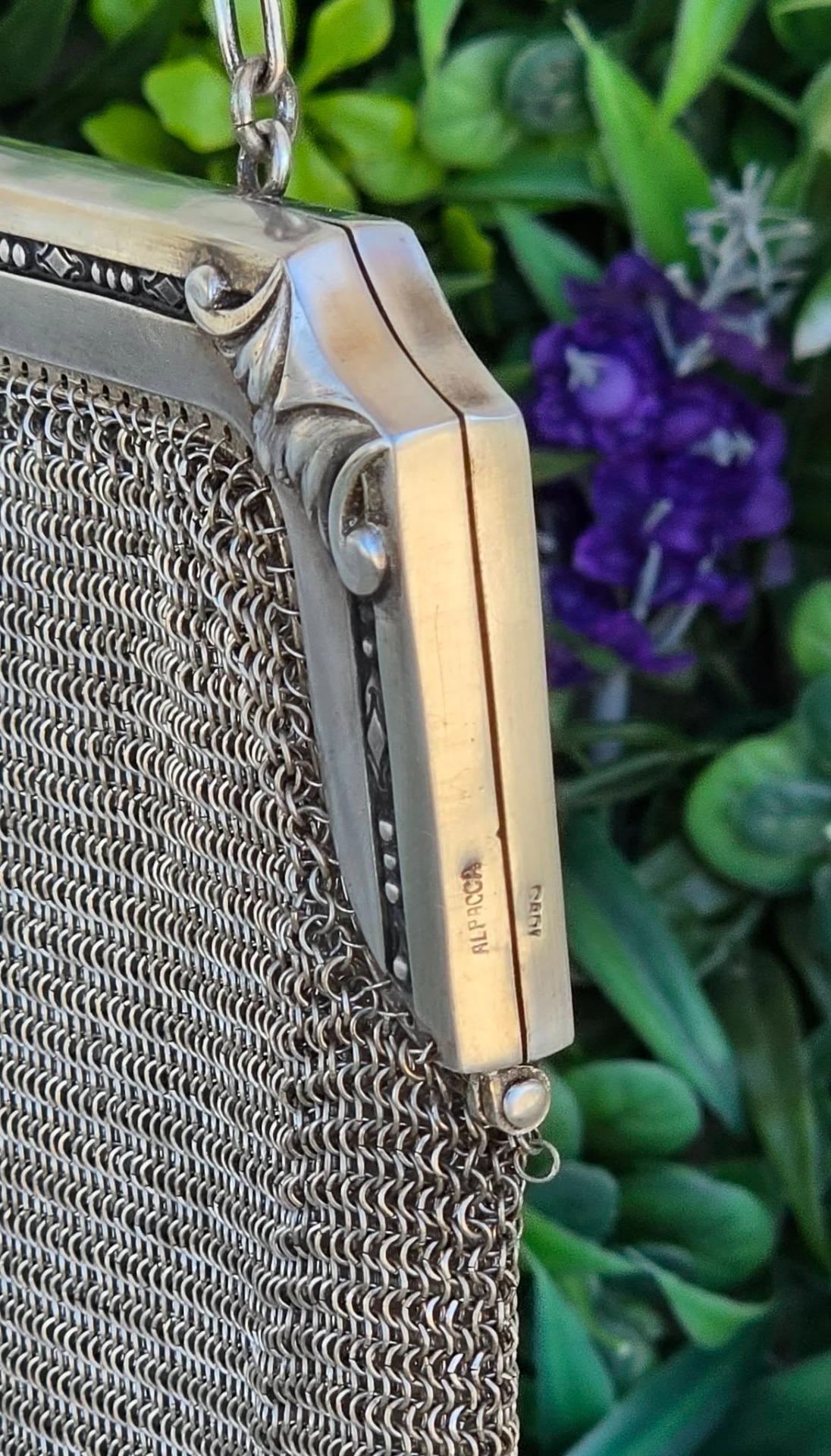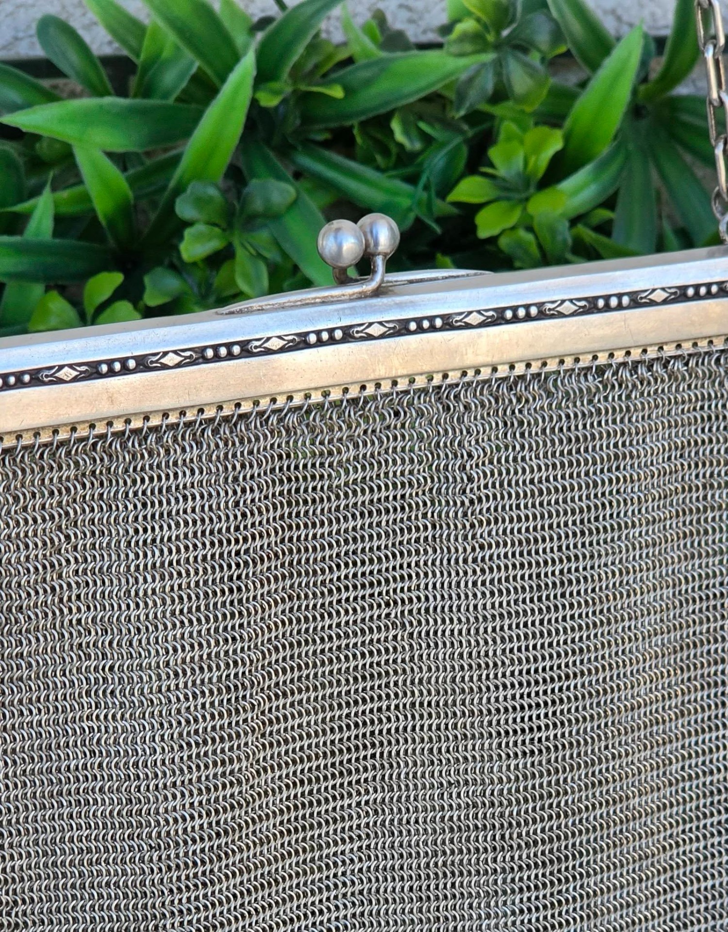Poșetă "mesh" Art Deco, din alpaca argintată, de colecție, frumos lucrată manual cu zale foarte fine, decorată pe ramă cu motive geometrice caracteristice perioadei, în stare foarte bună (anii 1920-1930, Germania).