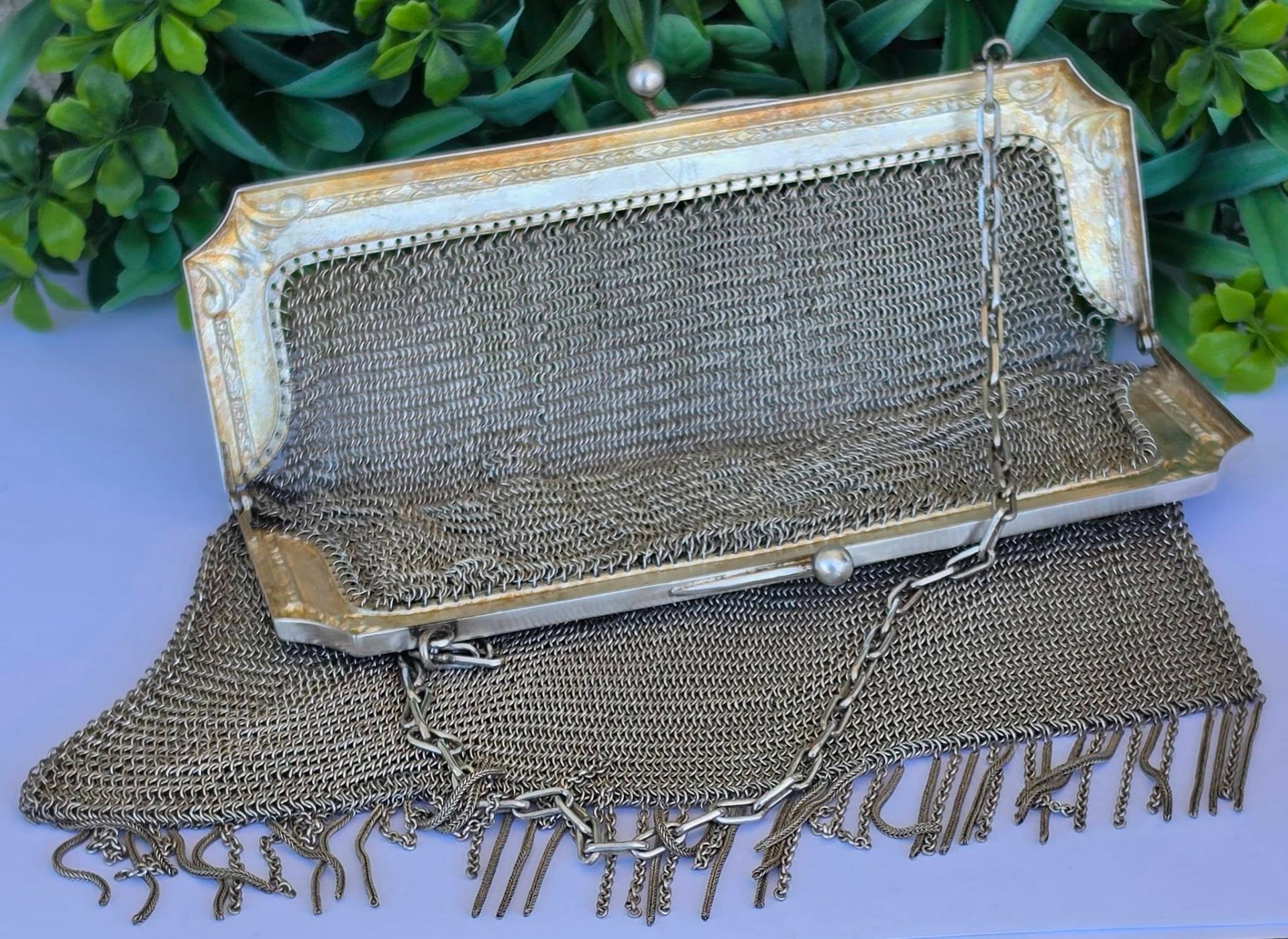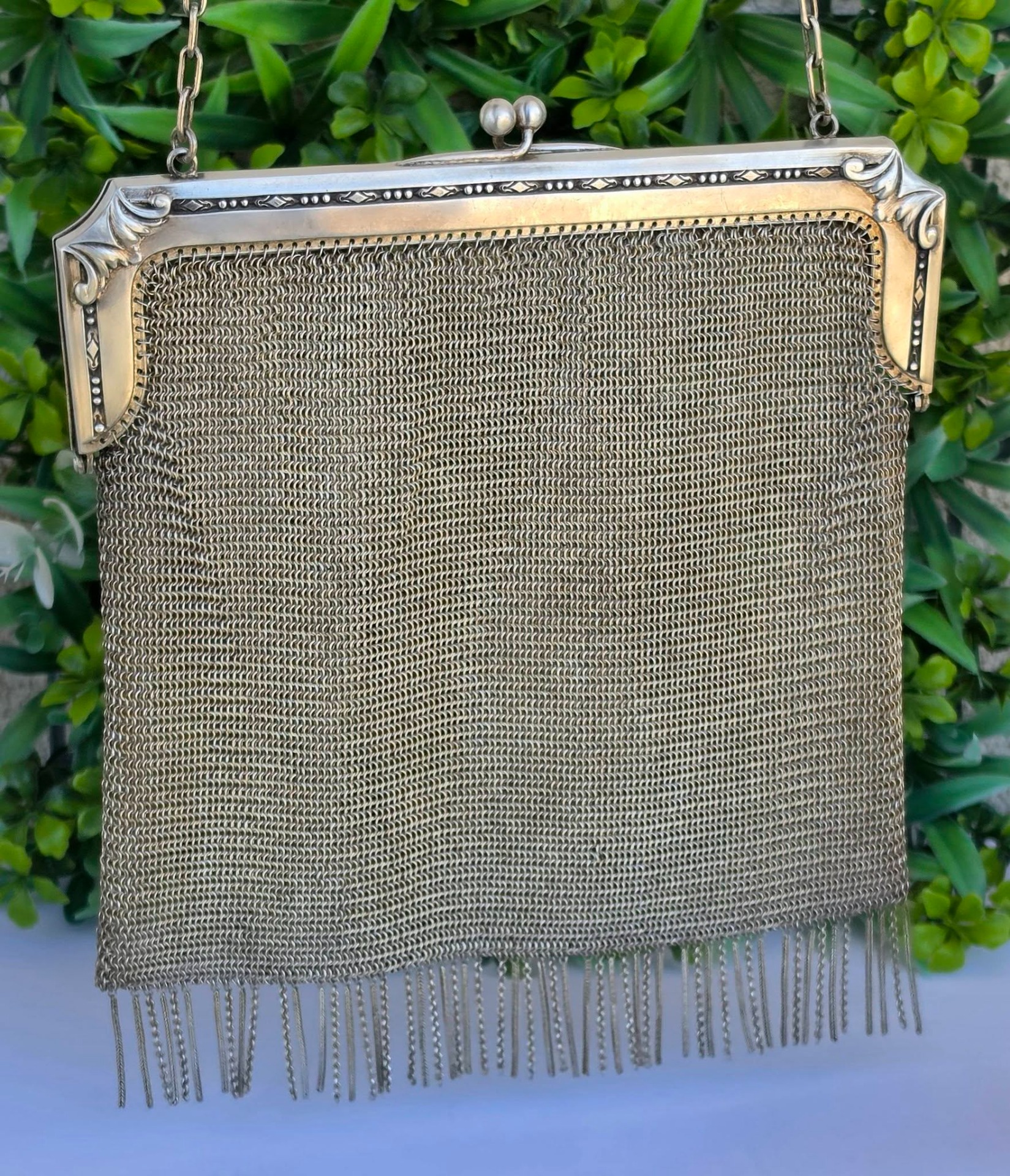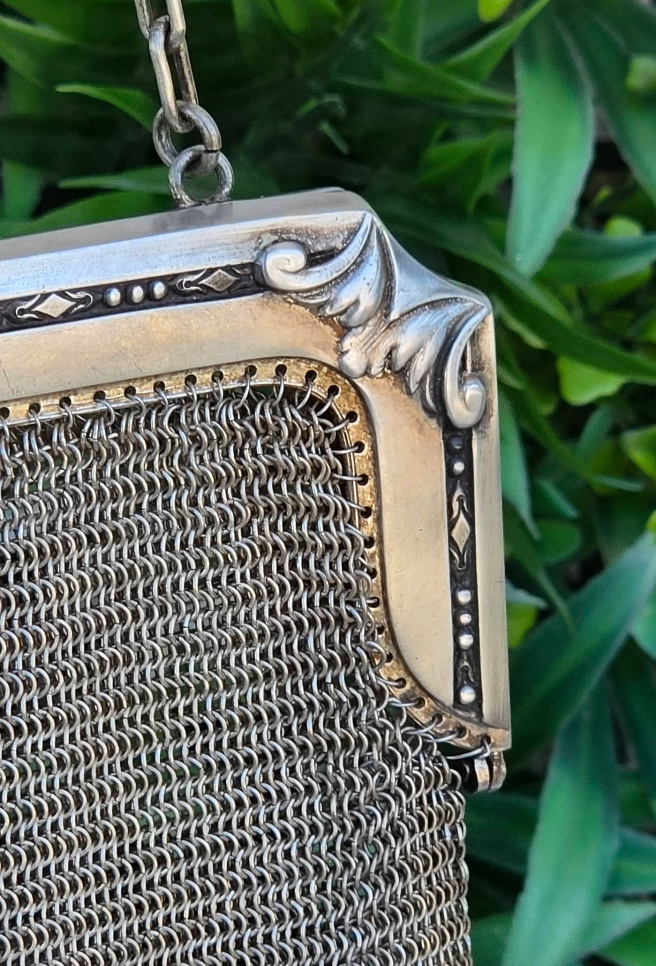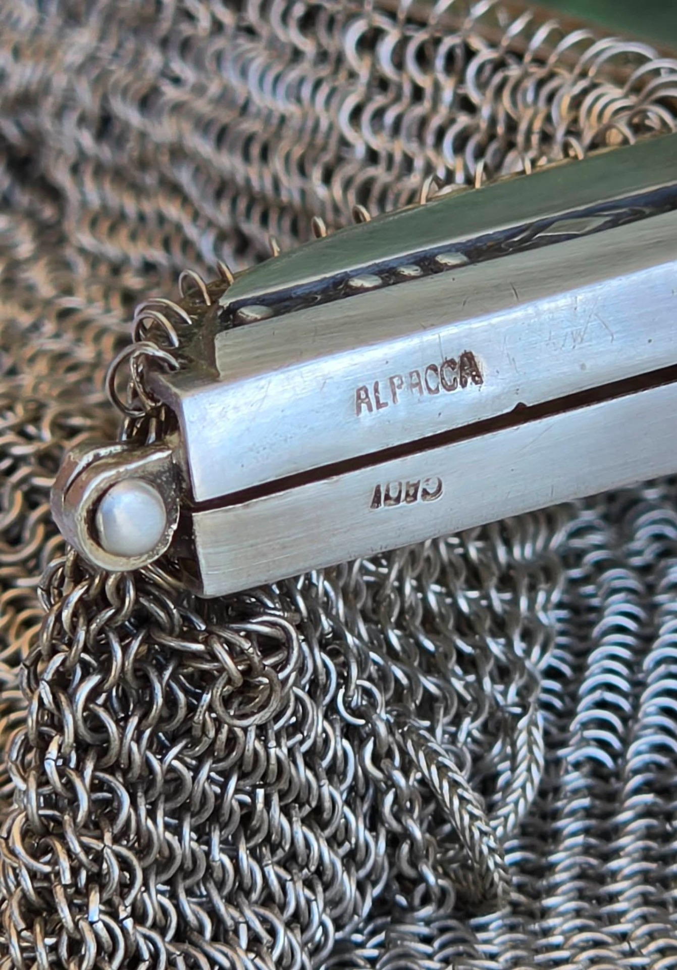 Poșetă "mesh" Art Deco, din alpaca argintată, de colecție, frumos lucrată manual cu zale foarte fine, decorată pe ramă cu motive geometrice caracteristice perioadei, în stare foarte bună (anii 1920-1930, Germania).