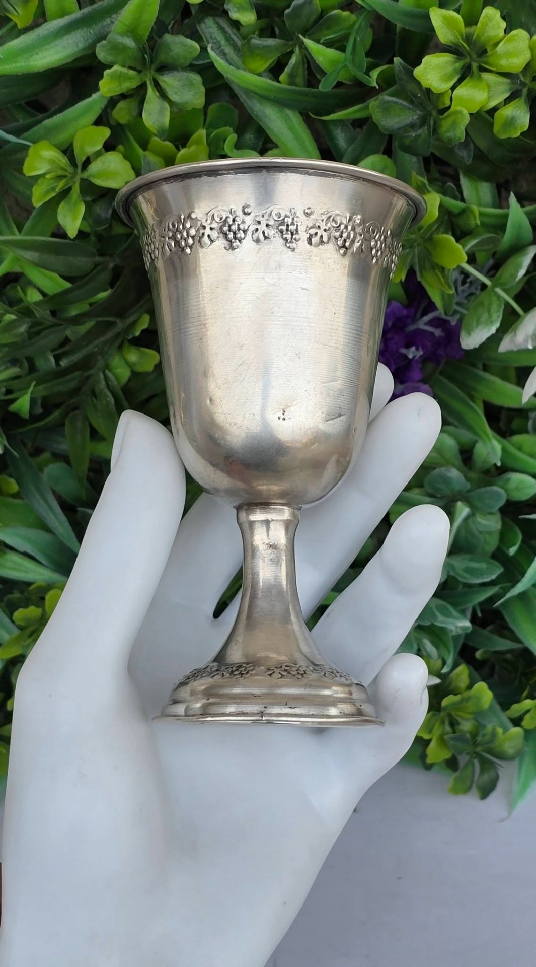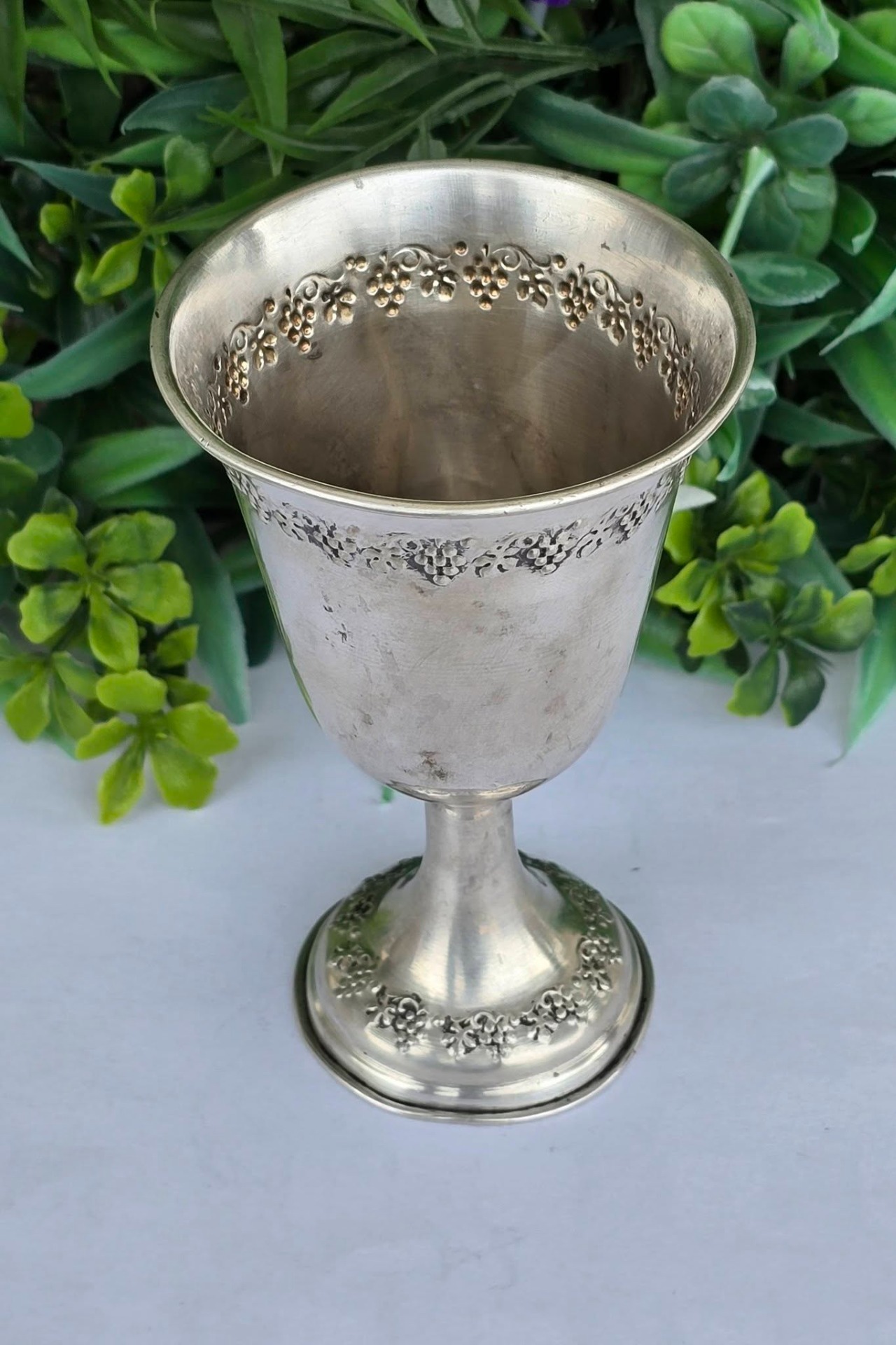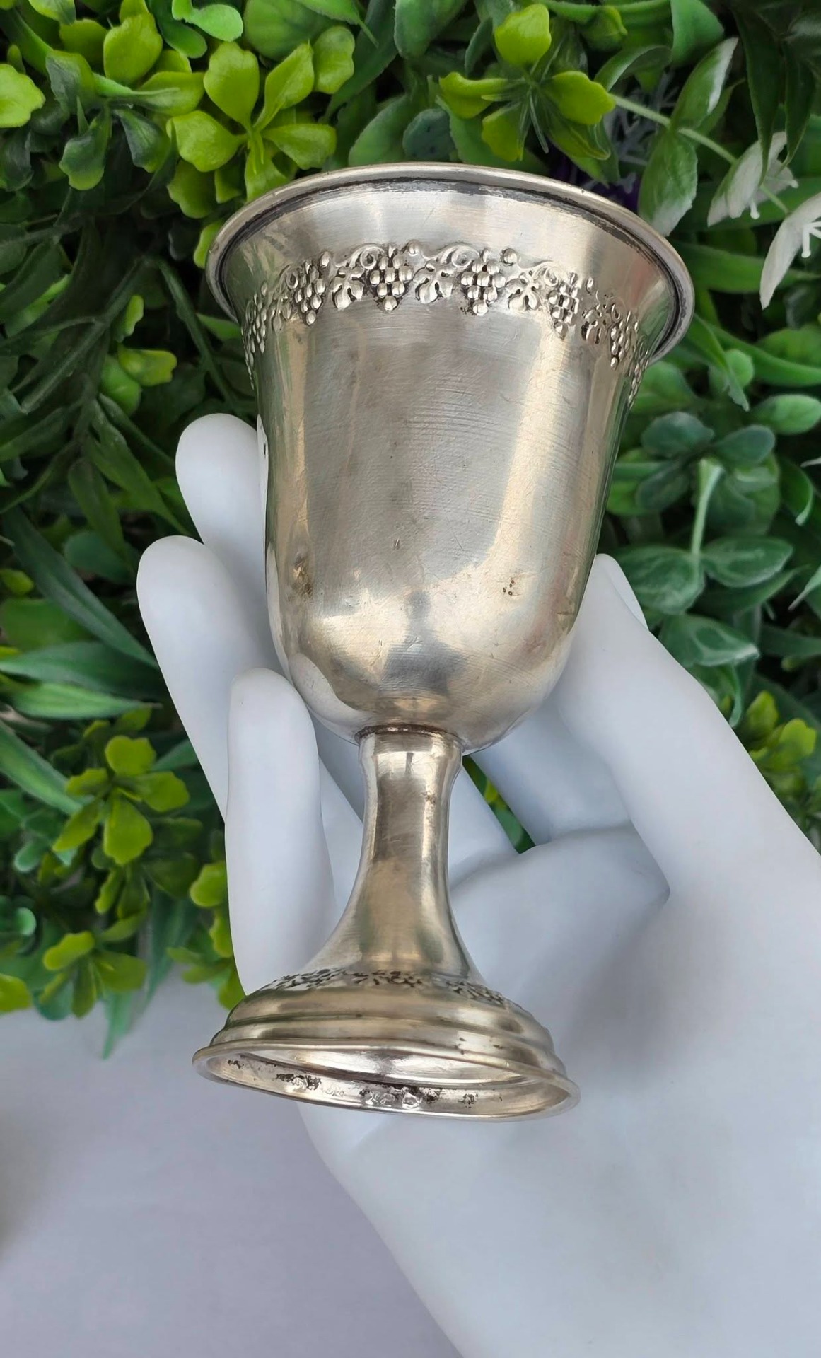 Potir vechi din argint, decorat în motiv viticol, manufactură de atelier italian (încep. sec.XX, Italia).