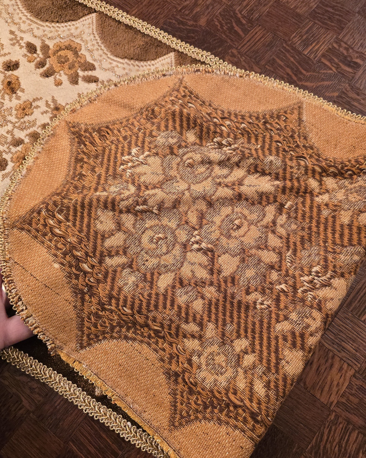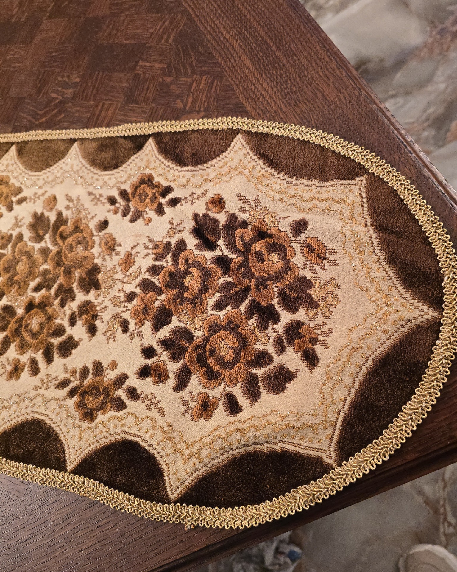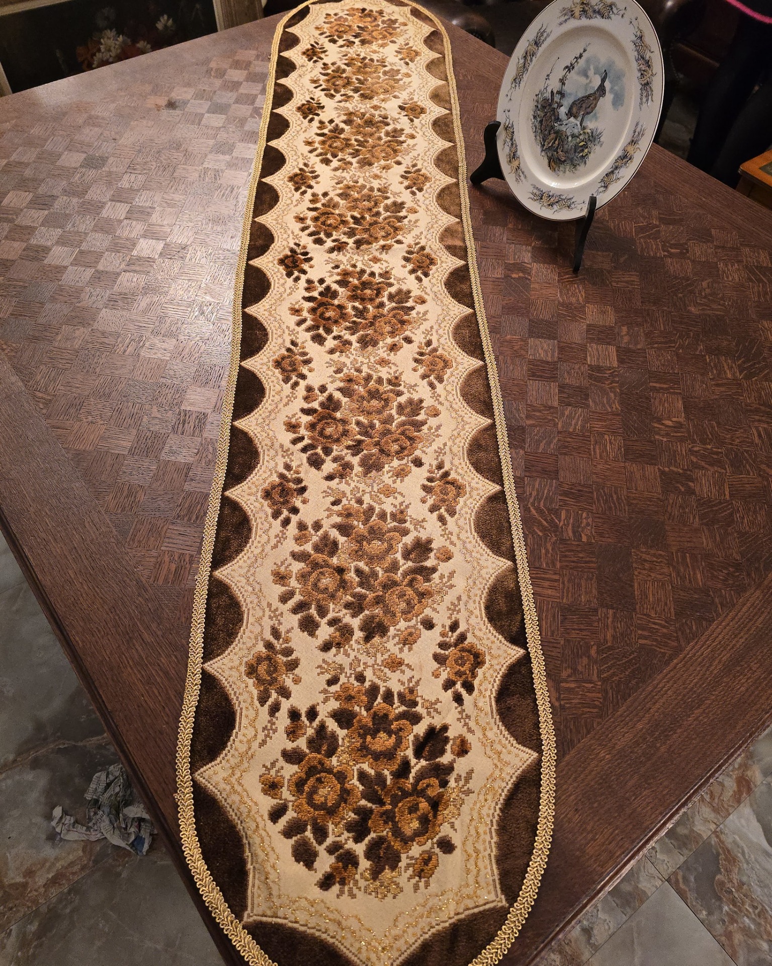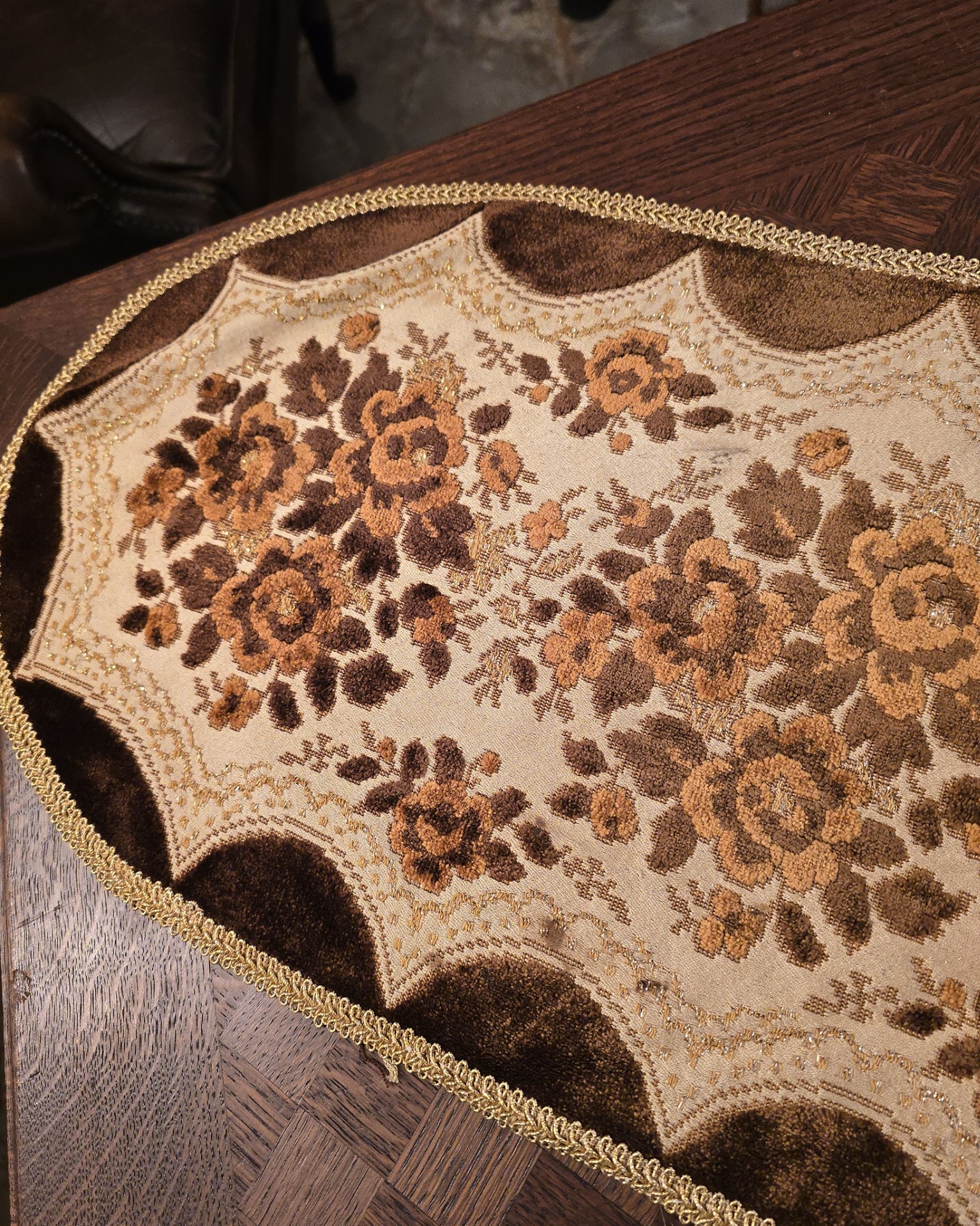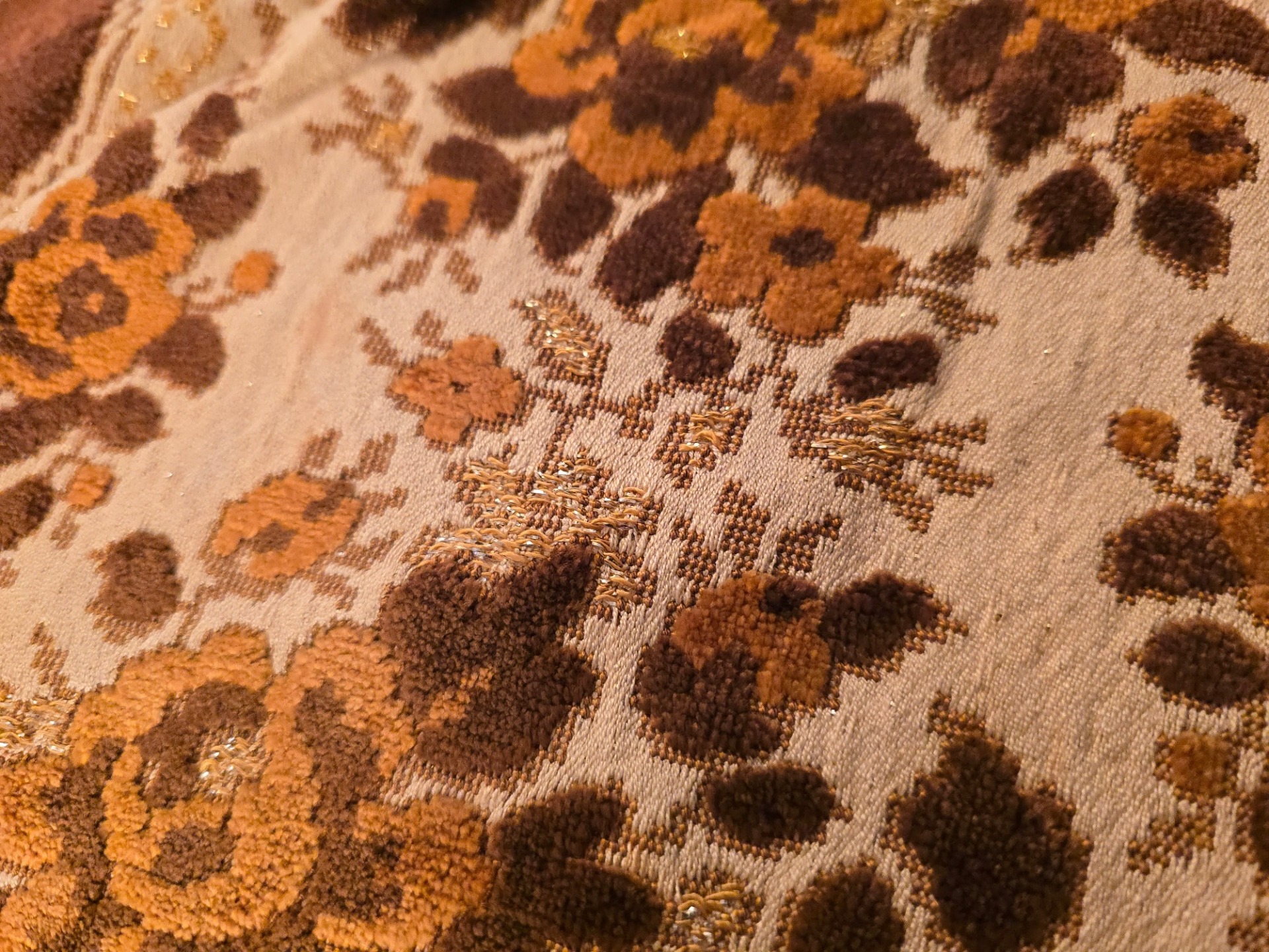 Modelul Central: Modelul floral (trandafiri și frunze) este realizat dintr-un pluș tuns (velur) în nuanțe de maro cu fir auriu (eleganta)