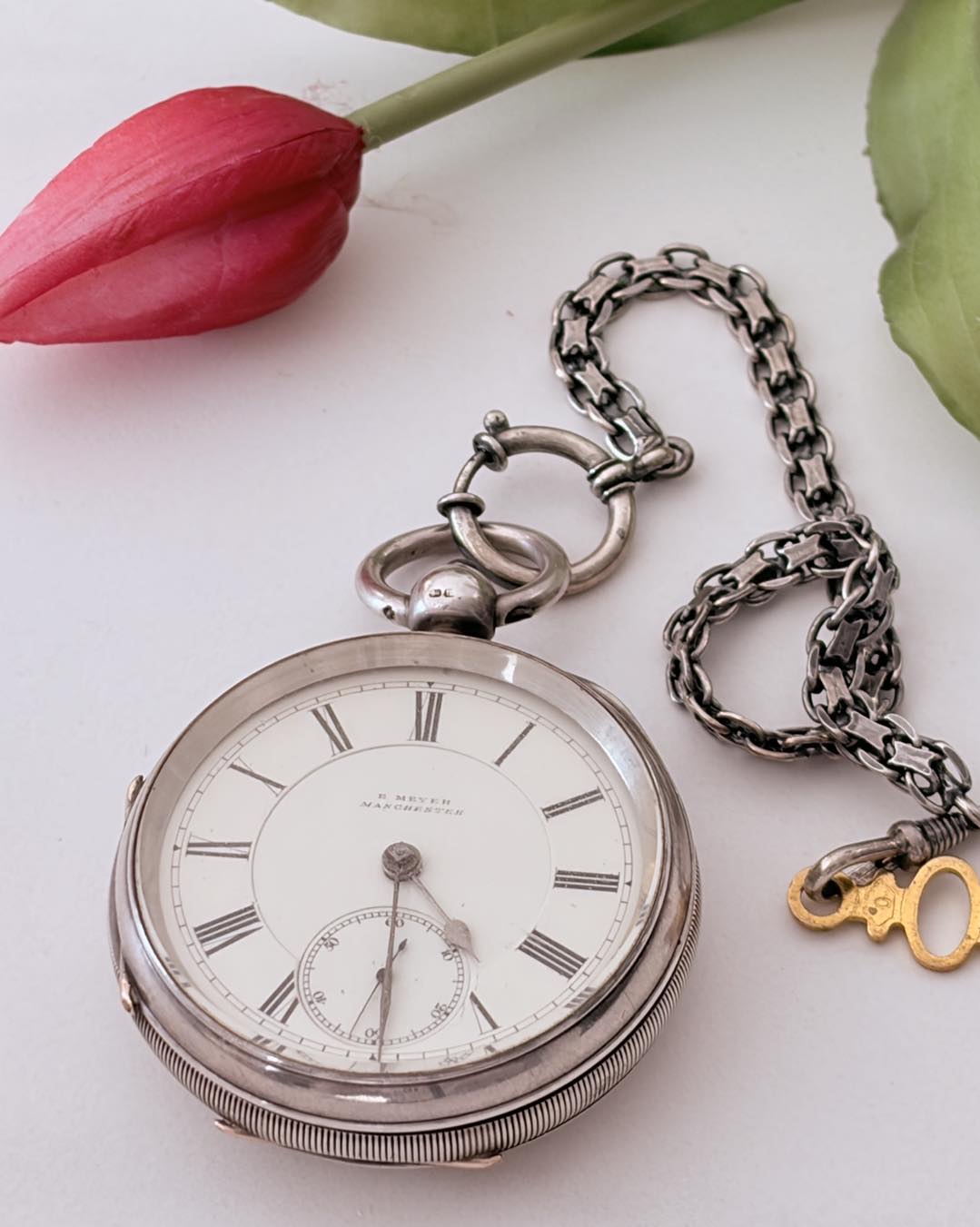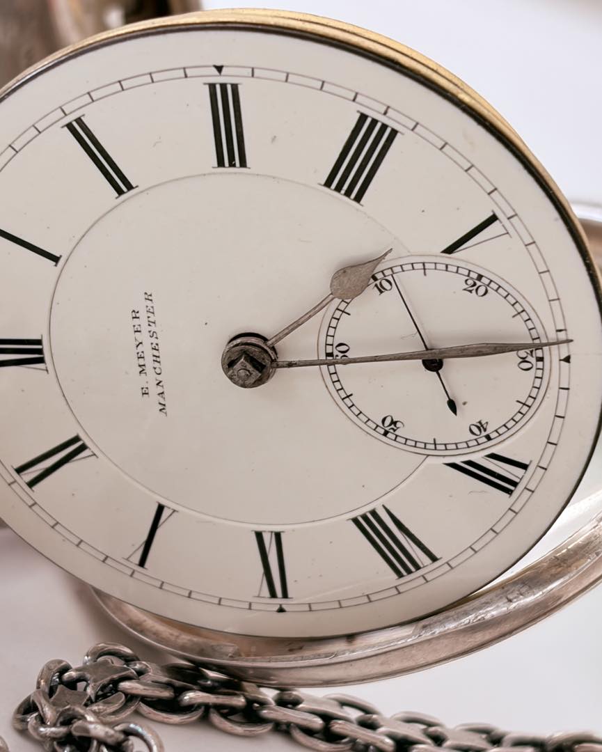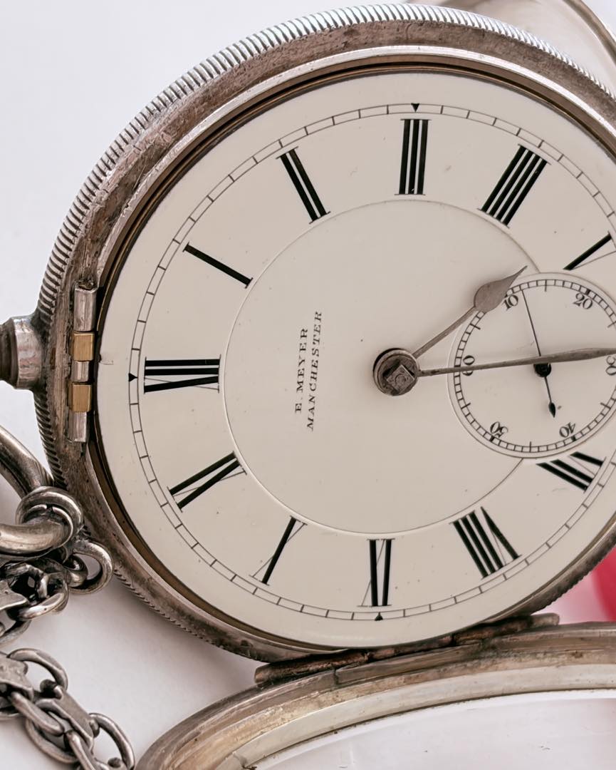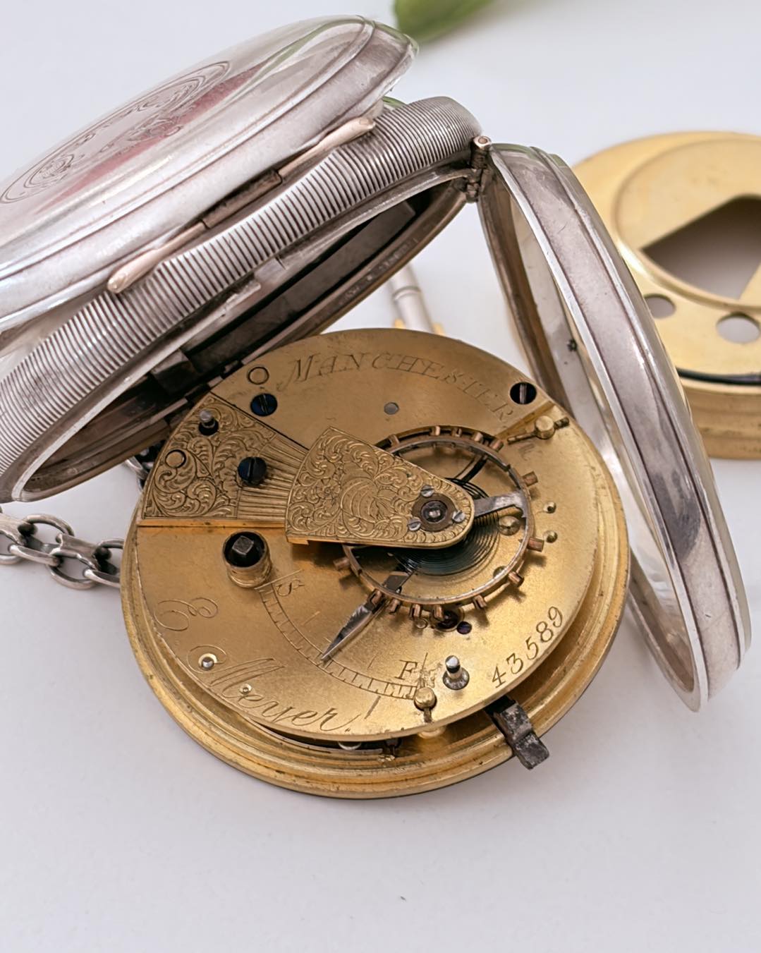 RARE OVERSIZE (60mm) English Silver Fusee Pocket Watch - E. Meyer Manchester - 187g Total - Chester Hallmarks cca 1854